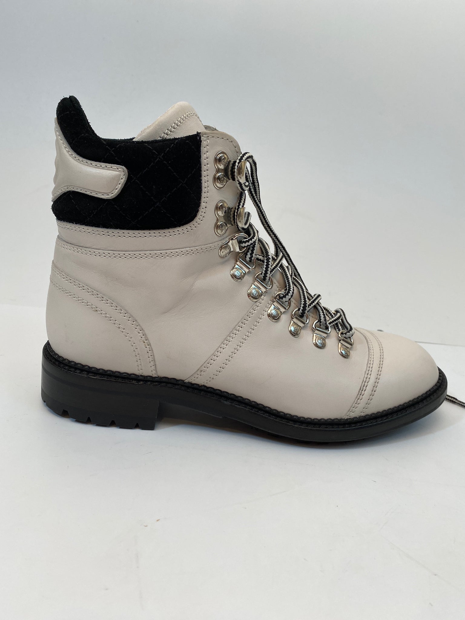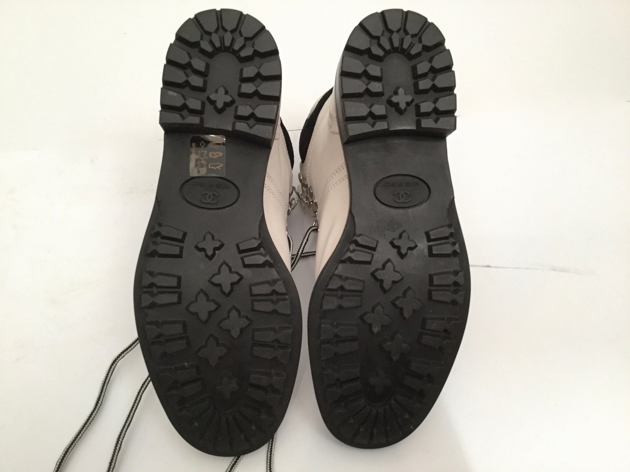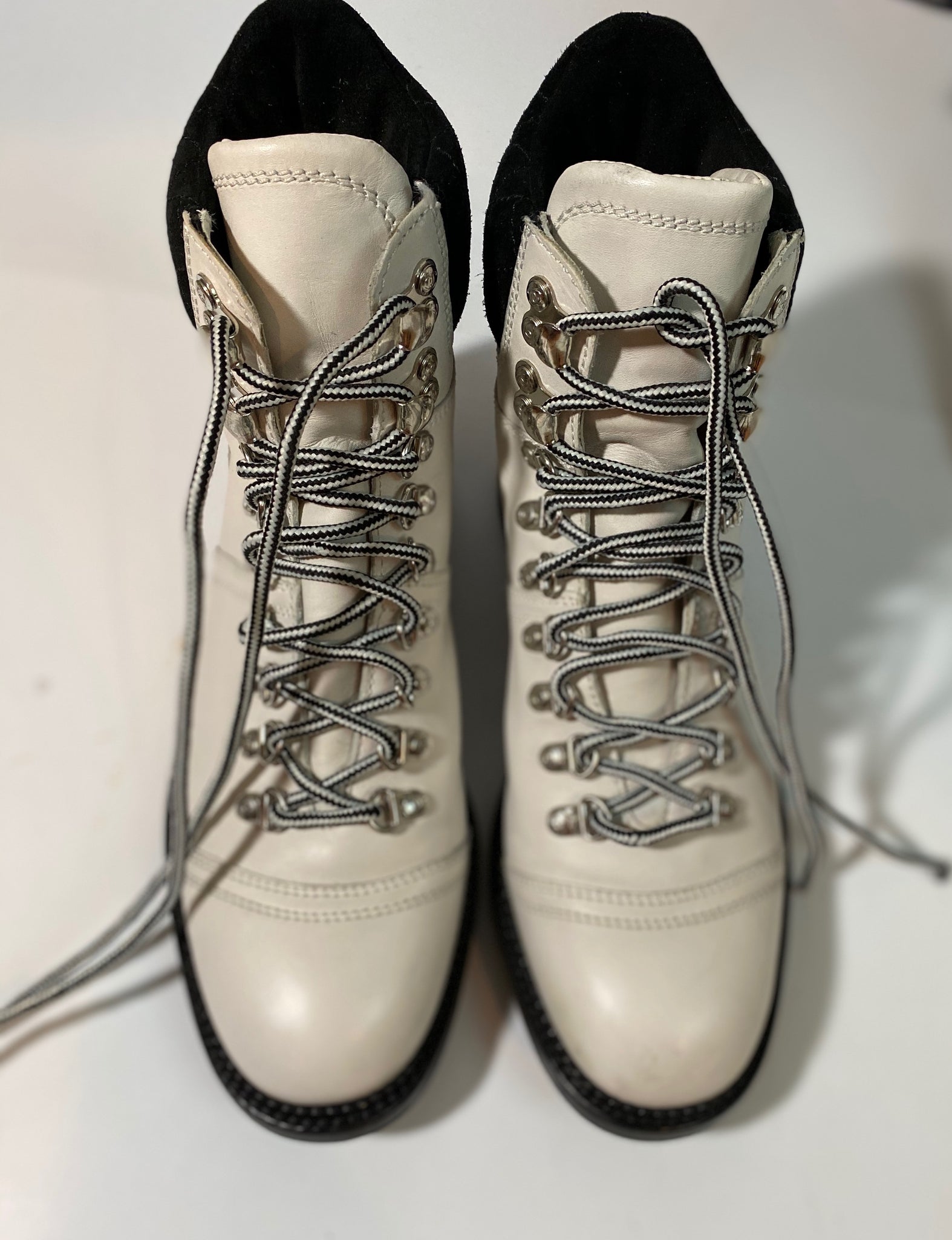 Chanel leather boots. They are white leather with black soles and black suede quilted ankle trim. Each has 22 "CC" logos on the lace-up hooks- a large "CC" logo on the back, and another "CC" logo on the outer sole.