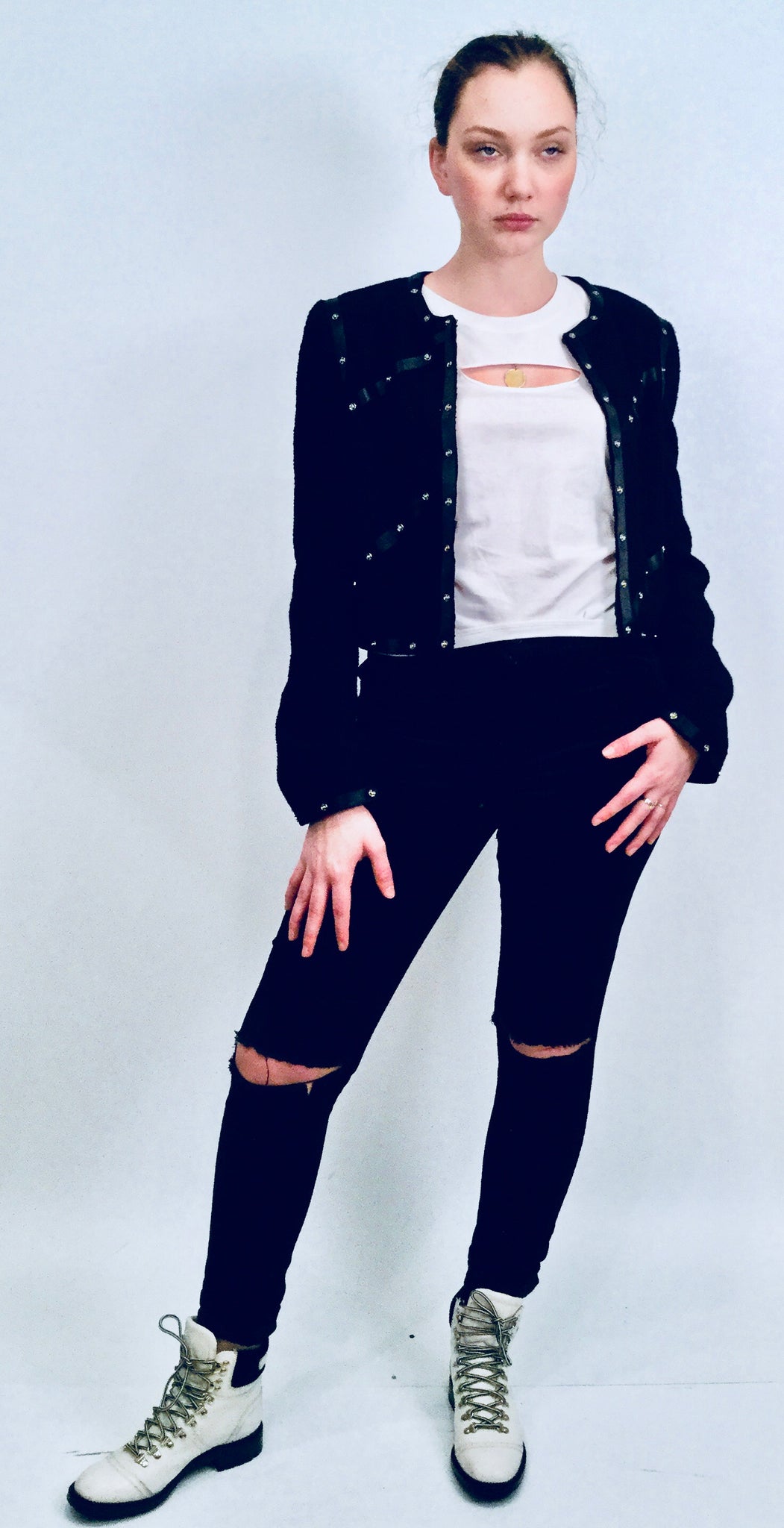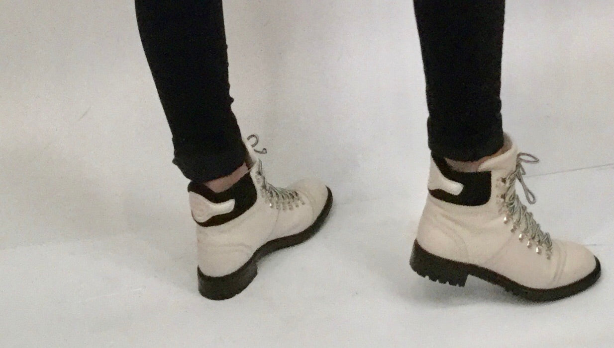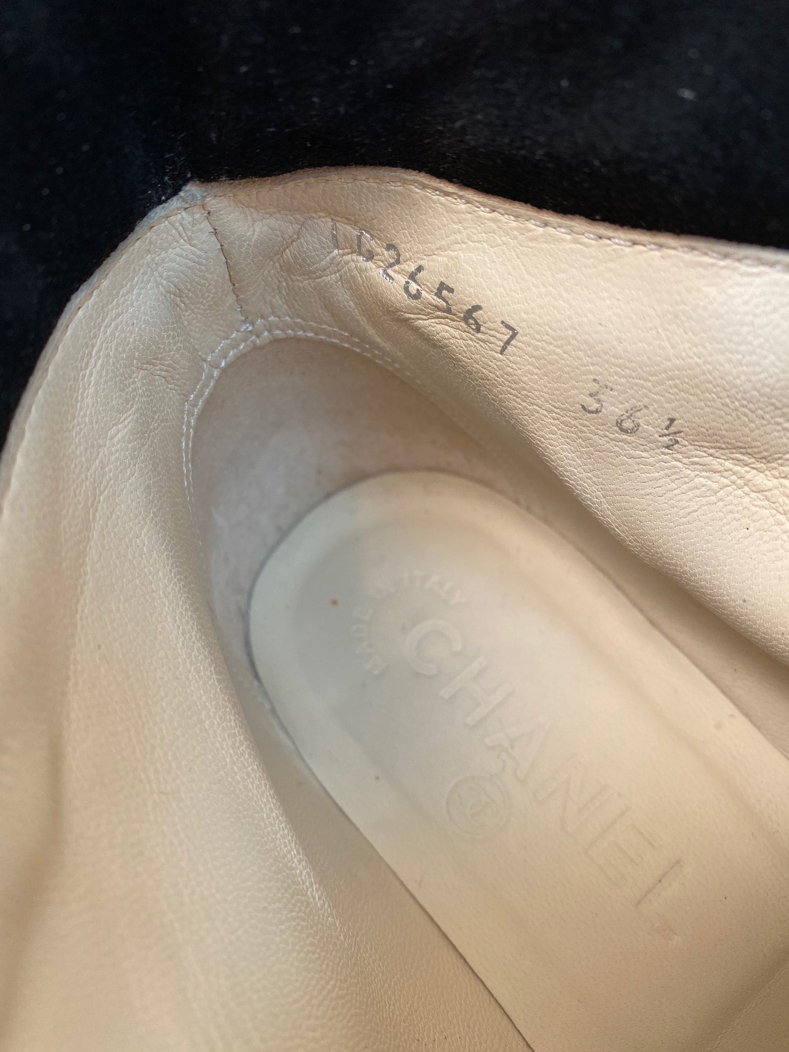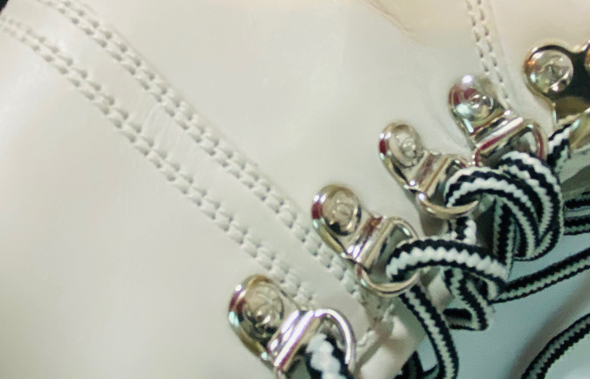 Chanel leather boots. They are white leather with black soles and black suede quilted ankle trim. Each has 22 "CC" logos on the lace-up hooks- a large "CC" logo on the back, and another "CC" logo on the outer sole.