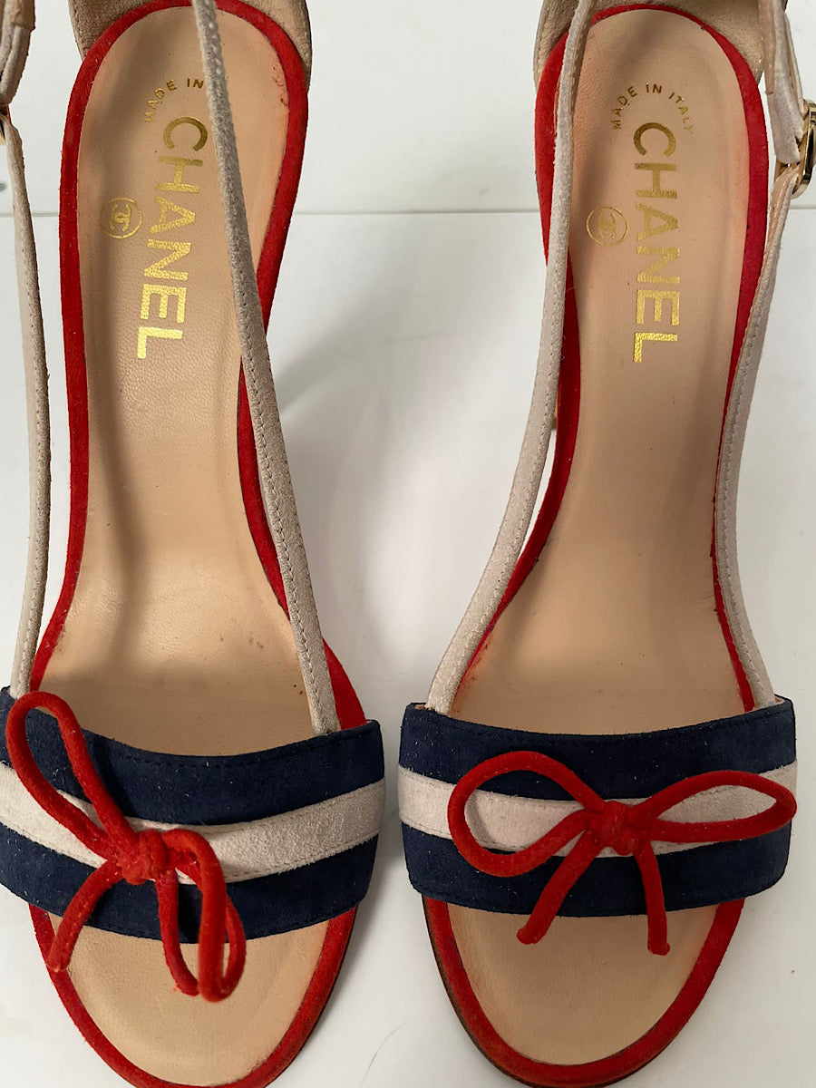Chanel 08C, 2008 Cruise Resort open toe heel sandals in red, white, and blue, cork heels with bands of navy blue suede. These feature a "CC" logo on the back of each shoe. Each strap buckle has " Chanel" engraved on the front.