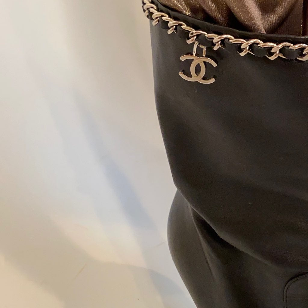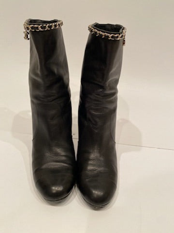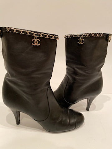 Chanel black mid length calf boots. These are soft leather. Chain around the top on each one and each has the "CC" charm. There is a metal snap at the top of each boot, with the "CC" logo, to make it easier to pull on.