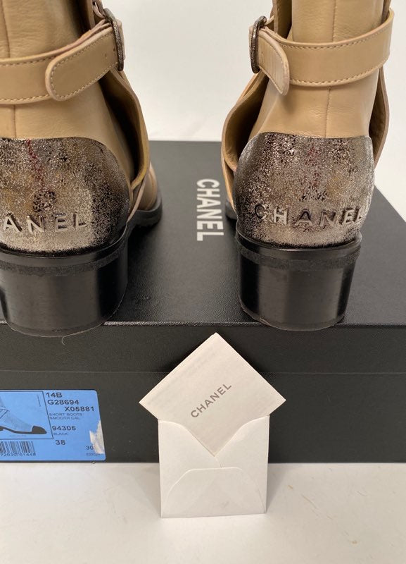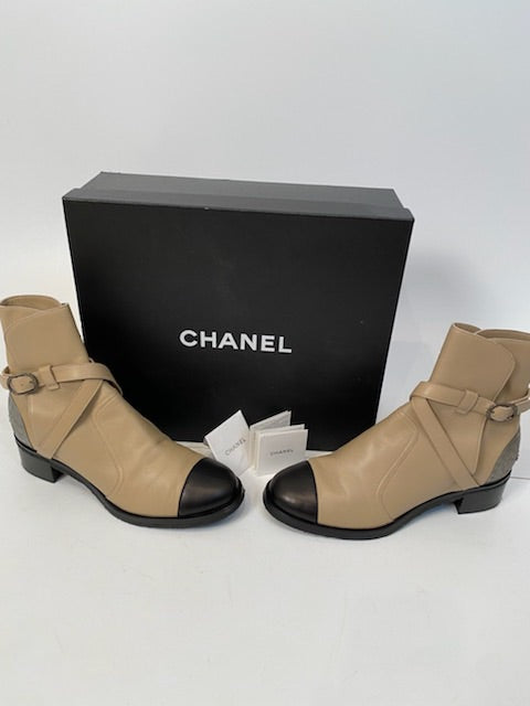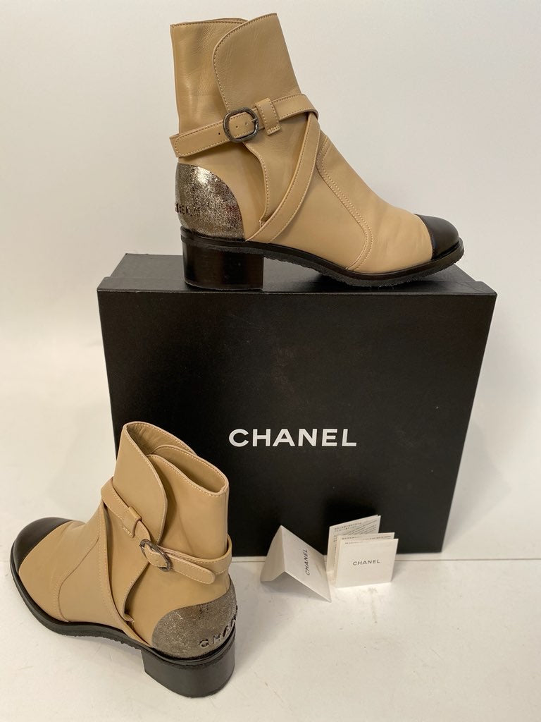 These are beautiful leather Chanel 2014 collection short boots which come with the box the care pamphlet. Large silver metal plate above the heel with raised word “Chanel" across the back. The soles are original textured no-slip rubber with the "CC" logo and the European size on the heel.