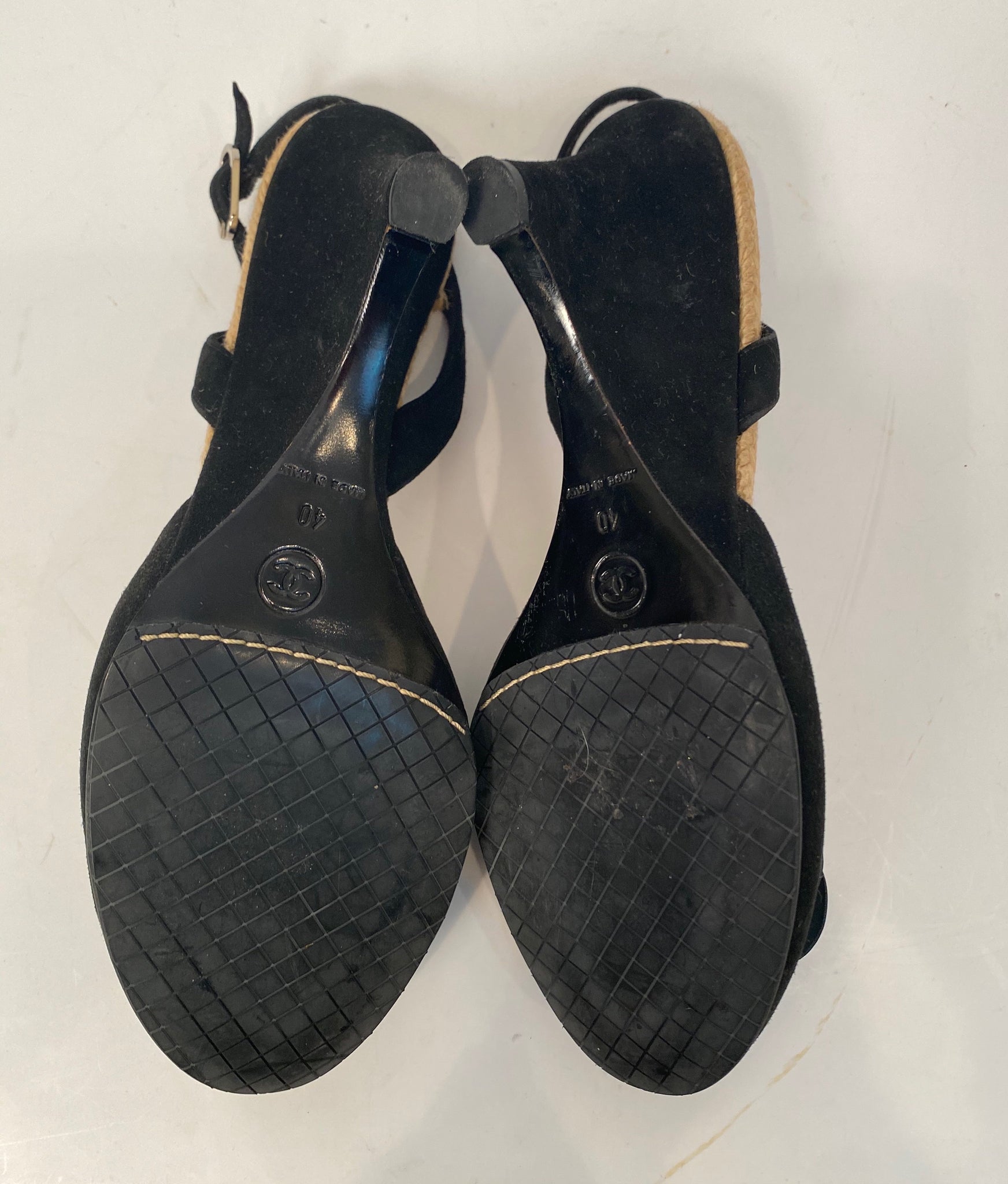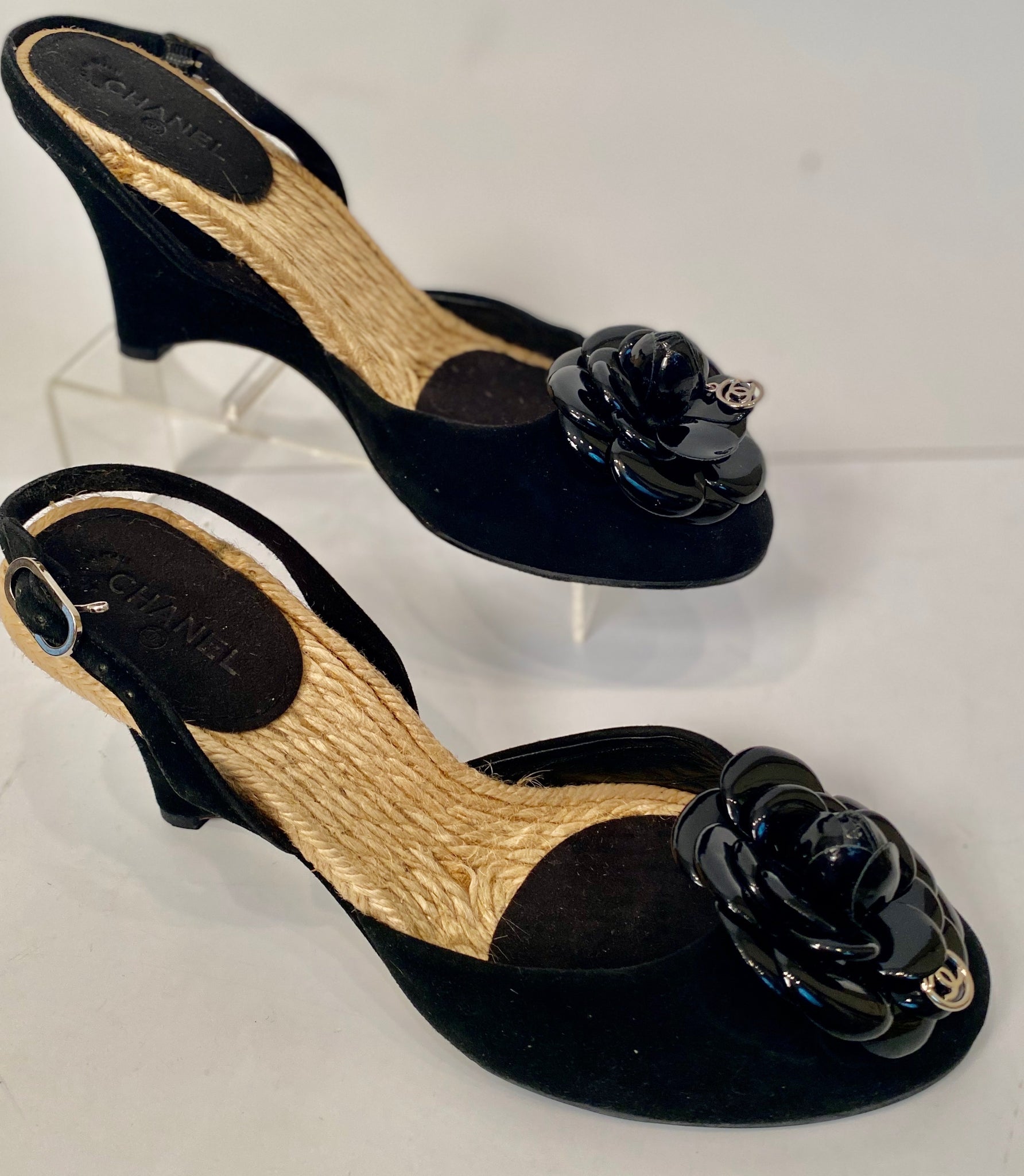 Chanel 06C, 2006 Cruise espadrille wedge with suede and patent leather camellia and metal “CC” logo chained to each. These were also featured in Chanel’s 2006 catalog.
