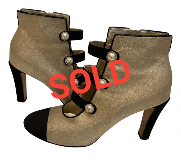 Chanel 2018 muted gold sparkle leather with black trim ankle boot bootie heels. The front has 3 black straps with a pearl at each end, one of the pearls on each shoe has a raised gold CC logo. Use the side zipper to put them on. These shoes look great with or without socks.
