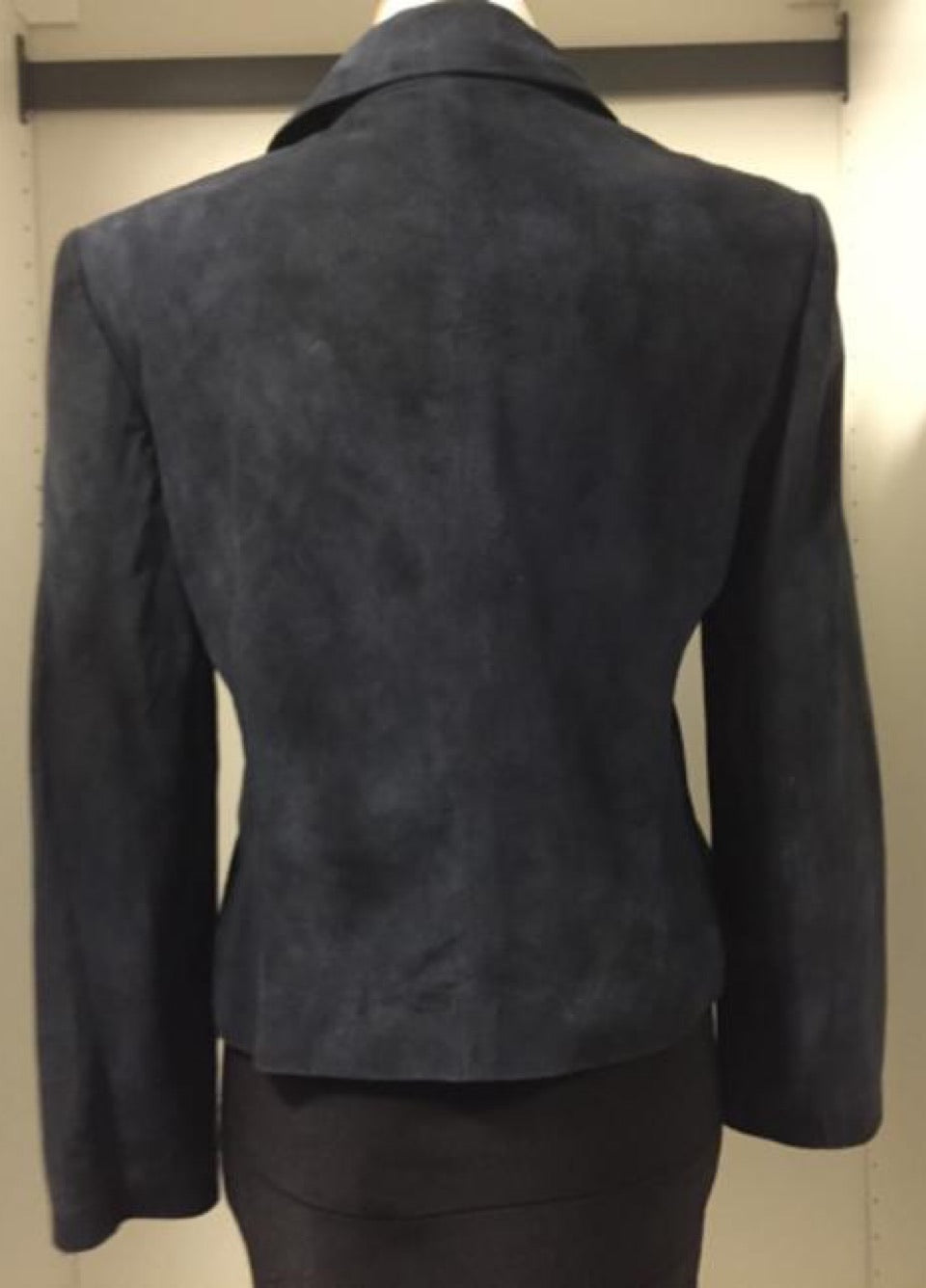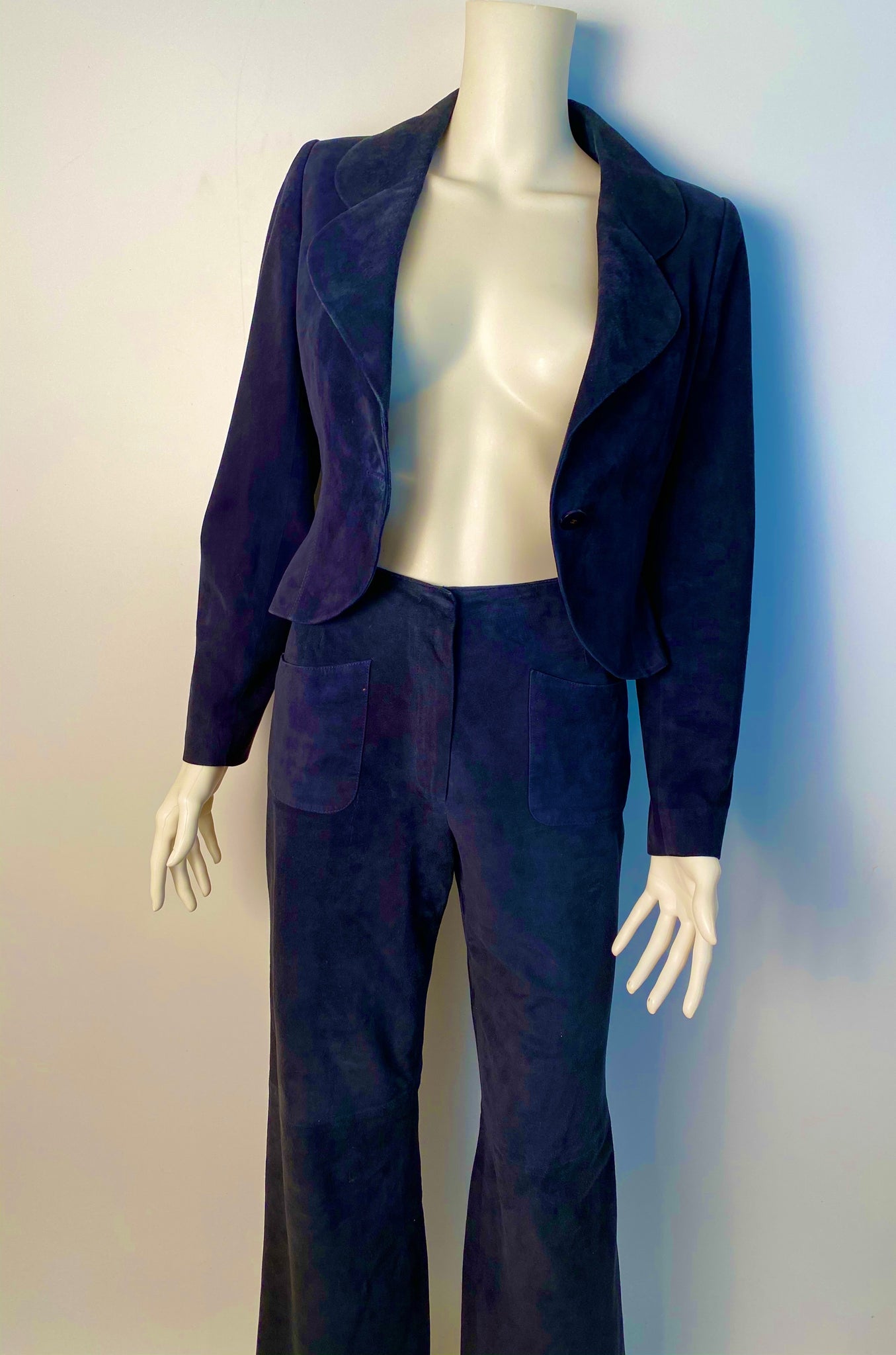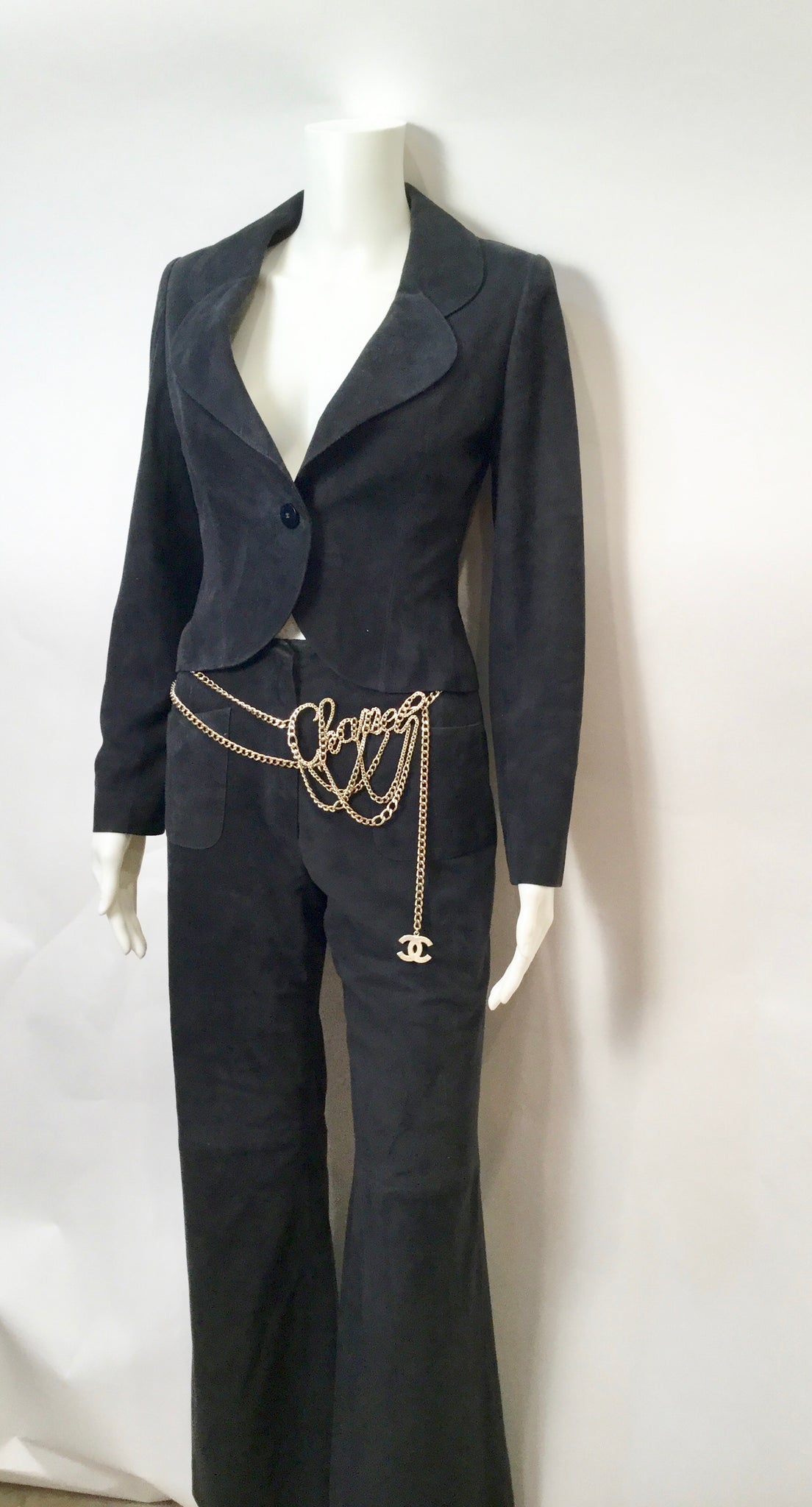 Rare vintage Chanel 02C 2002 Cruise Resort 2 piece Set. Lightweight Suede gray/navy blue color Jacket and Pants Set. Jacket is short, one button (black with gold "CC") closure. The pants have a front zip, 2 pockets on front, straight legs, rectangle at the waist with the word "Chanel" in gold.