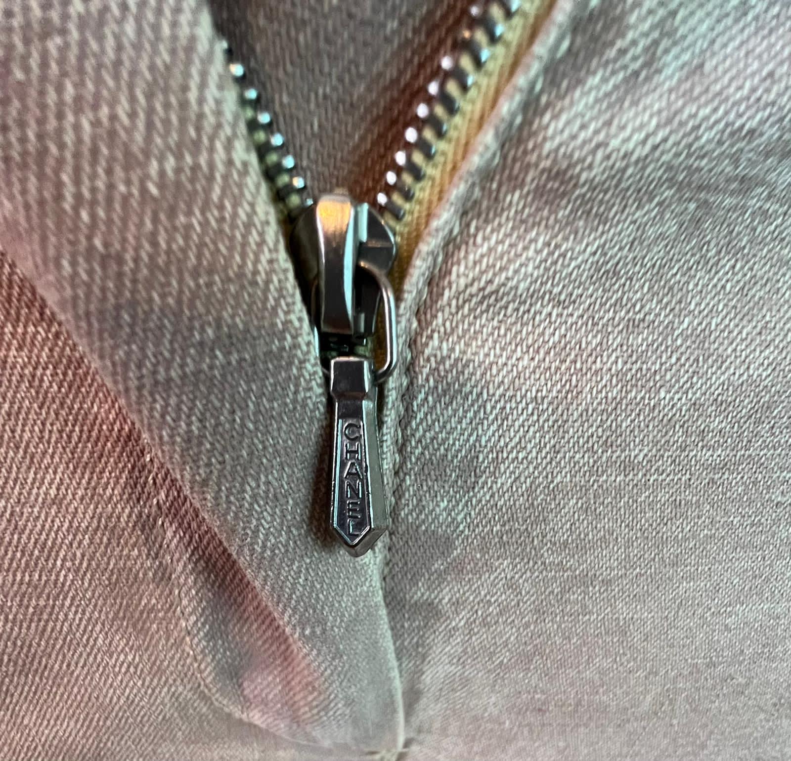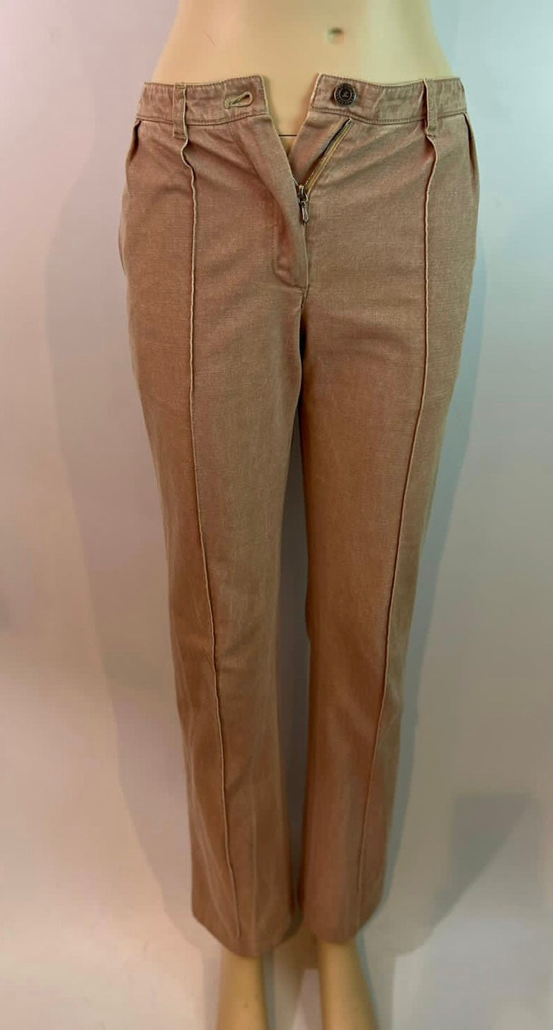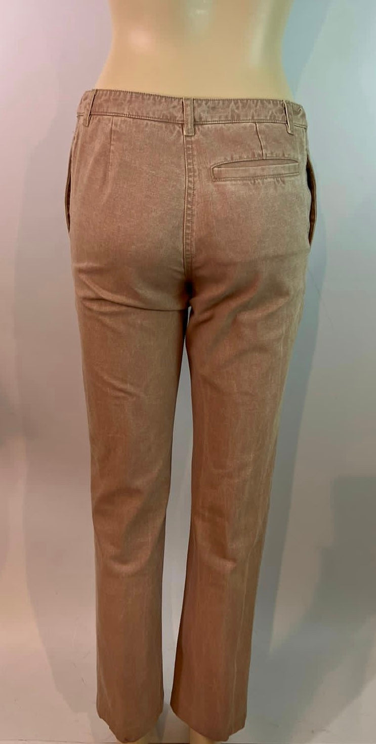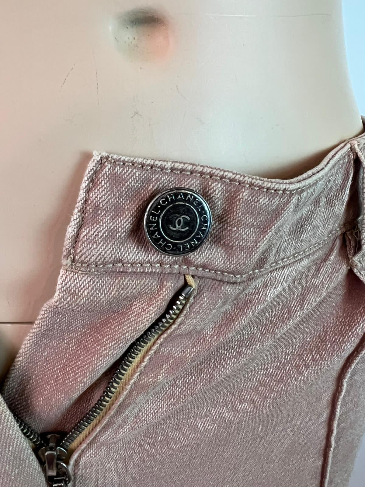 Chanel Faded Light Brown Jeans. This pair of jeans has hidden side pockets, fly front, sewn down pleats on the legs, and top-stitched seams. The zipper pull says "Chanel". The button at the waist and has a CC in the center with the word "Chanel” 3 times around the outside. It has a slash pocket on the right side in the back and fitted legs.