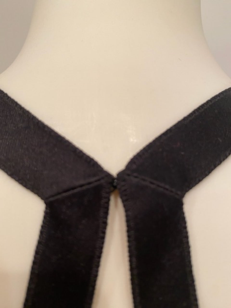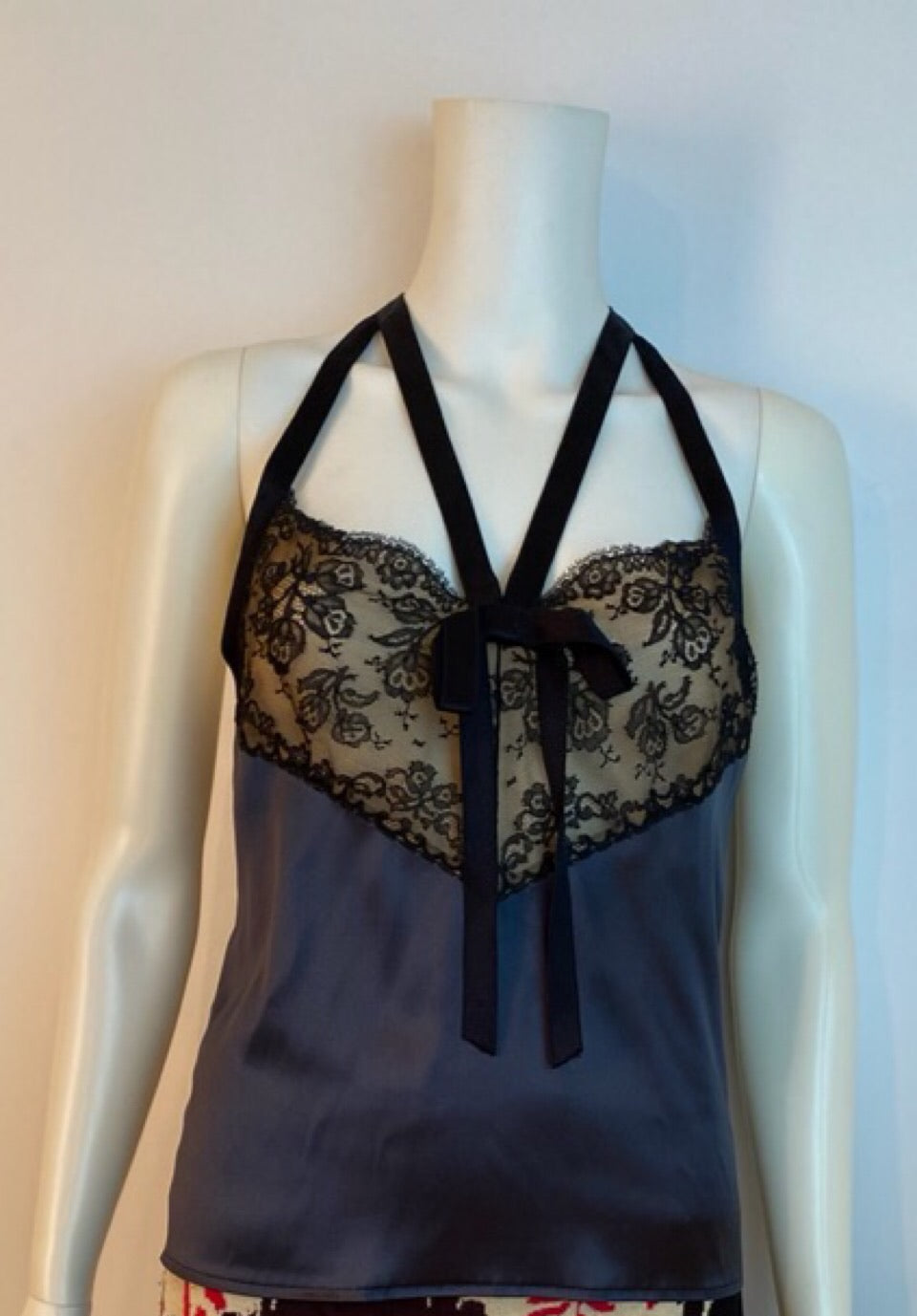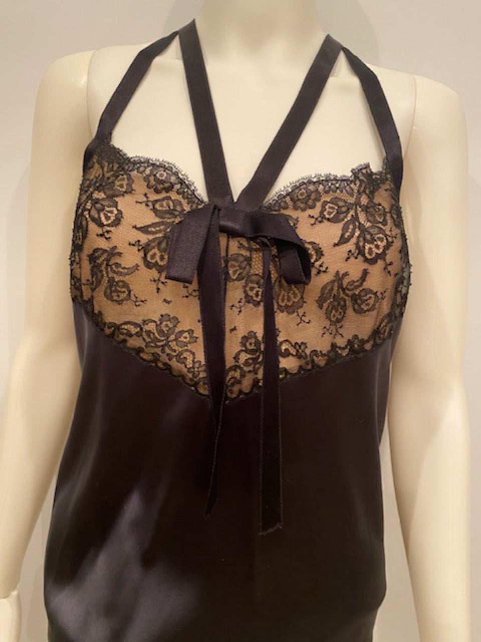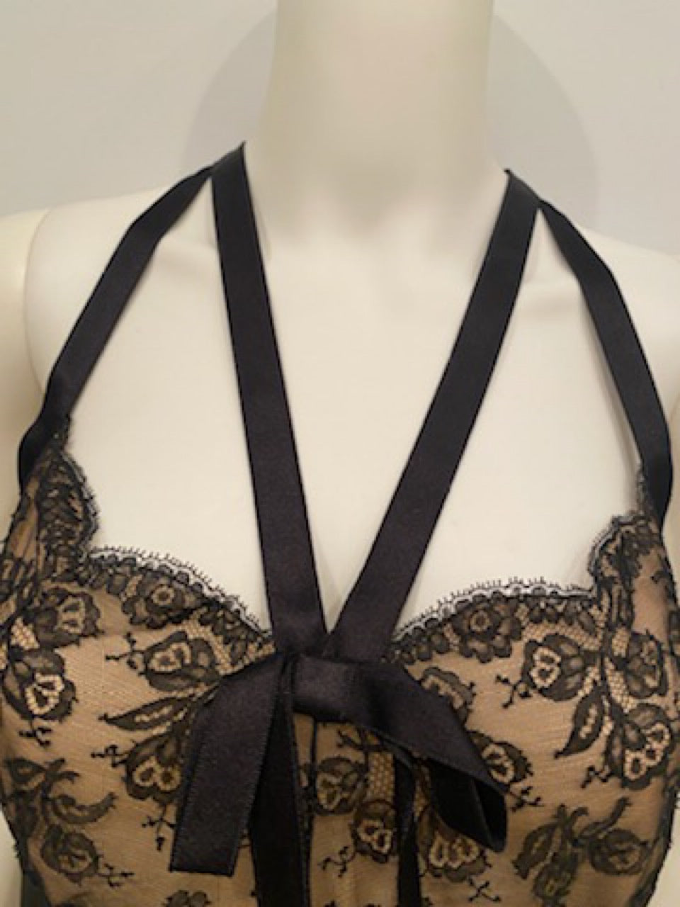 Features 4 back buttons in black with CC in black crystals. The top half of the back is satin ribbon, forming a razorback, connected by a hook and eye. The bust is black lace over sheer beige. The lace covers the bust and that area is lined. Notice the attractive and unusual configuration of the satin straps front and back.