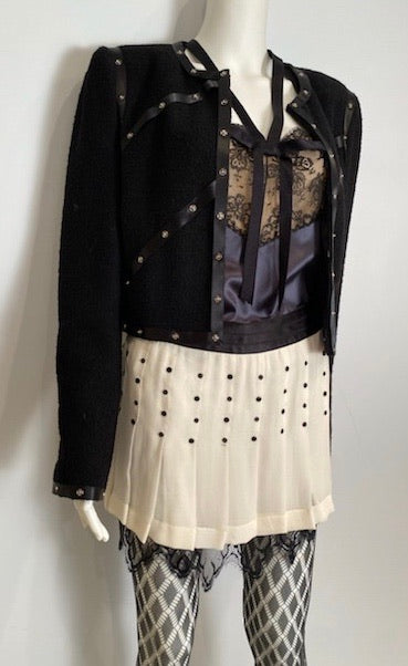 Shown with a Chanel Snaps collection jacket, Chanel tights, and Chanel mini skirt. See them all in their respective categories on this site.