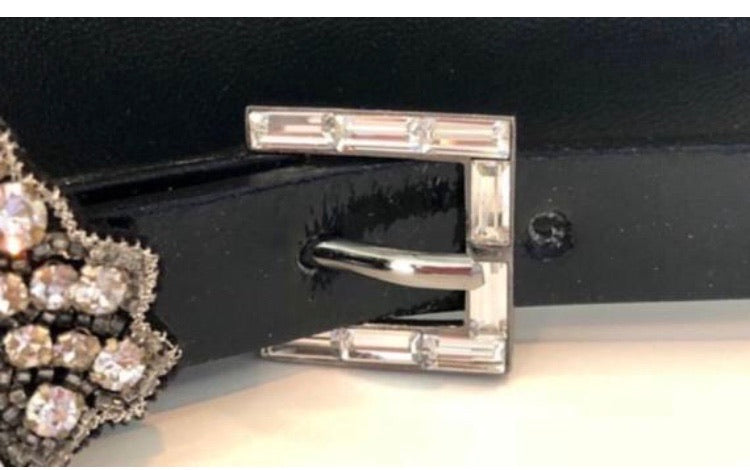 Jeweled buckle measures 2 1/4” across and 1 1/4” up and down