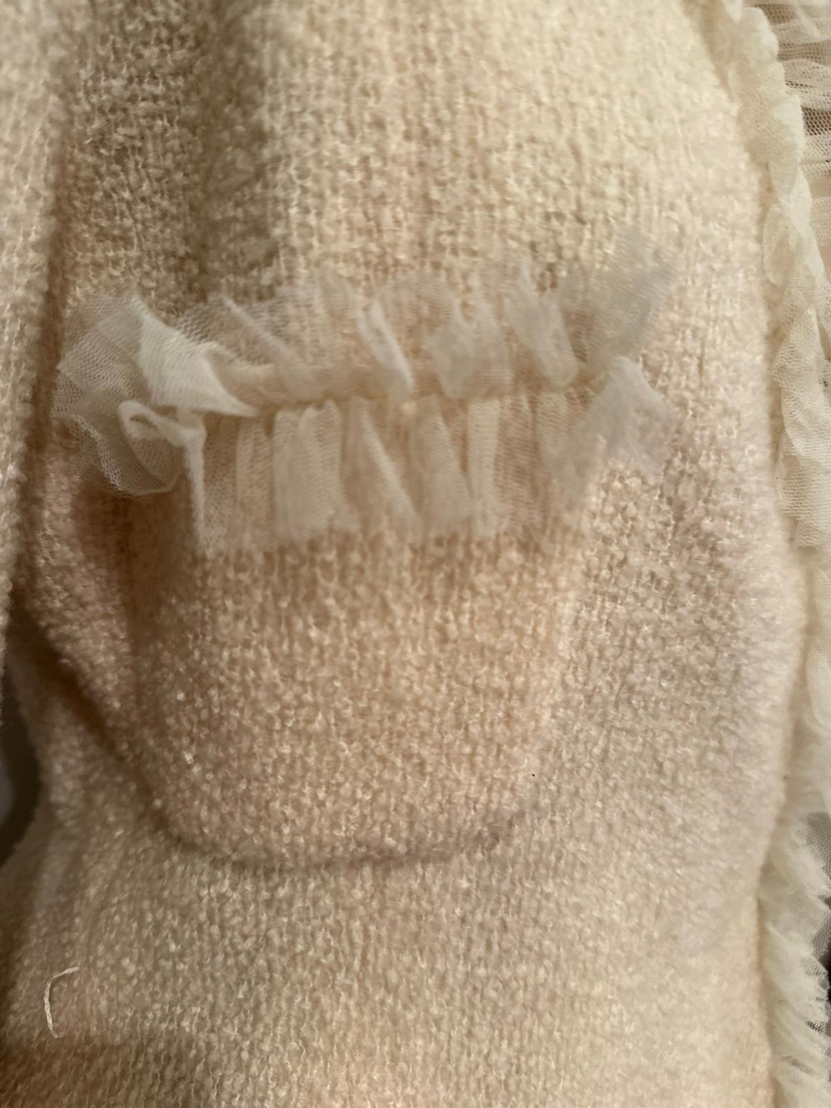This jacket is very rarely seen on the secondary market. It is ivory color with crossover closure with a matching grosgrain belt. Light/ medium weight with a fabulous geometric placement of row after row of voile ruffles. It Is also laced at the picket openings, wrists, and half of the back. Fastens with invisible snaps. Can be worn with or without the matching ribbon.