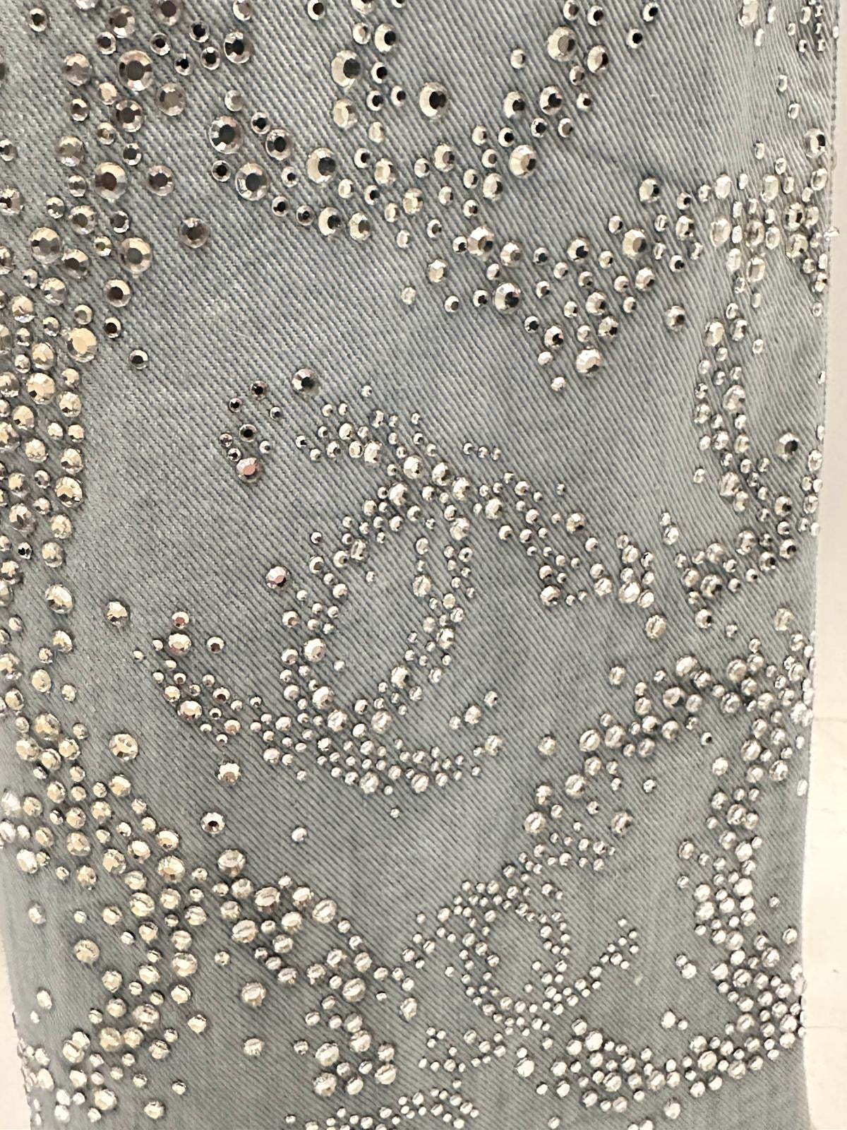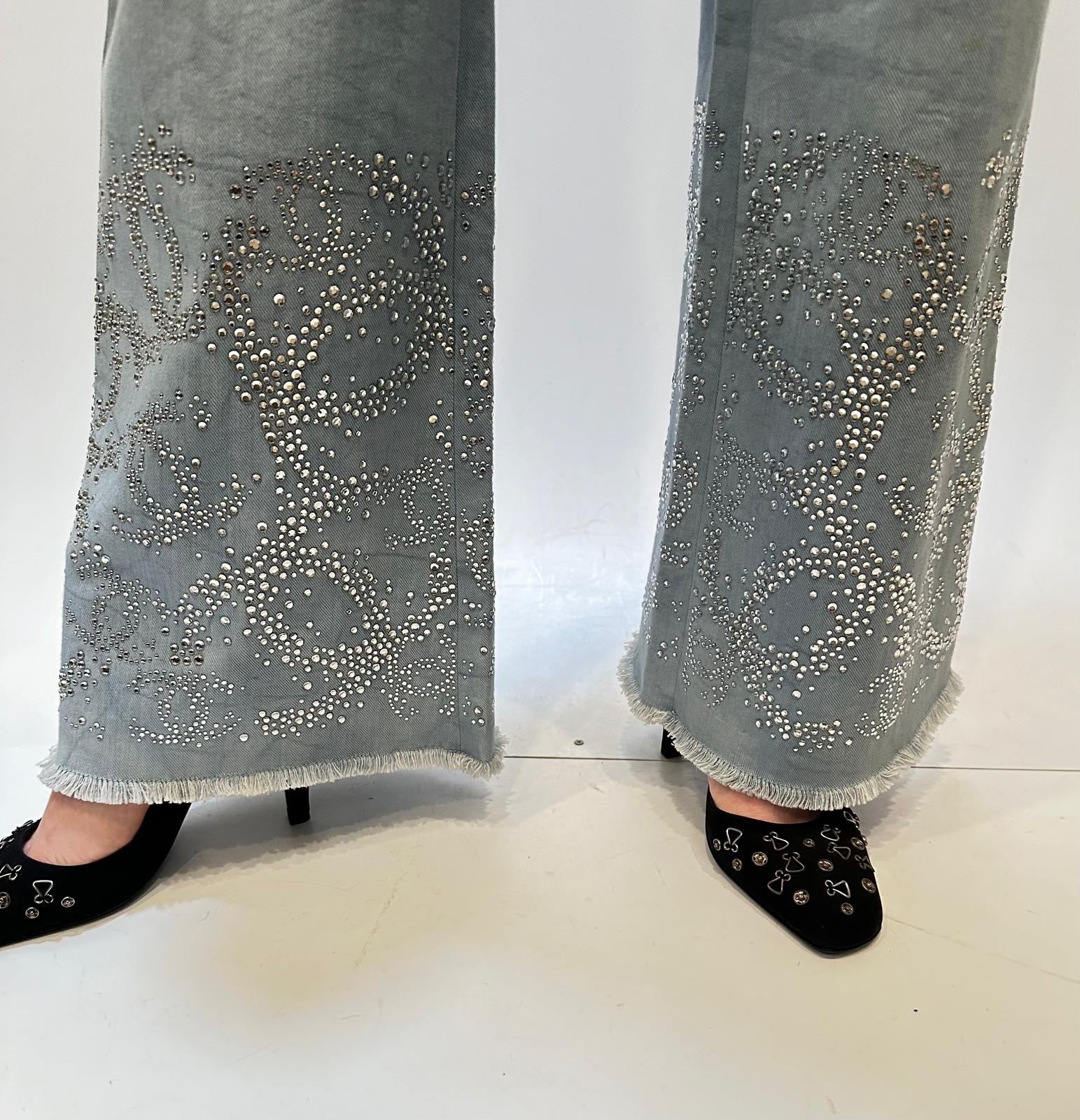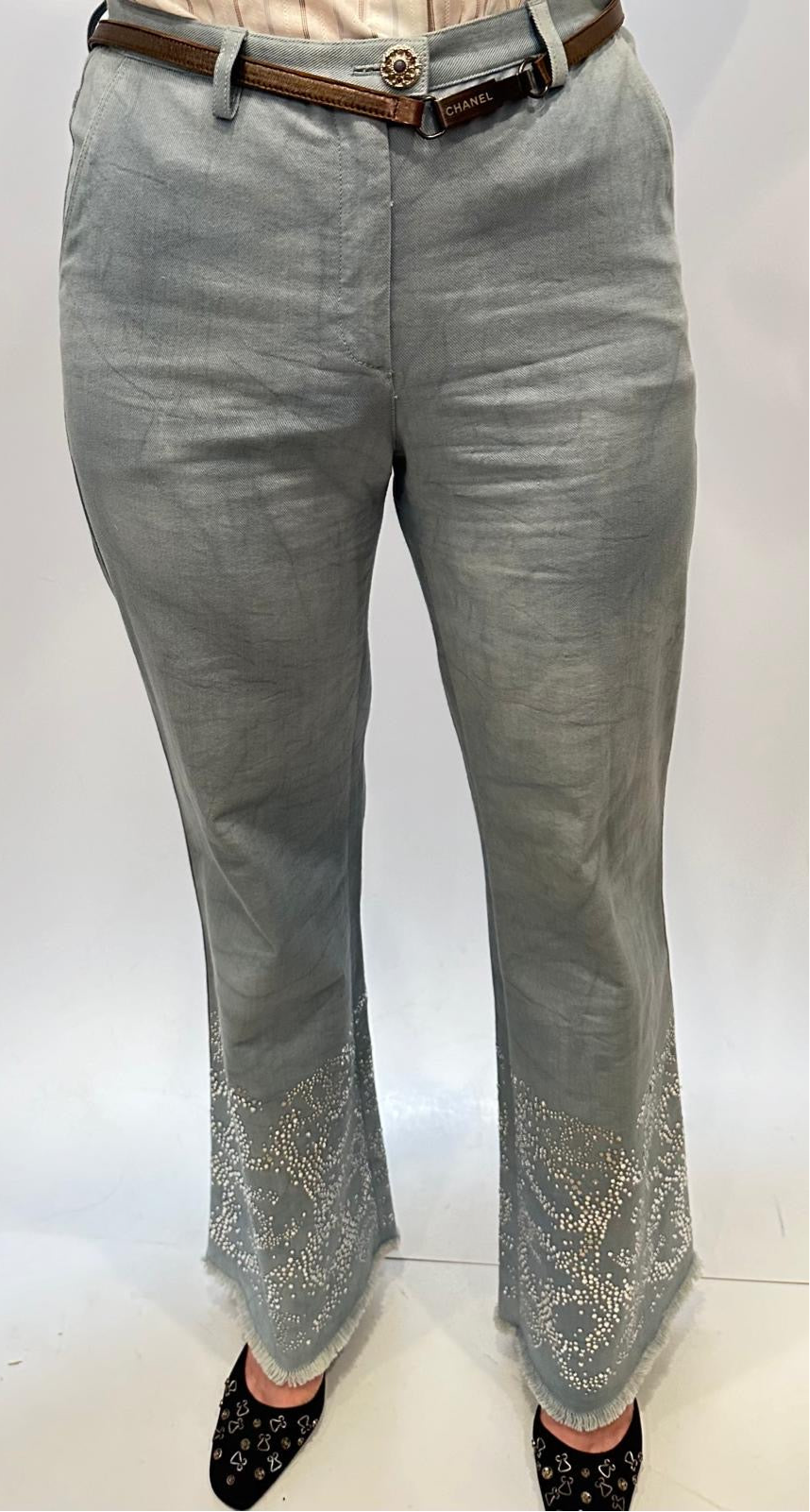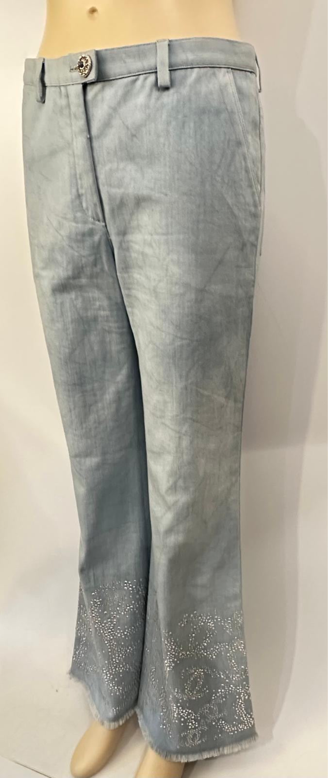 These Chanel jeans are amazing and excellent condition. They are light blue pre-washed denim with a fly front zipper pull that has the CC logo. There are crystal logos which range from 2"-4" across and there are plenty of them. The crystal CC logo embellishments are on the last 11” of the wide bell bottom legs, low waist, short 1/2" fringe on the bottom.