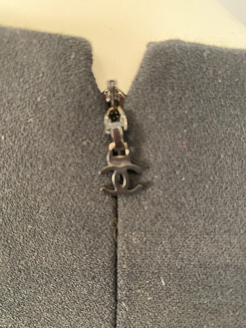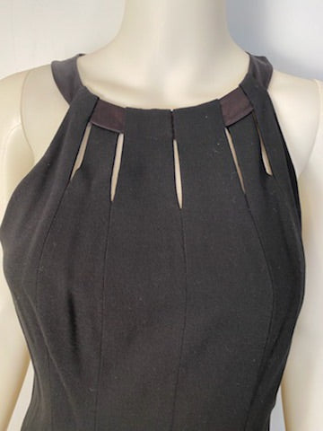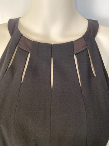 Chanel 11A, 2011 Fall Winter Collection sleeveless Halter Pleated Black dress with keyhole slits around the neckline, front and back, spaced around a satin band. It zips up the back with a hidden zipper, the zipper pull is a small metal “CC” logo. Fully lined with Chanel silk.