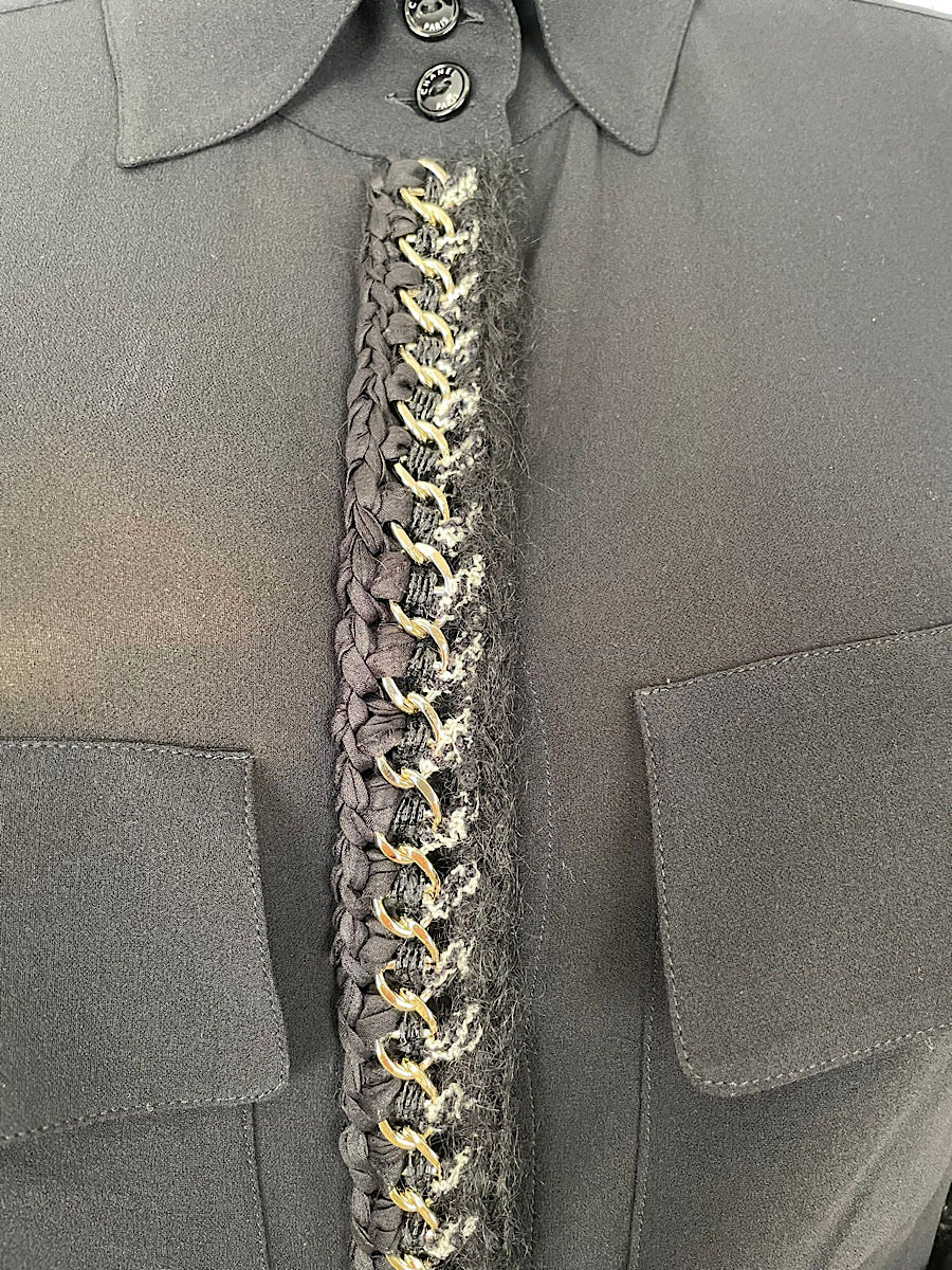 Black Chanel silk top with gold tone chain link with tweed trim, small black bugle beads, and braided silk at front and sleeves.