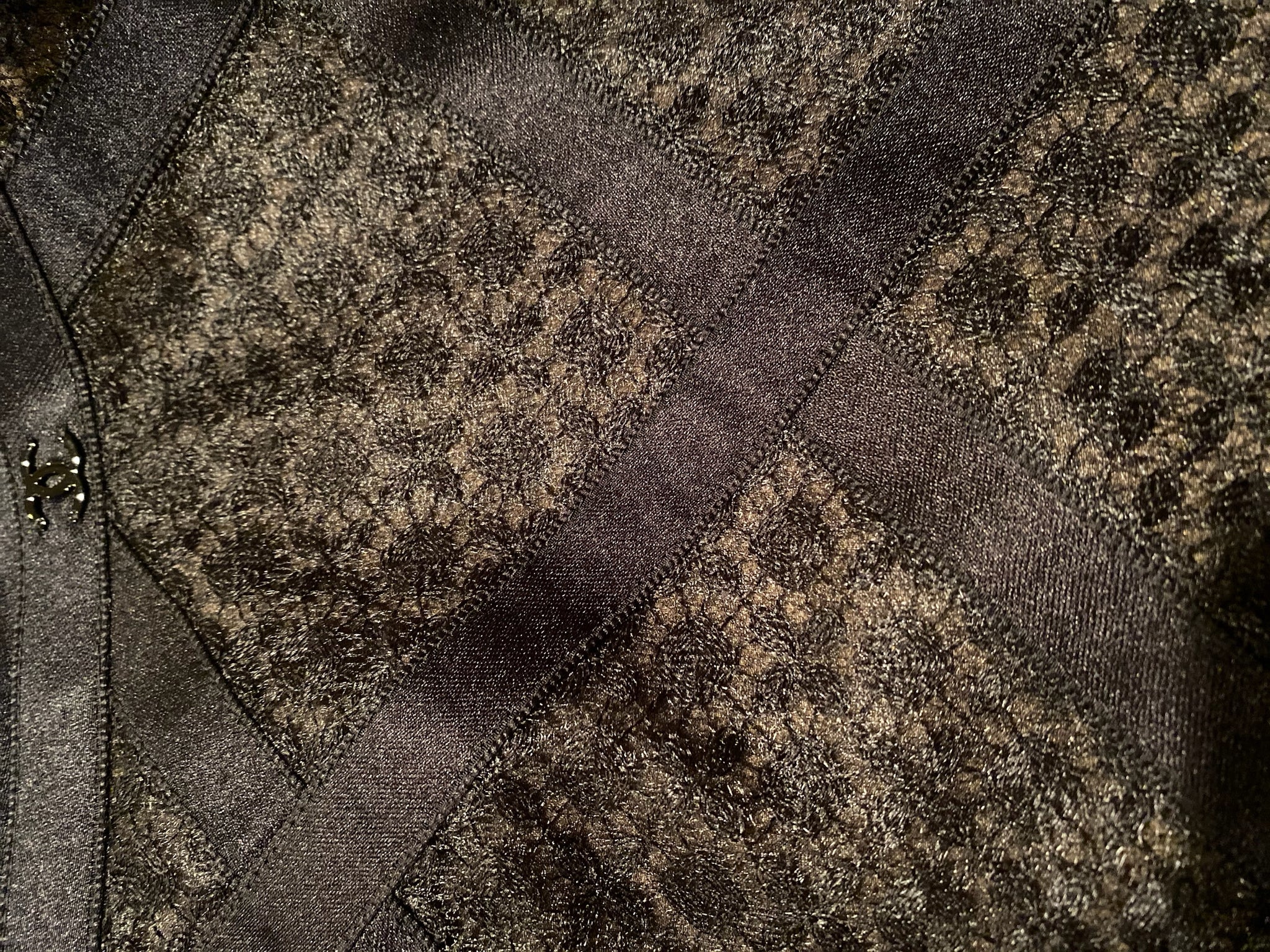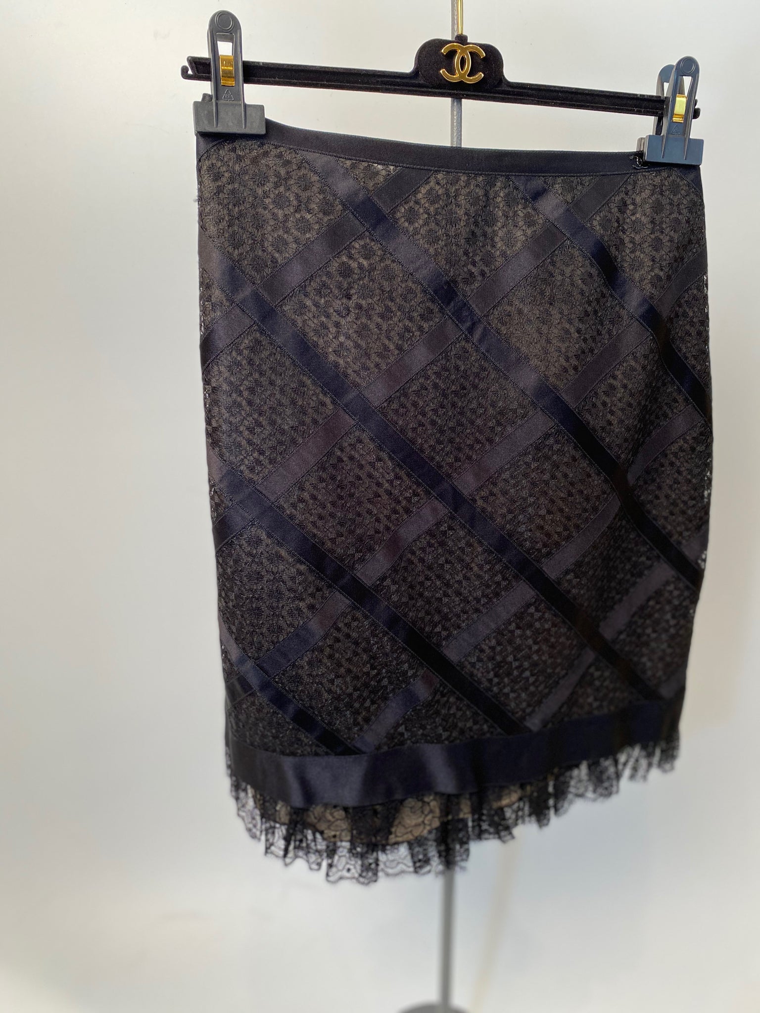 Chanel 07P, 2007 Spring collection birdcage skirt featured in black lace with satin ribbon trimming, lightly ruffled hem, nude lining, and a back zipper closure. Metal CC at waistband.