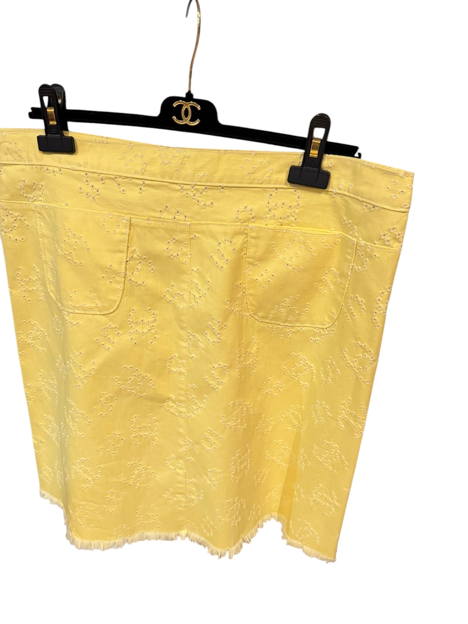 Yellow plus size skirt- size 46 from 06P 2006 Spring collection. 95% cotton, 2% spandex. It has an all-over design with slightly raised white dots which say "CC" , or "5". LOTS of them. Waist 40" It sits down a bit on the hips on my mannequin, which is a size 14 .. hips are 44 1/2', waist to hem is 22".It has 2 curved pockets on the front.