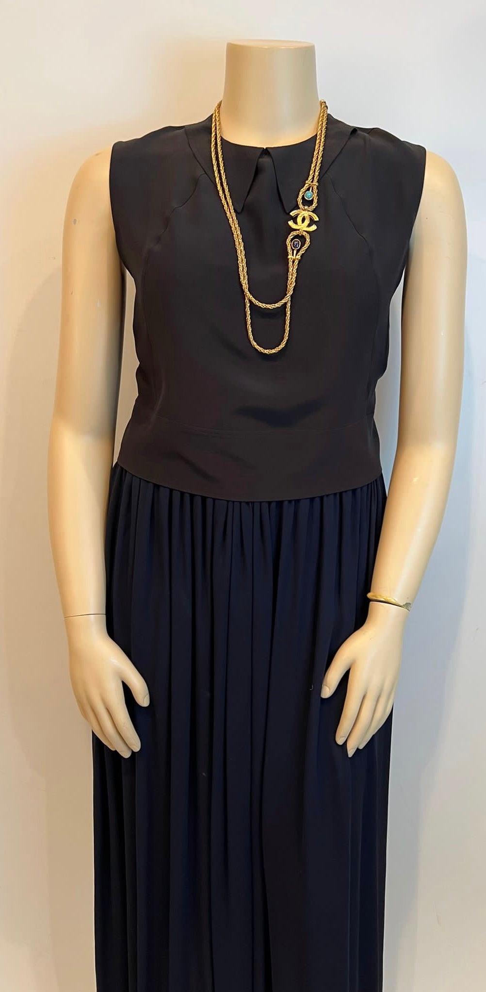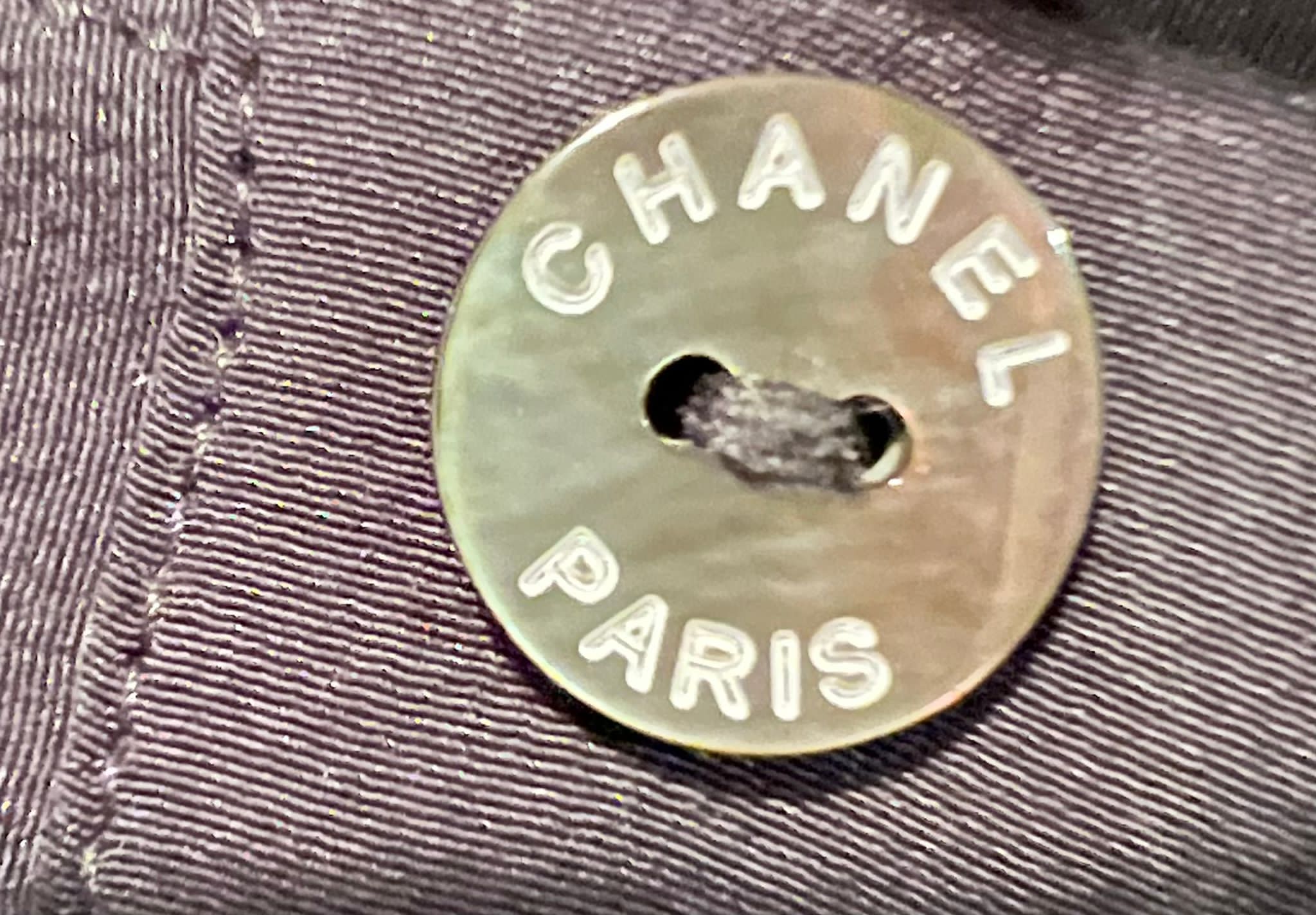 This is a heavy black Chanel silk blouse. It is sleeveless, has a colllar which is only in the front and buttons up the back with 6 mother of pearl buttons, each of which has "Chanel, Paris" around the edge. It has a finished 3" band around the bottom so it can be worn tucked in, or out.