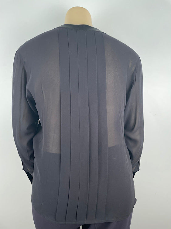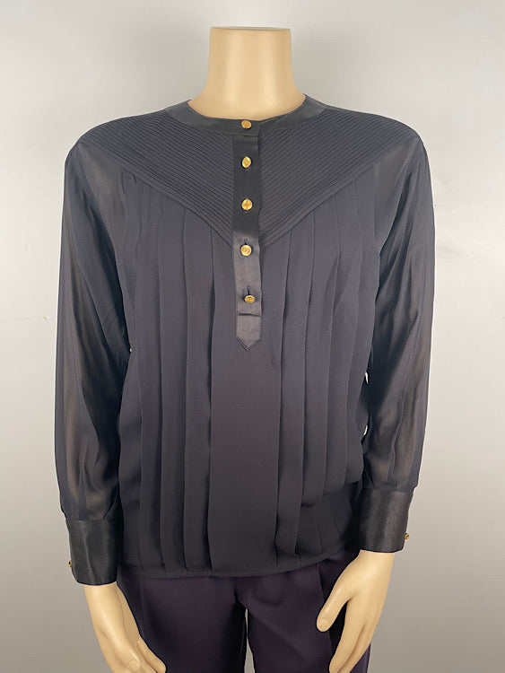 Chanel early 1990’s vintage silk blouse with satin trim, and a flattering angled ribbing on the front. The center is back, and center front below the ribbed area are wide silk chiffon pleats. The arms and the rest of the blouse are sheer.