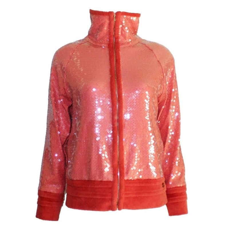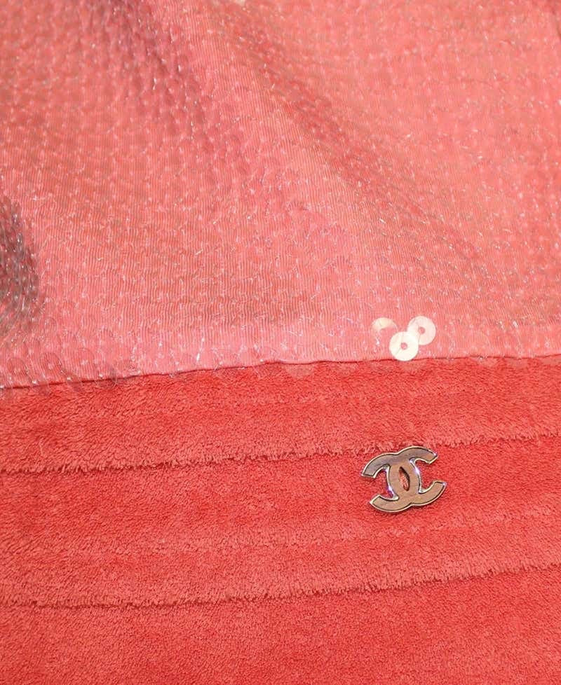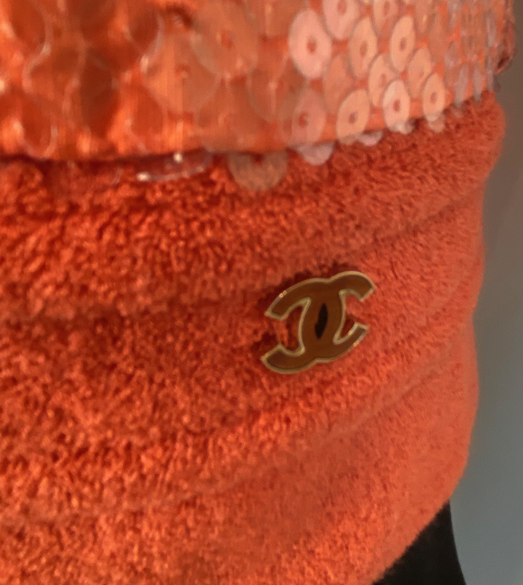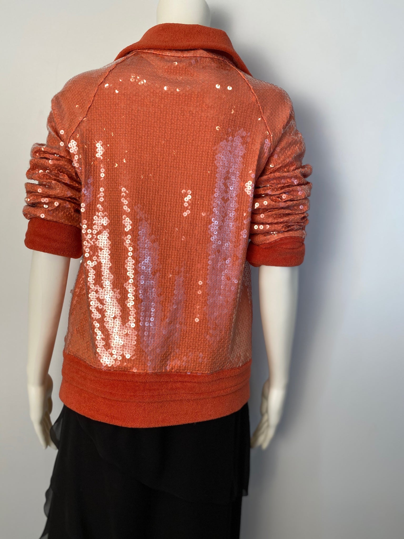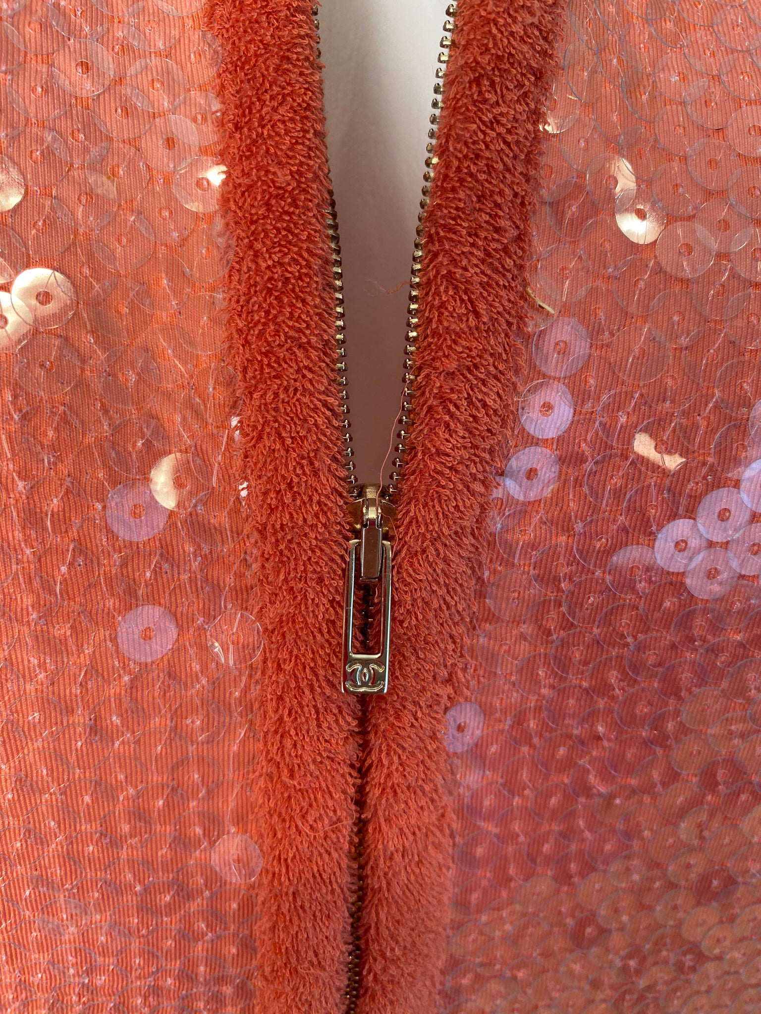 Chanel 08C, 2008 Cruise Resort Runway pastel orange/coral salmon colored sequined bomber baseball jacket. The cuffs, collar and bottom trim are terry cloth. The lining looks like silk but it is really nice soft poly with 10% spandex. The zipper pull has a “CC” on it- it zips all the way up so the collar can be worn both ways as shown. There is a metal and wood plated “CC” logo on the bottom trim.