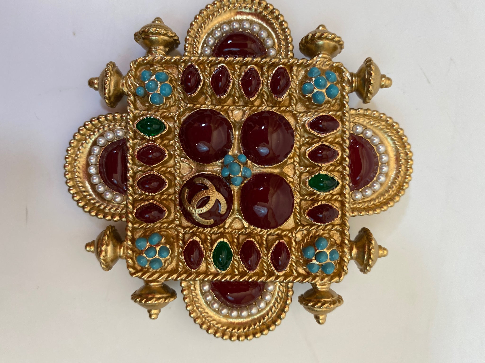 Chanel 11C, 2011 Cruise Resort gold turquoise red Gripoix Stone Brooch Pin
