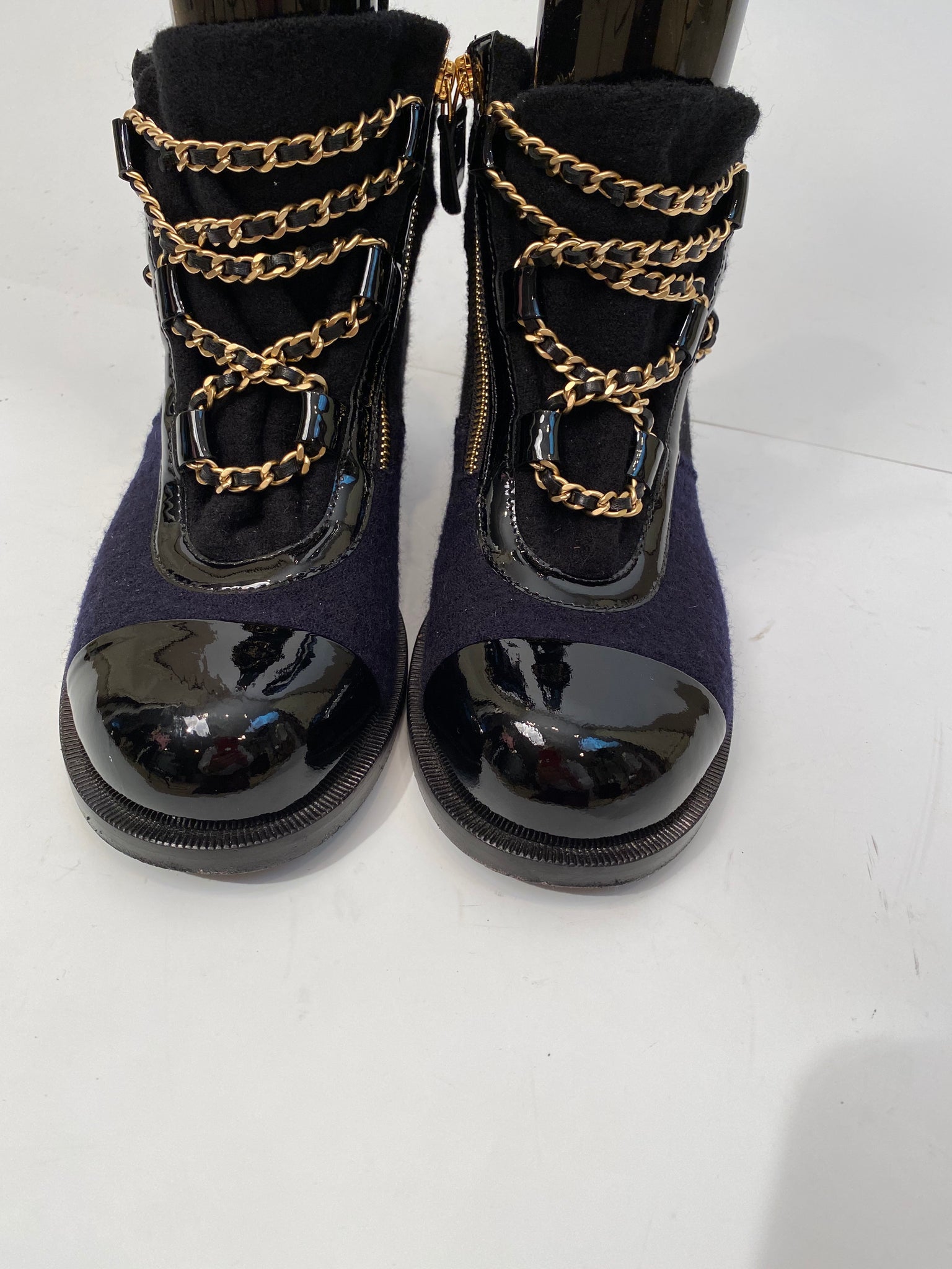 Black Wool and Patent Leather Cap Toe Short Boots. These boots feature iconic Chanel Paris Salzburg Charms on Chains in gold tone metal.