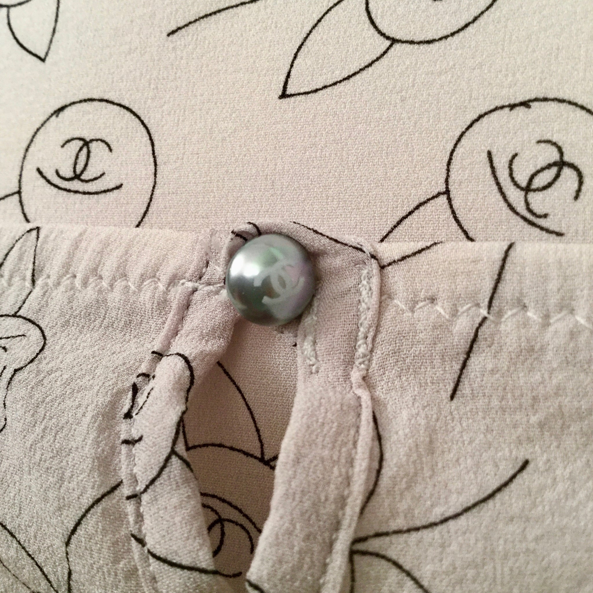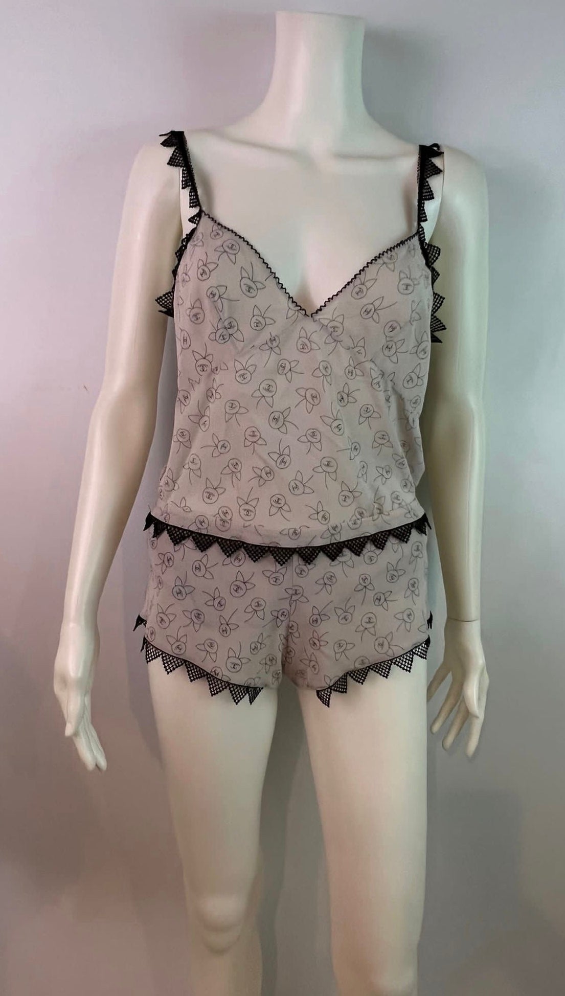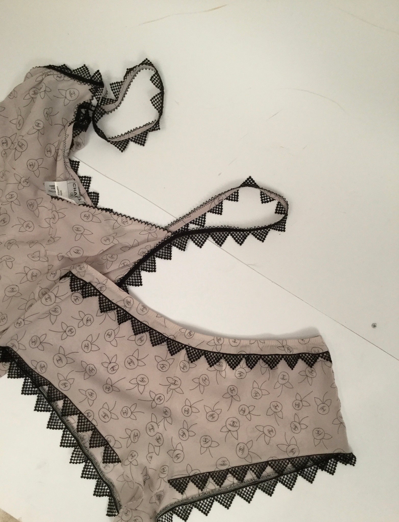 It is a lightweight fabric, camisole top and slightly low-rider boy short panties. Trim and straps are black lace. Fabric has a design of geometric flowers, LOTS of them, each with a "CC" logo. There is a Chanel button at the back, silver pearl with a "CC" logo.