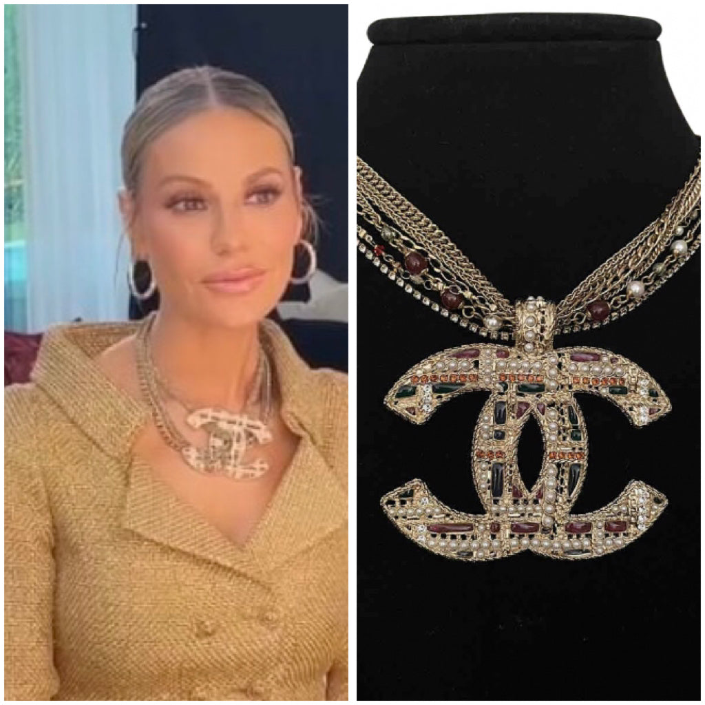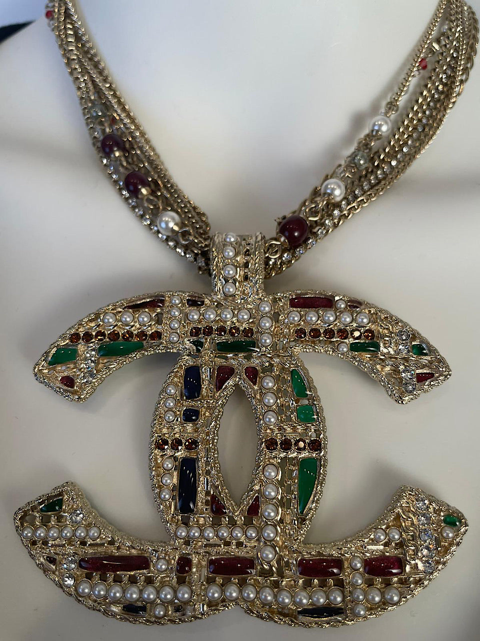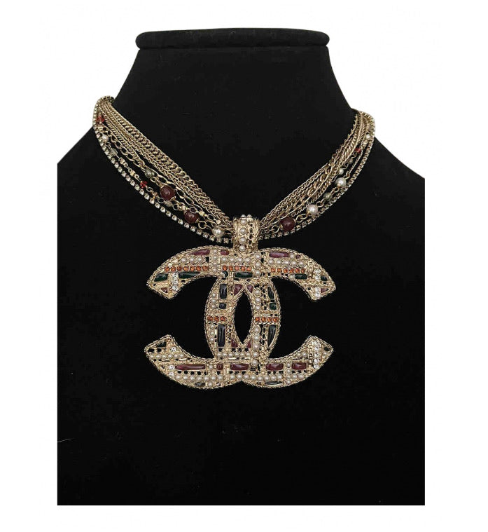 It has 7 gold chains supporting the large "CC" pendant, 4 are gold colored chains, each different from the others, plus 1 is all tiny crystals, set individually in 4 gold prongs, 1 has randomly placed tiny faceted red stones, and faux pearls and one has larger pearls, and larger rounded red beads which are oval. The pendant is gold metal in a very intricate design, with geometric shapes in green and red poured glass, tiny pearls, and there are also random tiny pearls on the top where the chain attaches.