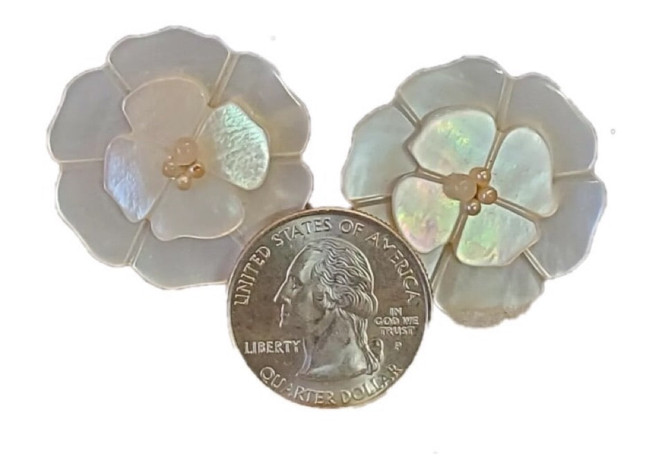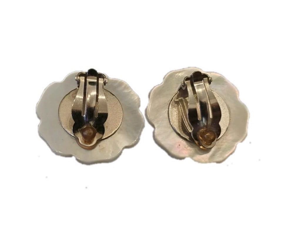 Vintage Chanel 98A Camellia flower clip on enamel mother of pearl Earrings