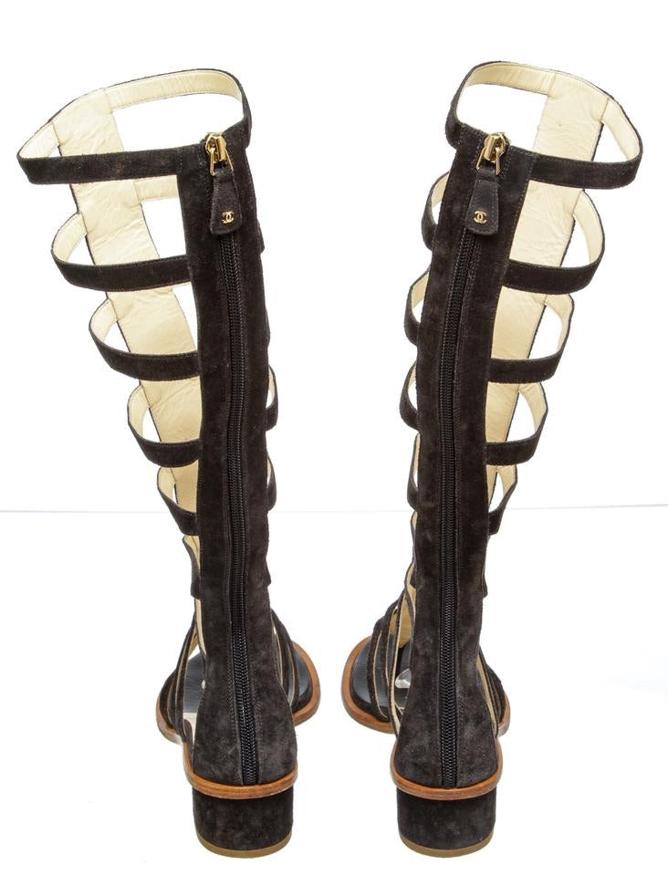 These dark grey gladiator Sandal boots are from Chanel's 15S 2015 Summer Spartacus collection. They are pictured in the Chanel catalog and runway. Zips up back. The zipper pull is suede and has the gold  metal "CC" logo. Suede Leather with a thong style foot.