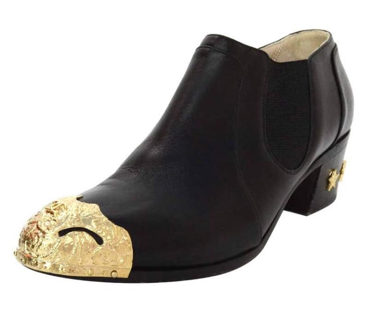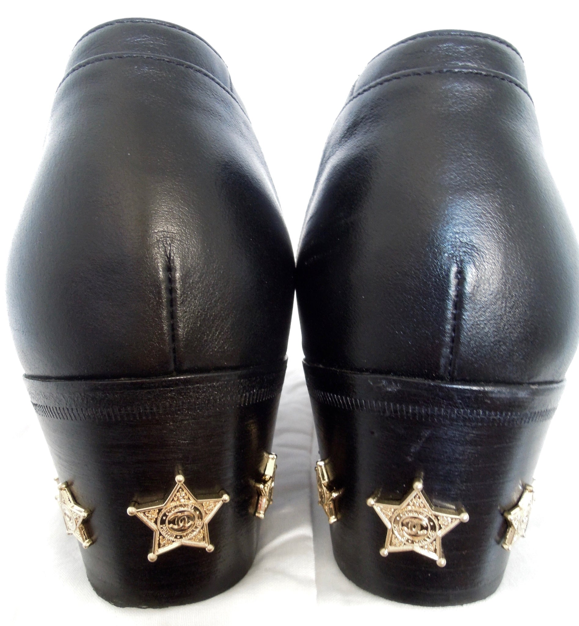 CHANEL Paris Dallas prefall 2014 gold toe ankle booties. Features intricate design in pale gold on toe cap and 5 pale gold sheriff stars decorating heel.