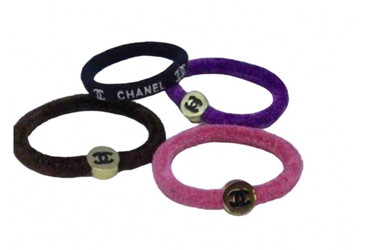 Set of 4 Chanel pony tail bands. 3 are velvet with a metal "CC" disc, and one is black elastic with white "Chanel" and logos all the way around. It is a rare set of 4 that was given out as an exclusive gift at a Chanel event. The velvet bands are purple, brown, and pink. A great Chanel accessory for yourself, or for your favorite little girl. P.S. They make cute bracelets too....