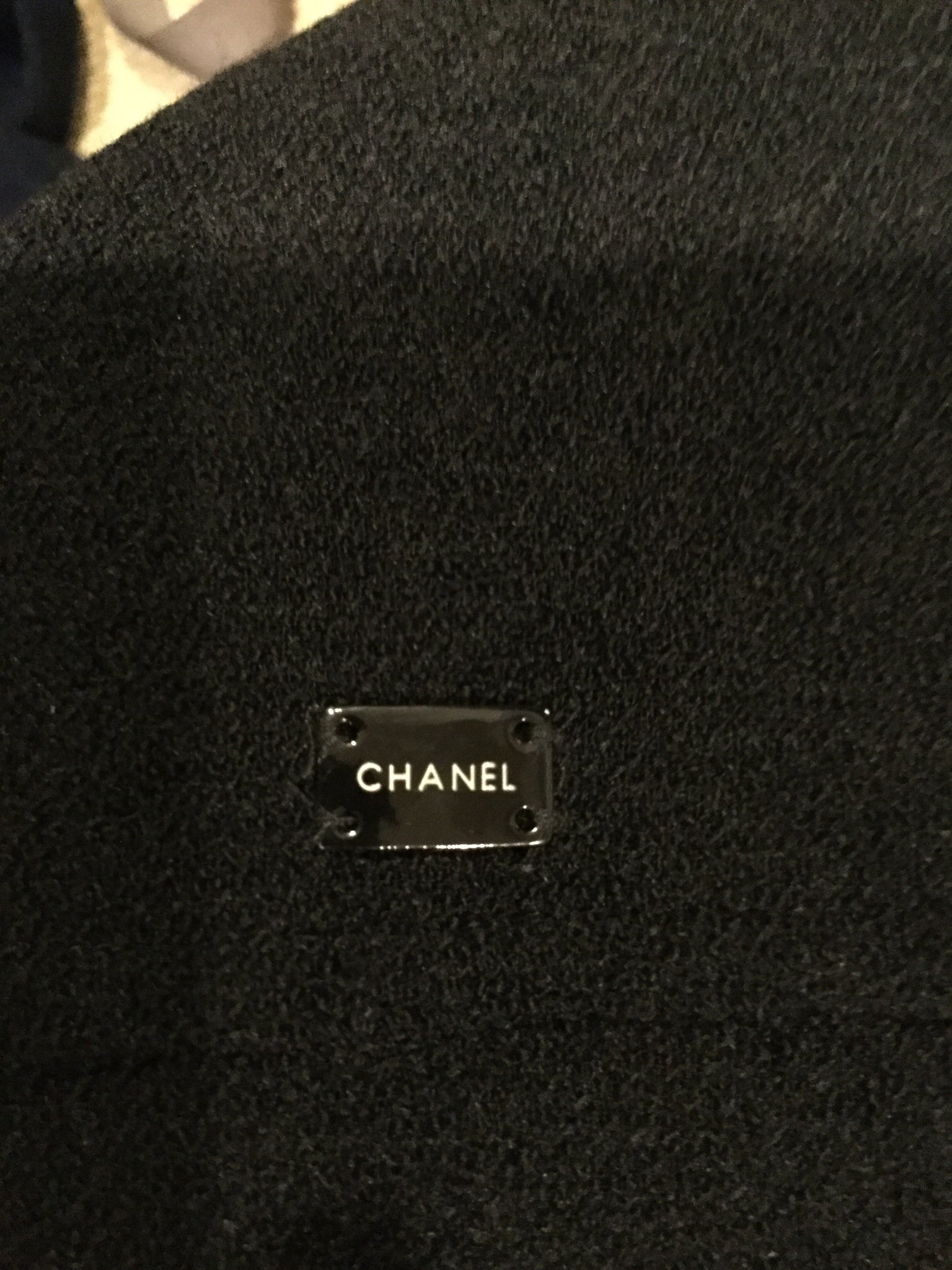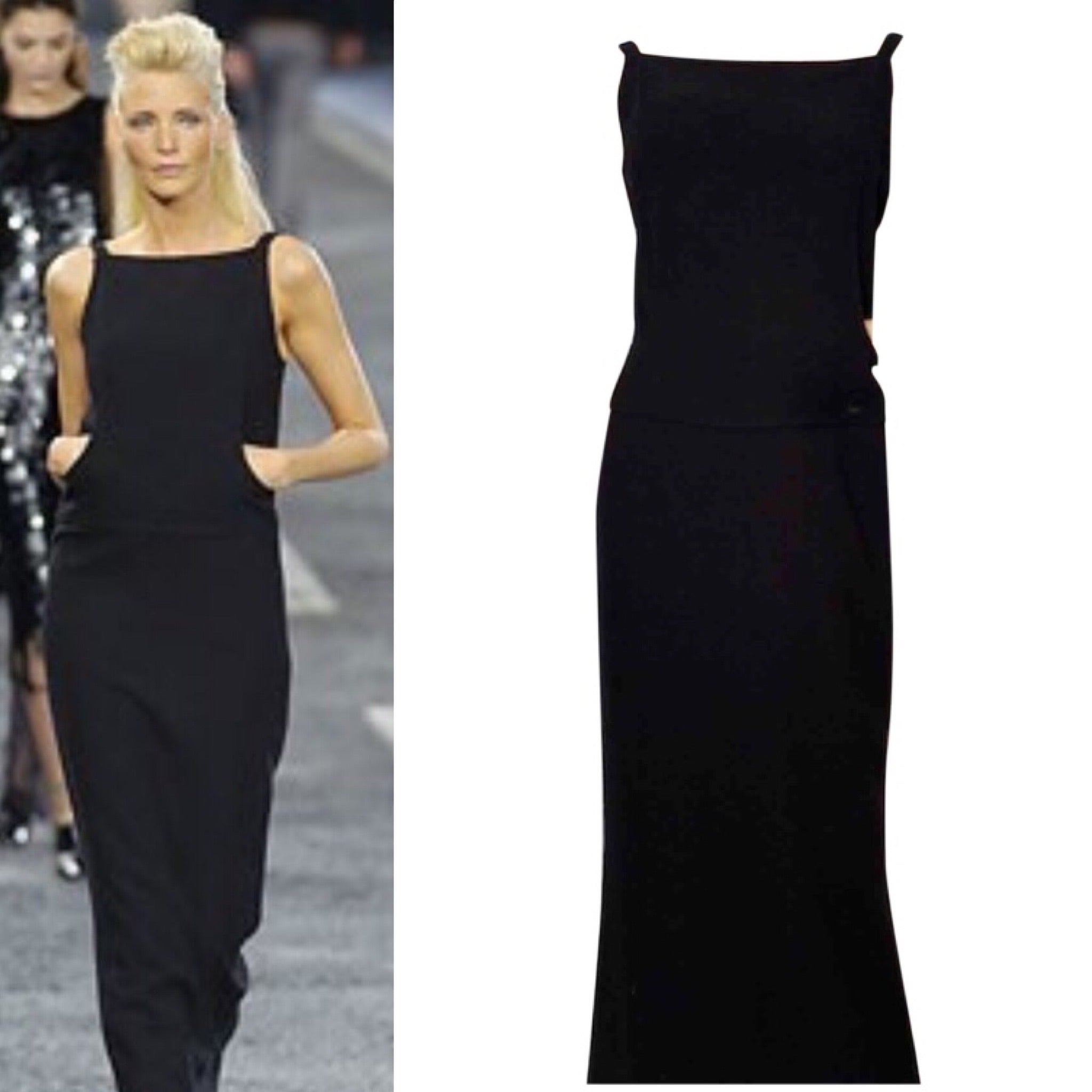 This versatile Chanel long black maxi dress was featured in Chanel's 04A, 2004 Fall catalog and Runway show. It has 2 hidden pockets. There is a rectangle on the hip, black with white letters which spell "Chanel".