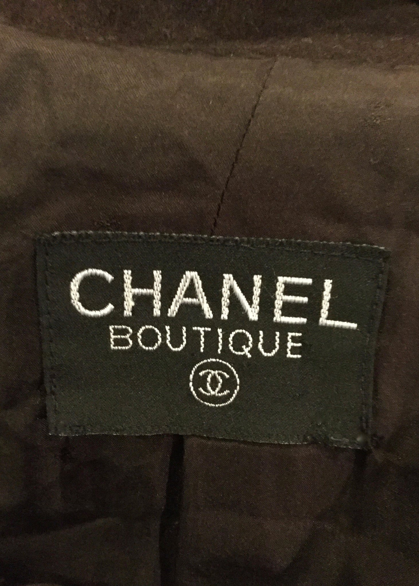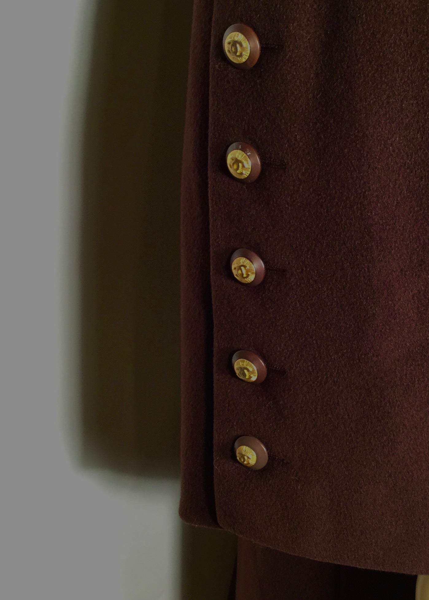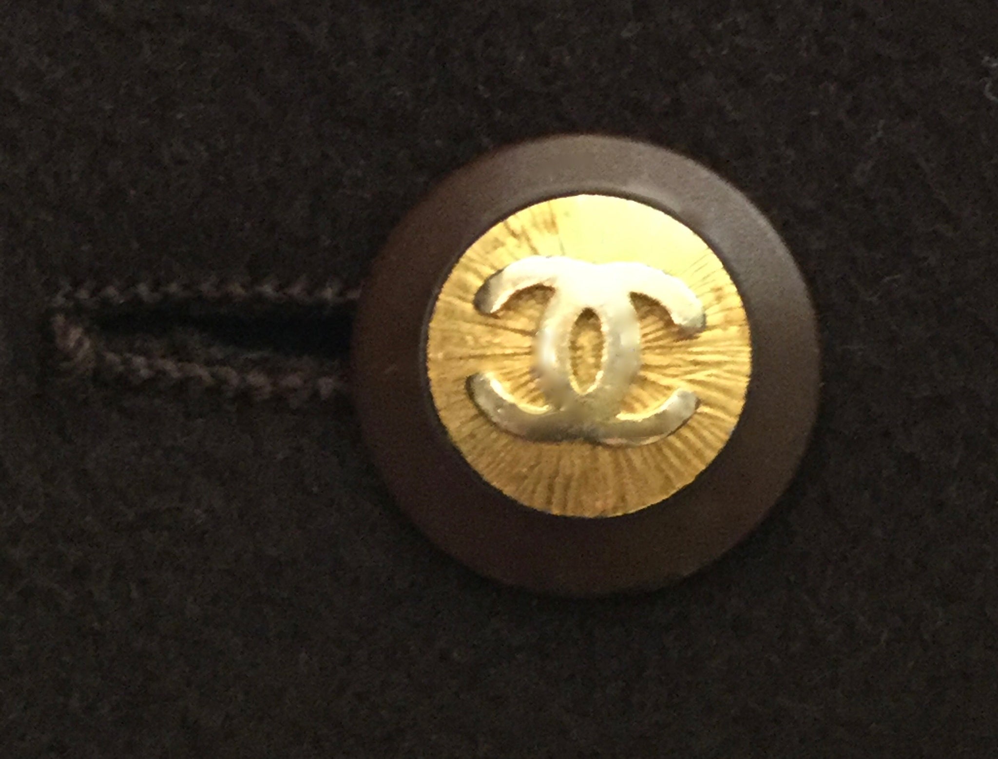 This is a brown Chanel Boutique Vintage classic collared coat with wide sleeves, Vintage from the mid-1990's. It has 20 amazing Chanel buttons, brown with raised gold "CC" center, 10 for closure, 5 more on each sleeve. The 14" slit in the back allows for easy walking. There are 2 working slit pockets at the hips, and 2 faux flap pockets in front.