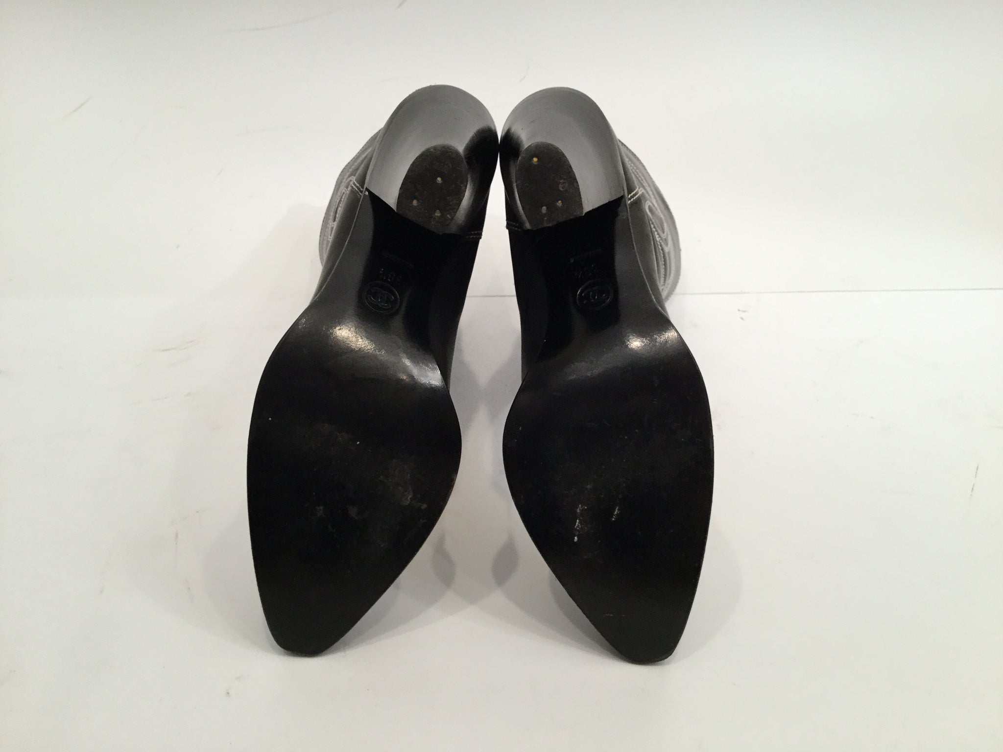Chanel black leather with white stitching cowboy boots! Large "CC" logo on the outside of each boot. These pull on, no zippers.