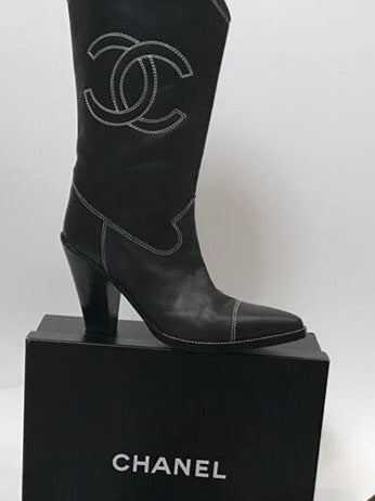 Chanel Black Cowboy Western Boots EU 38.5 US 7.5