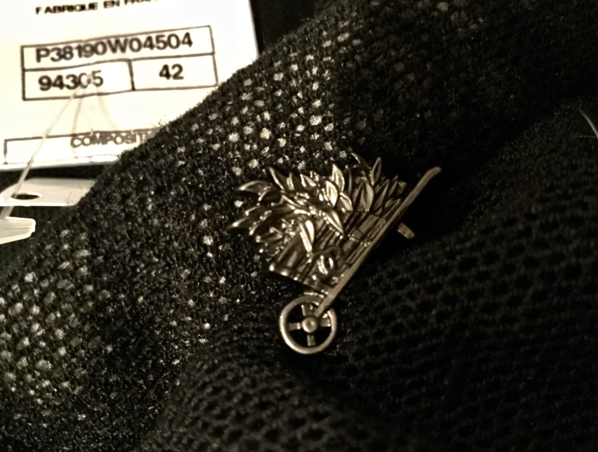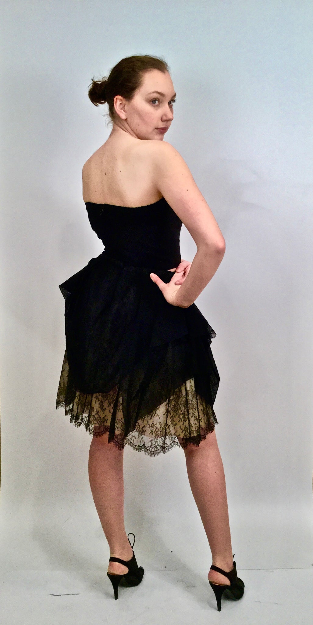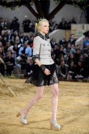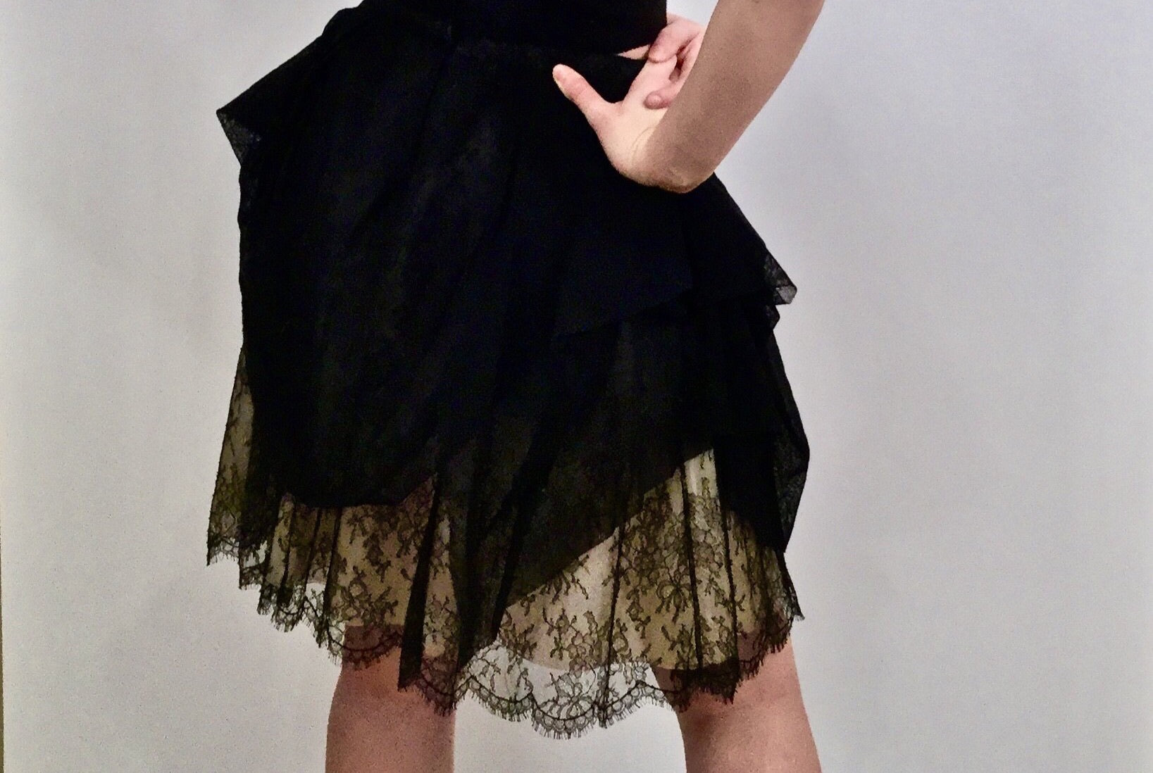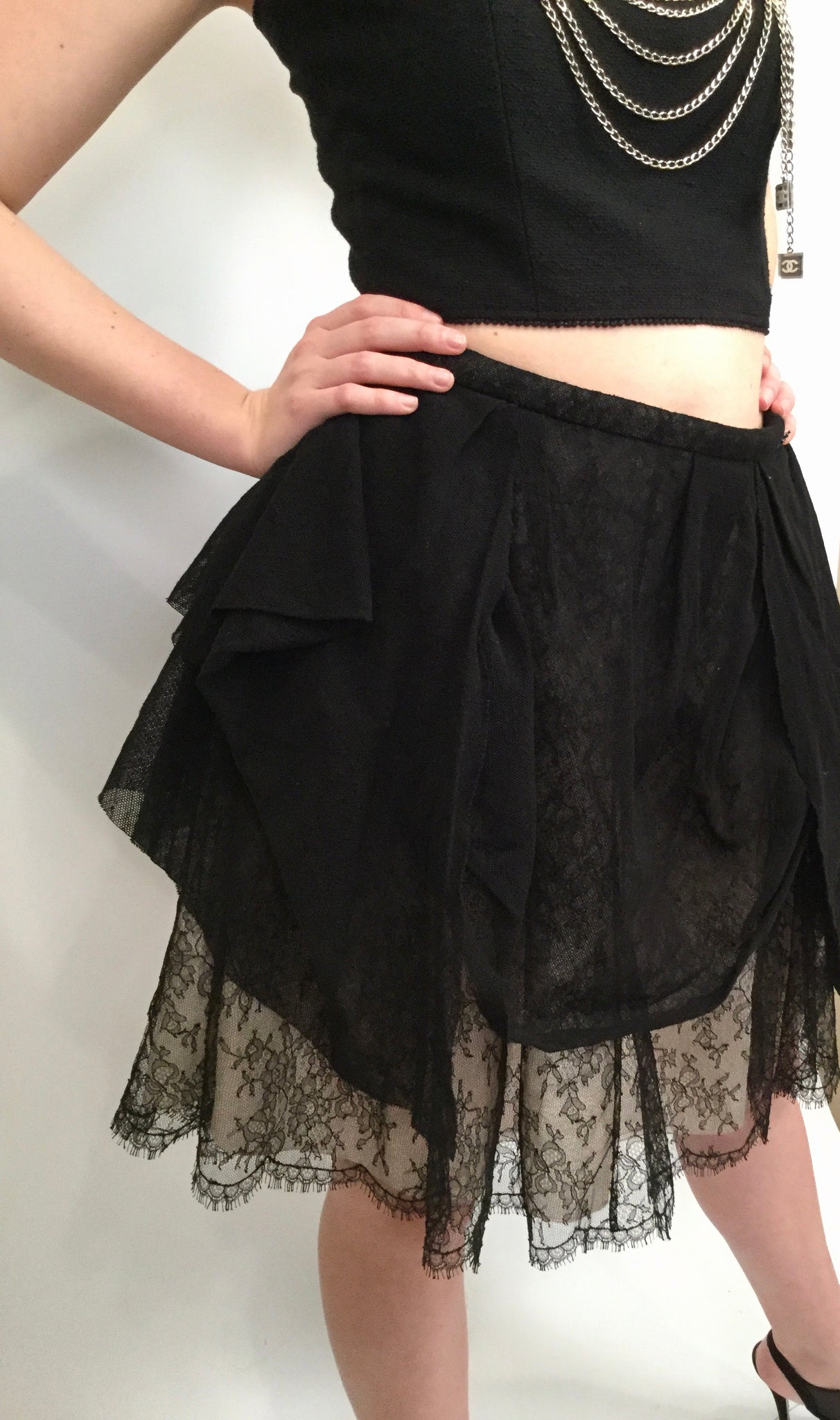 It has many layers, the bottom two are crinkled silk/poly in light gray. The next layer is thin lace, black but the lighter layers show through. Top layer is soft black linen, gathered randomly. Waistband is lace. This is from a recent Chanel collection. At the waist, there is a flat metal wheelbarrow, filled with leaves, and with a "CC" on the front. It zips up the back and you can can hook it at the waist. There is a wide piece of grosgrain ribbon on the inside of the waist which you can also hook, and it takes the waistband from 31" to 29 1/2". Waist to lowest part of the hem is 21".