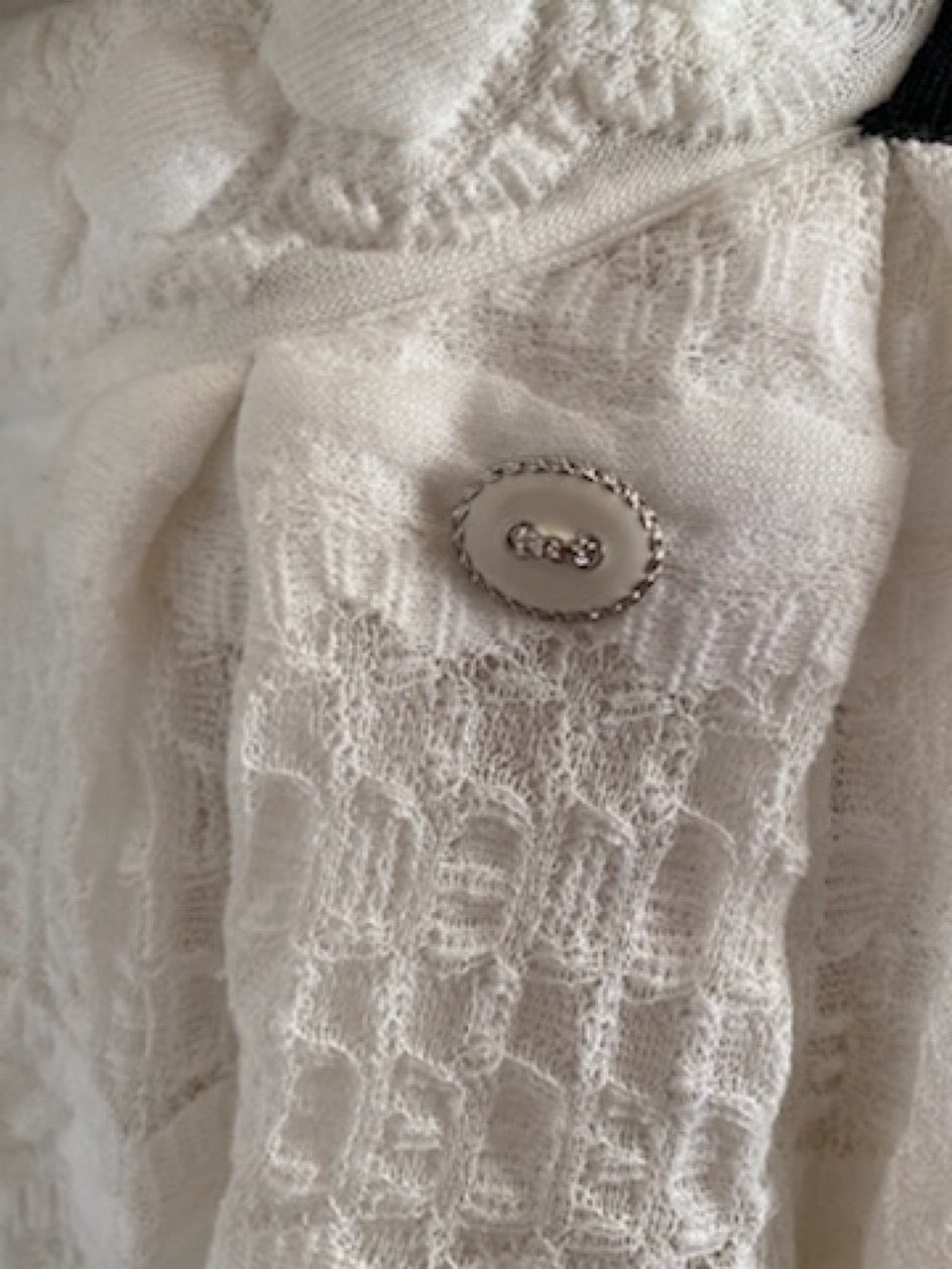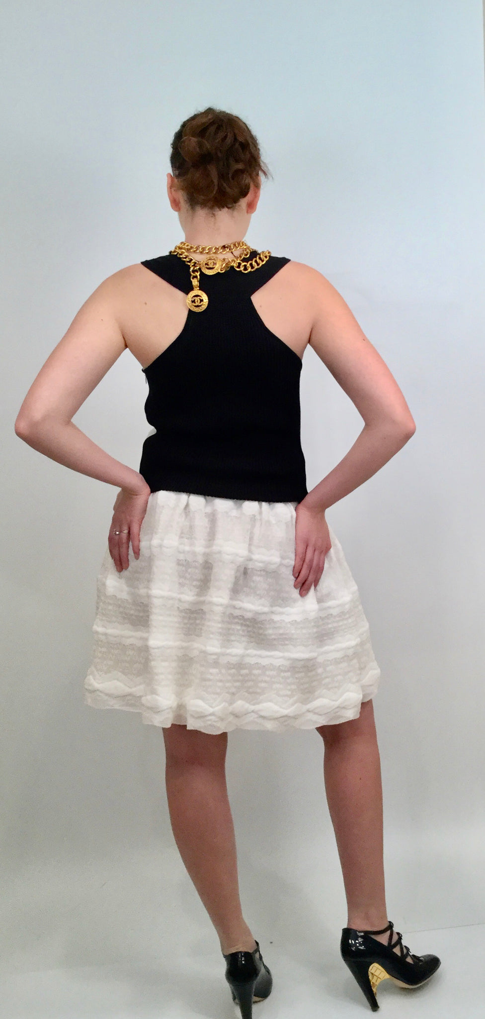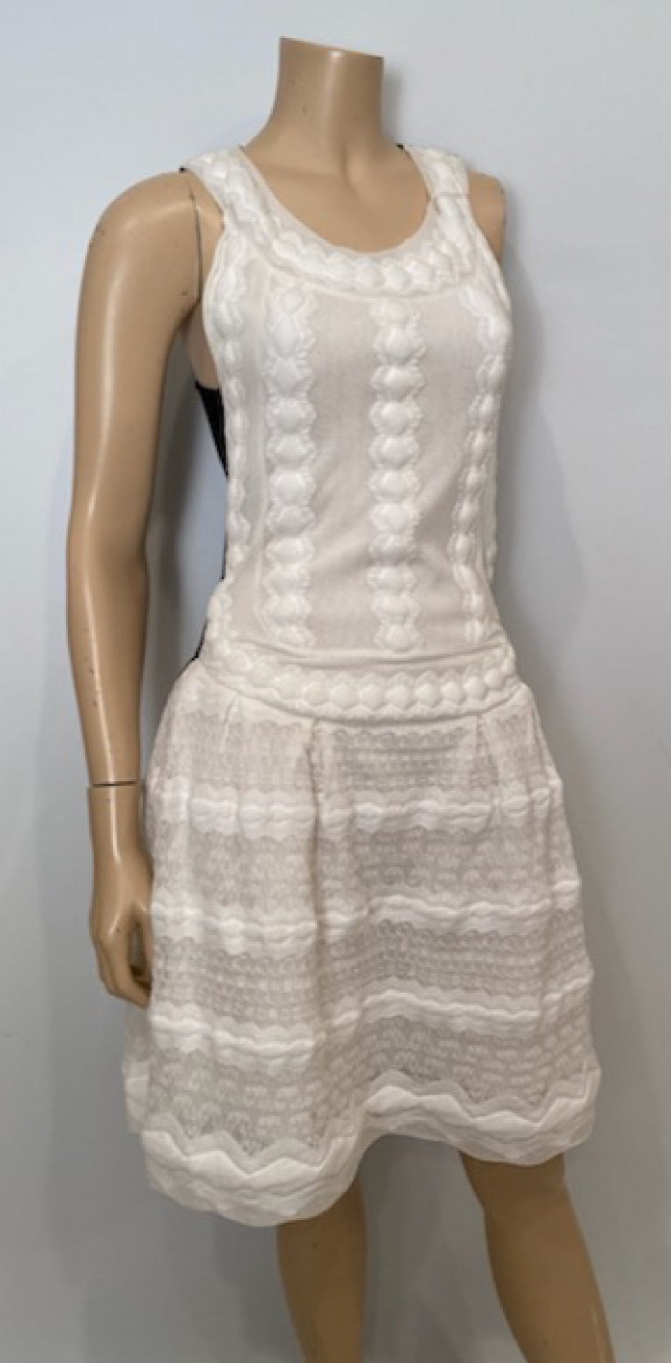 Striking Chanel dress from 15SS, 2015 Spring Summer Collection. White front, black and white back, Razorback style. Elaborate designs on the top and skirt portion-lace, netting & raised cotton strips. Zips up the side with a hidden zipper. There is a Chanel metal oval on the hip, white with raised silver clasping hands. Shown with a Chanel Jacket, sold separately on this website.