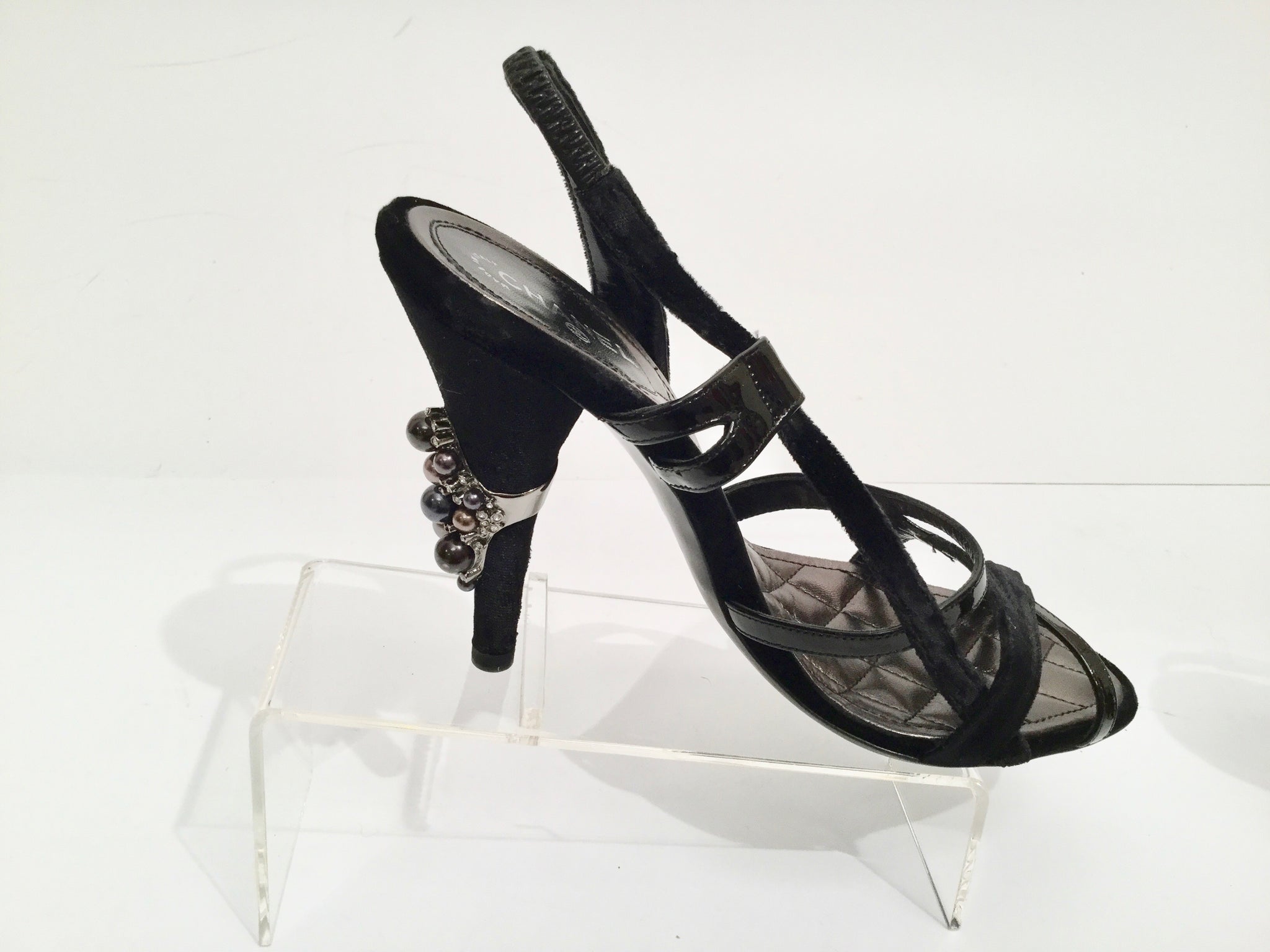 Chanel patent leather and velvet sandal heels, barely worn. Each heel has a 2" long design of gray and light gold pearls in different sizes, with many small crystals! The insole is padded with quilting, and is a sandal design in patent leather and velvet. From the 04A Runway Chanel collection, 2004 Fall.