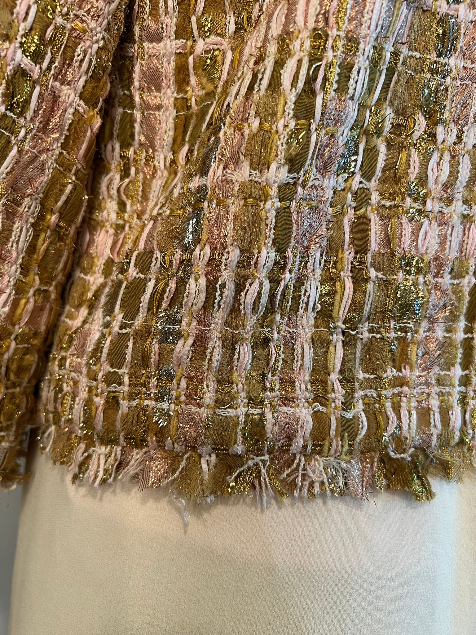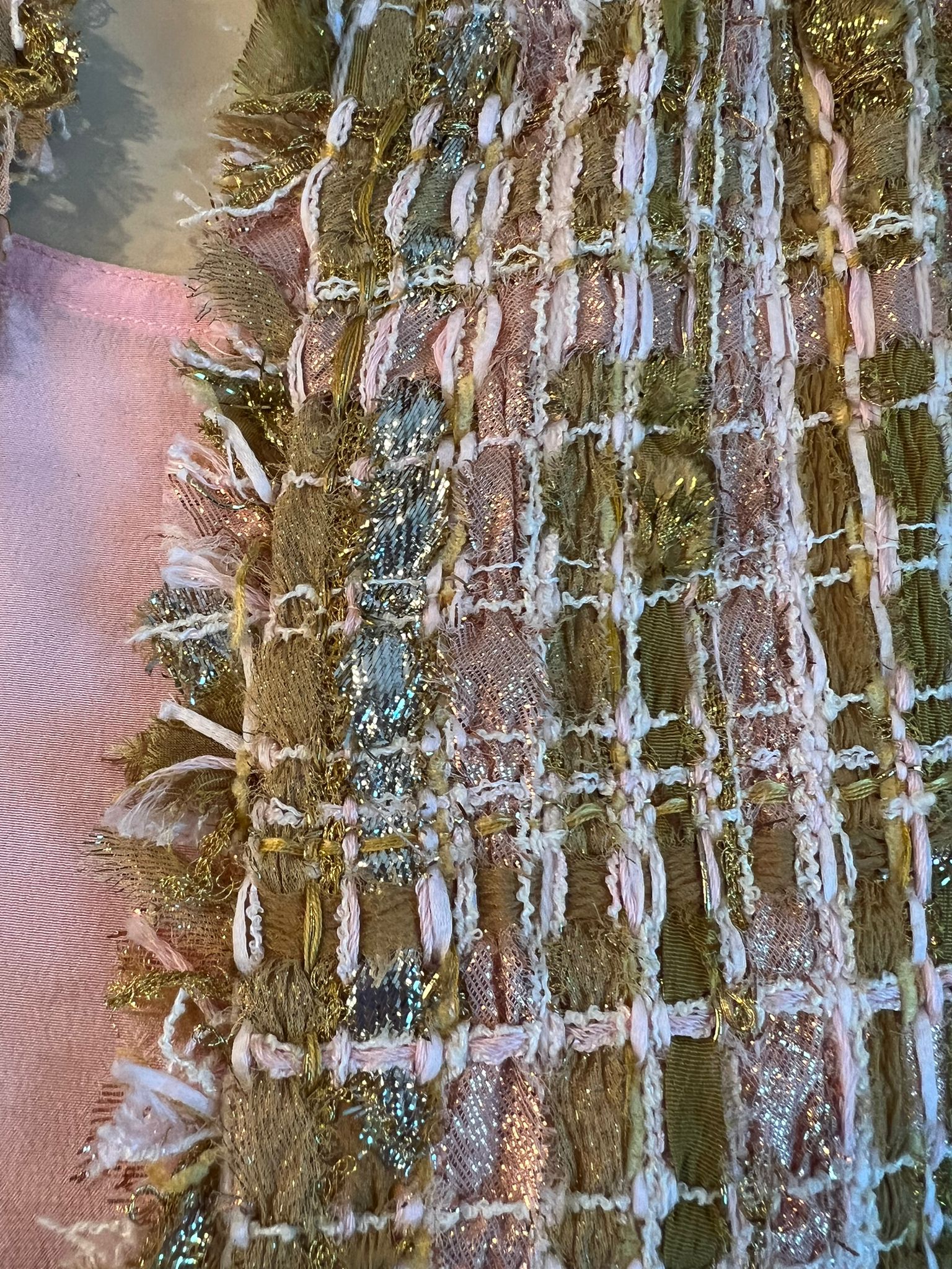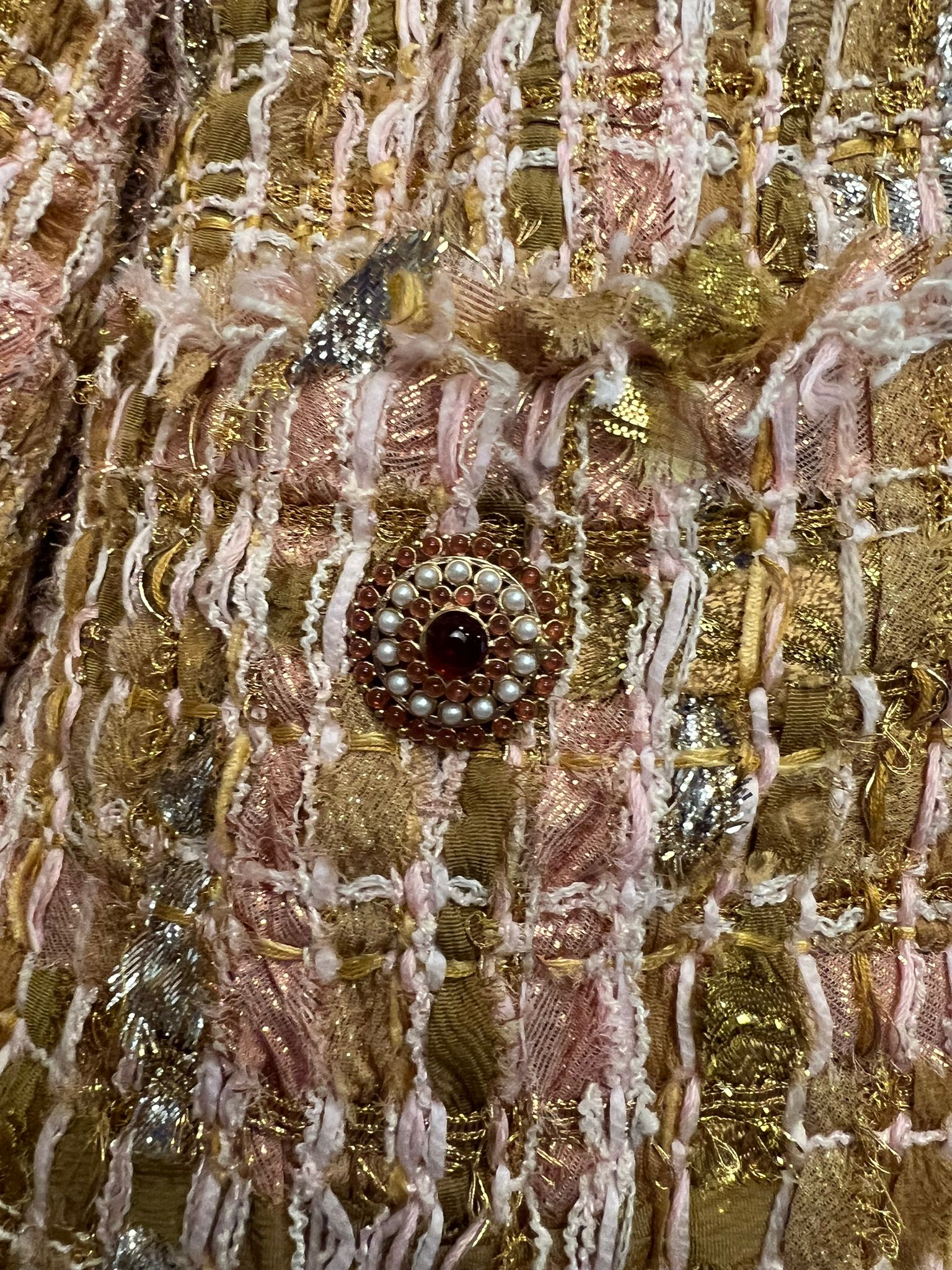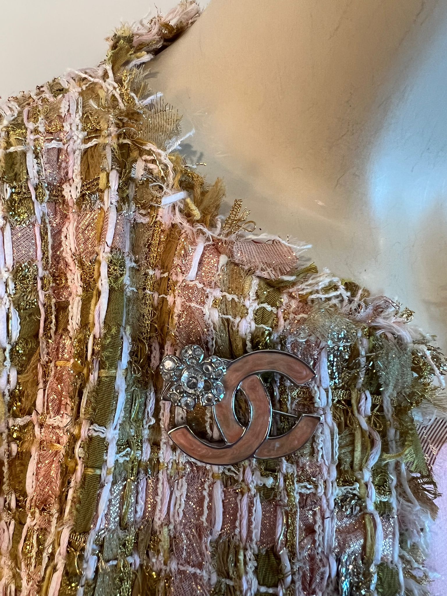 The fabulous weave of this jacket sets it apart In shades of pink, gold, and silver ribbons which shine when the light hits it with thin cording yarn throughout. The trim is a fringe continuation of the ribbons. The lining is a beautiful silk pink matching the pink weave. There are 2 patch pockets on the front which close with beautiful buttons with tiny pearls, poured glass, and a small gold CC logo. It has the famous Chanel chain around the bottom to make sure it hangs evenly. Closure is 3 sets of hidden hook and eyes.
