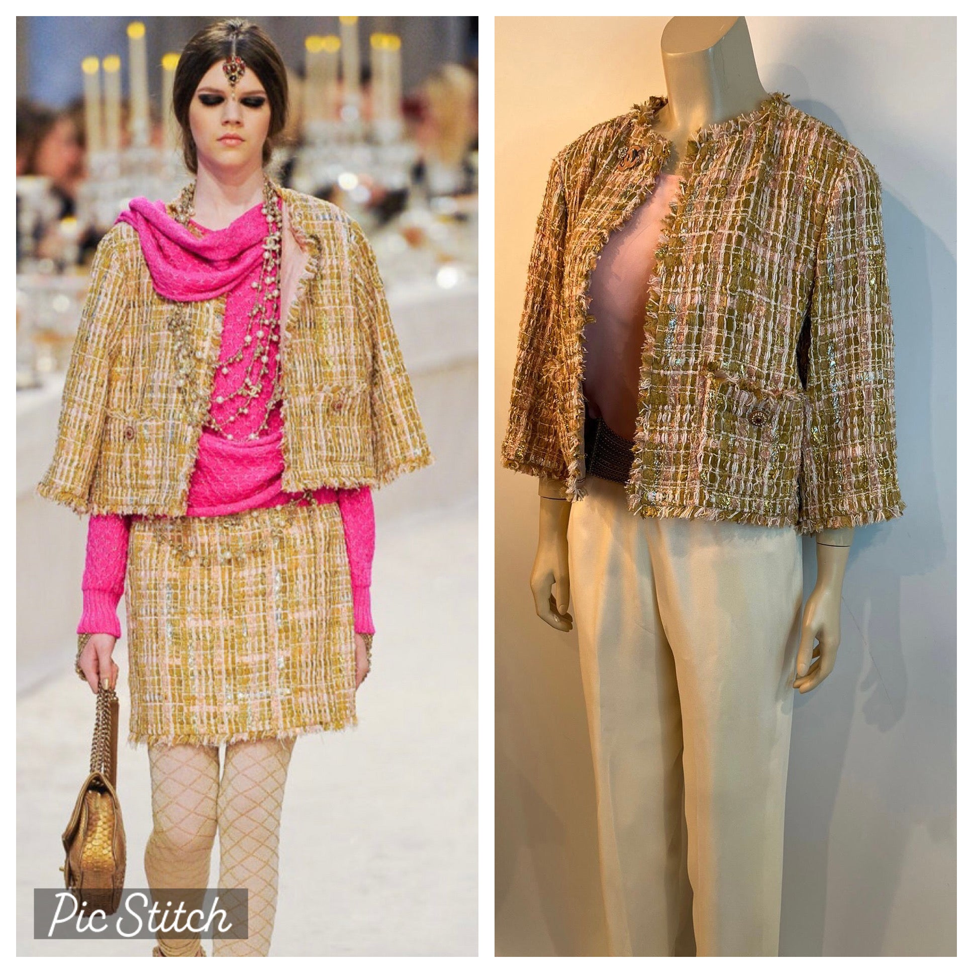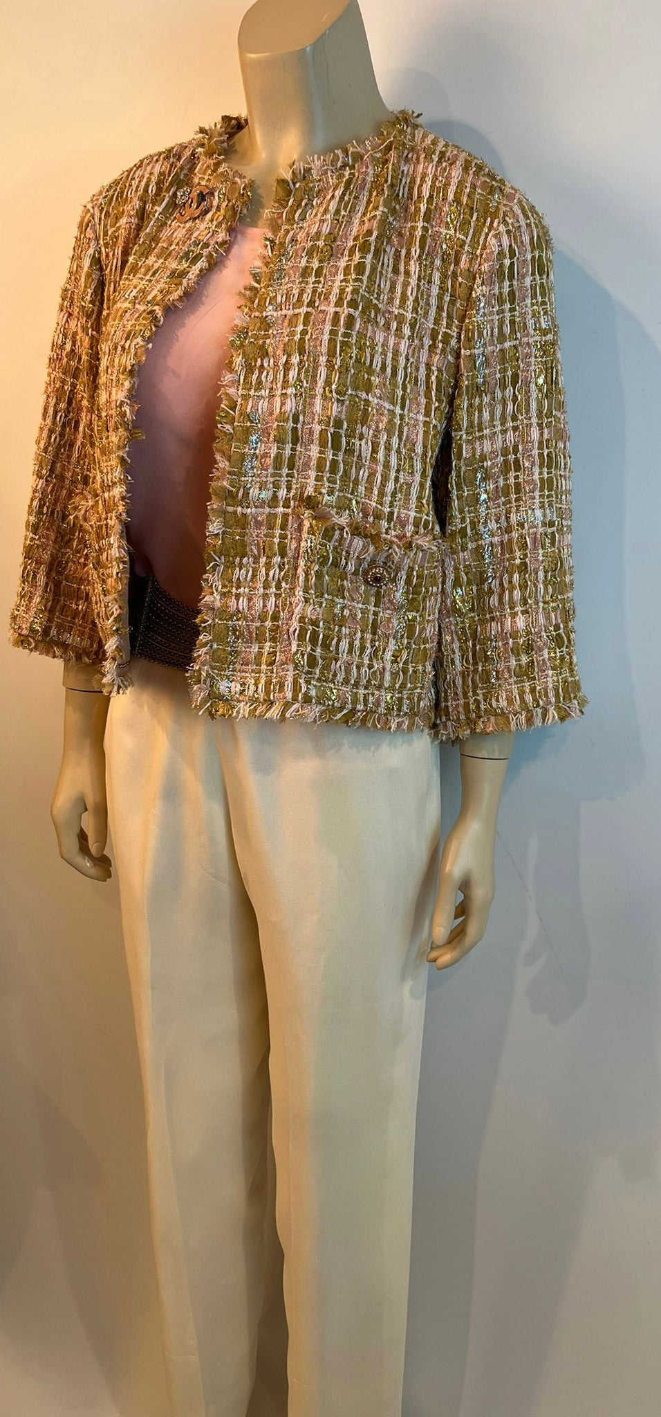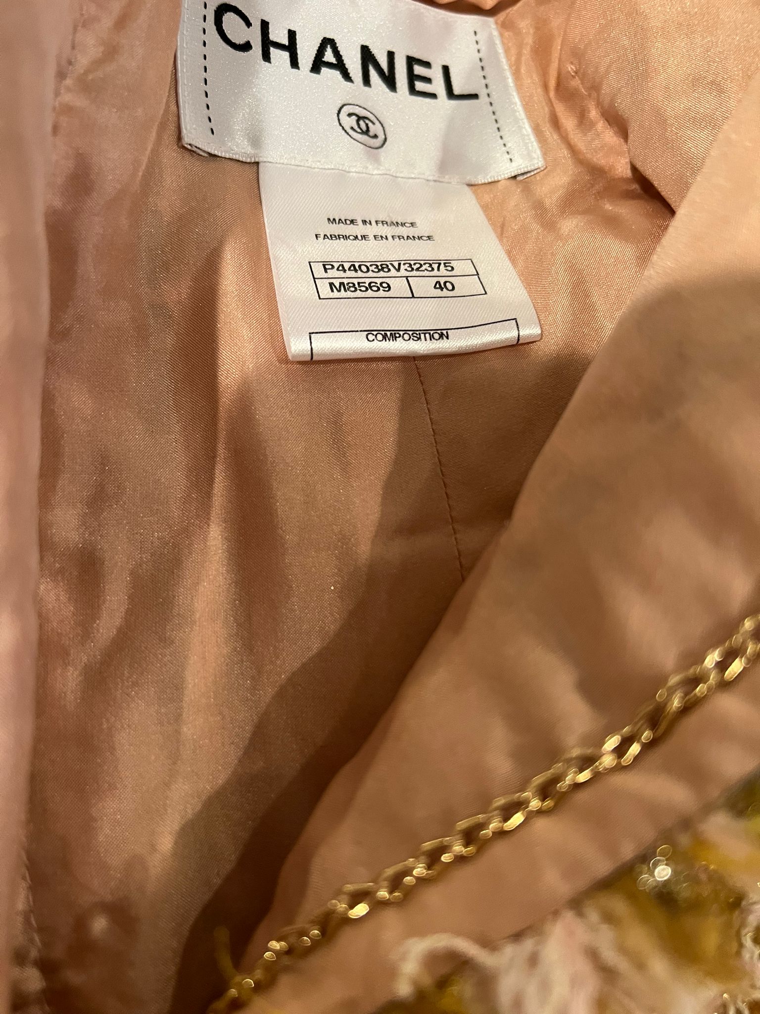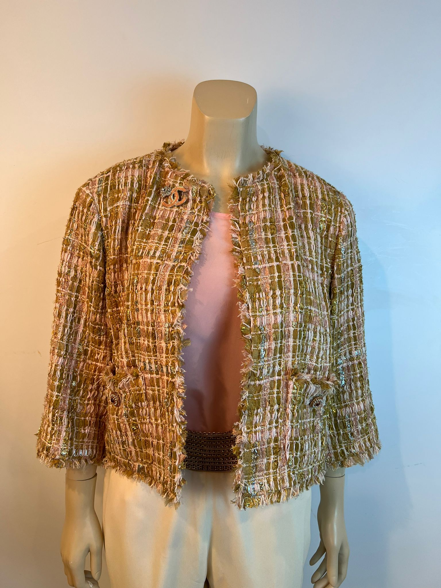 The fabulous weave of this jacket sets it apart In shades of pink, gold, and silver ribbons which shine when the light hits it with thin cording yarn throughout. The trim is a fringe continuation of the ribbons. The lining is a beautiful silk pink matching the pink weave. There are 2 patch pockets on the front which close with beautiful buttons with tiny pearls, poured glass, and a small gold CC logo. It has the famous Chanel chain around the bottom to make sure it hangs evenly. Closure is 3 sets of hidden hook and eyes.