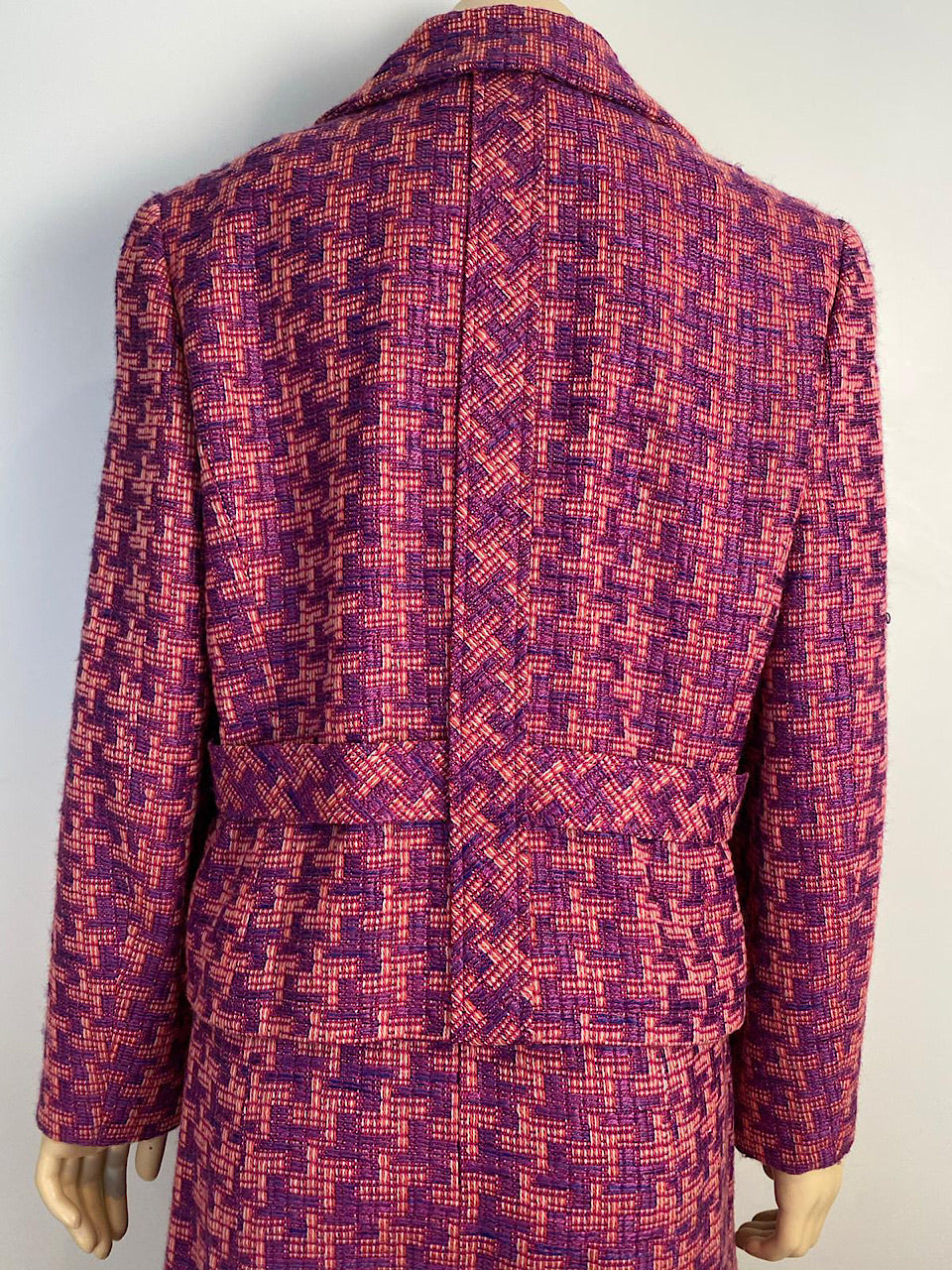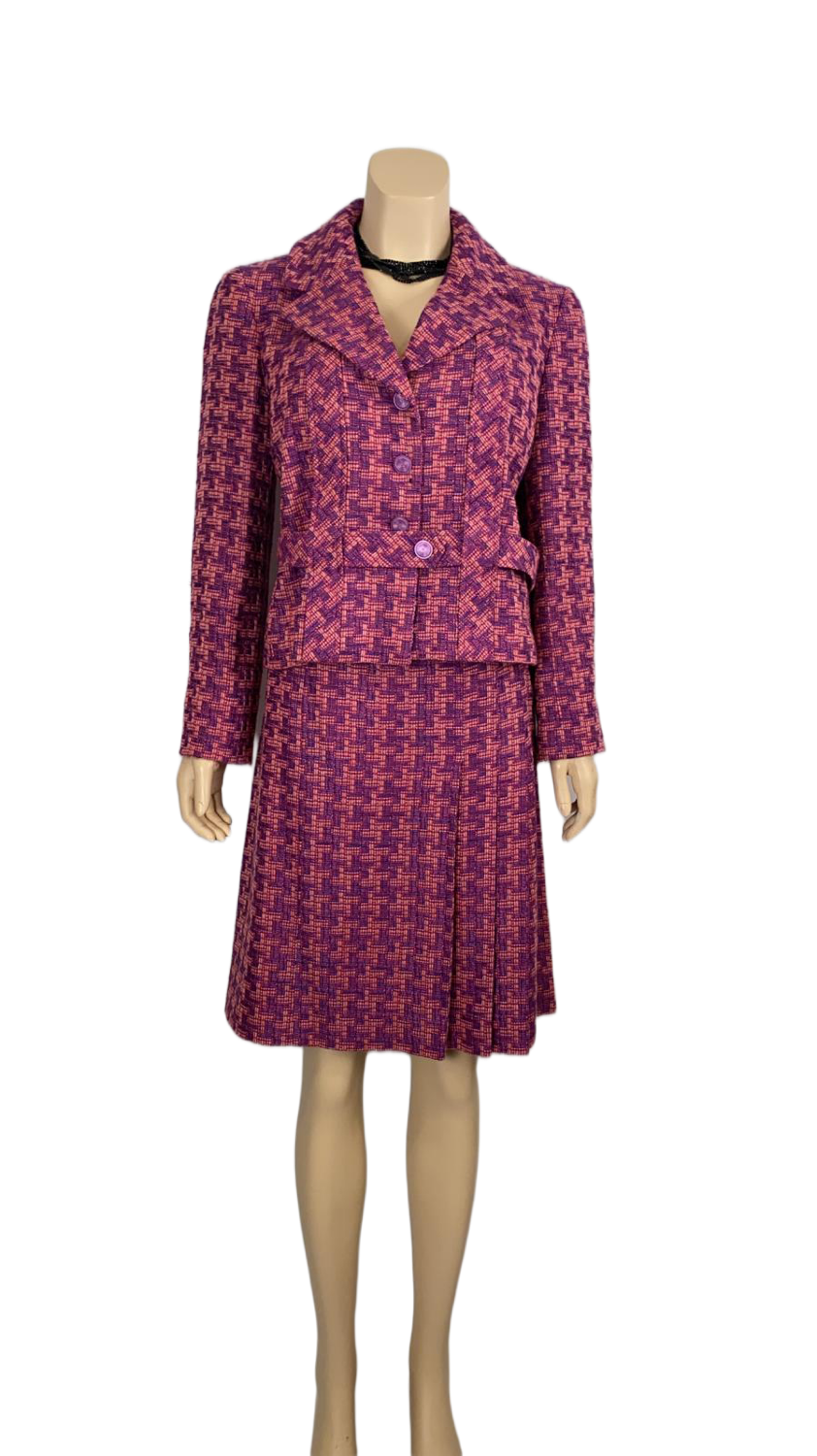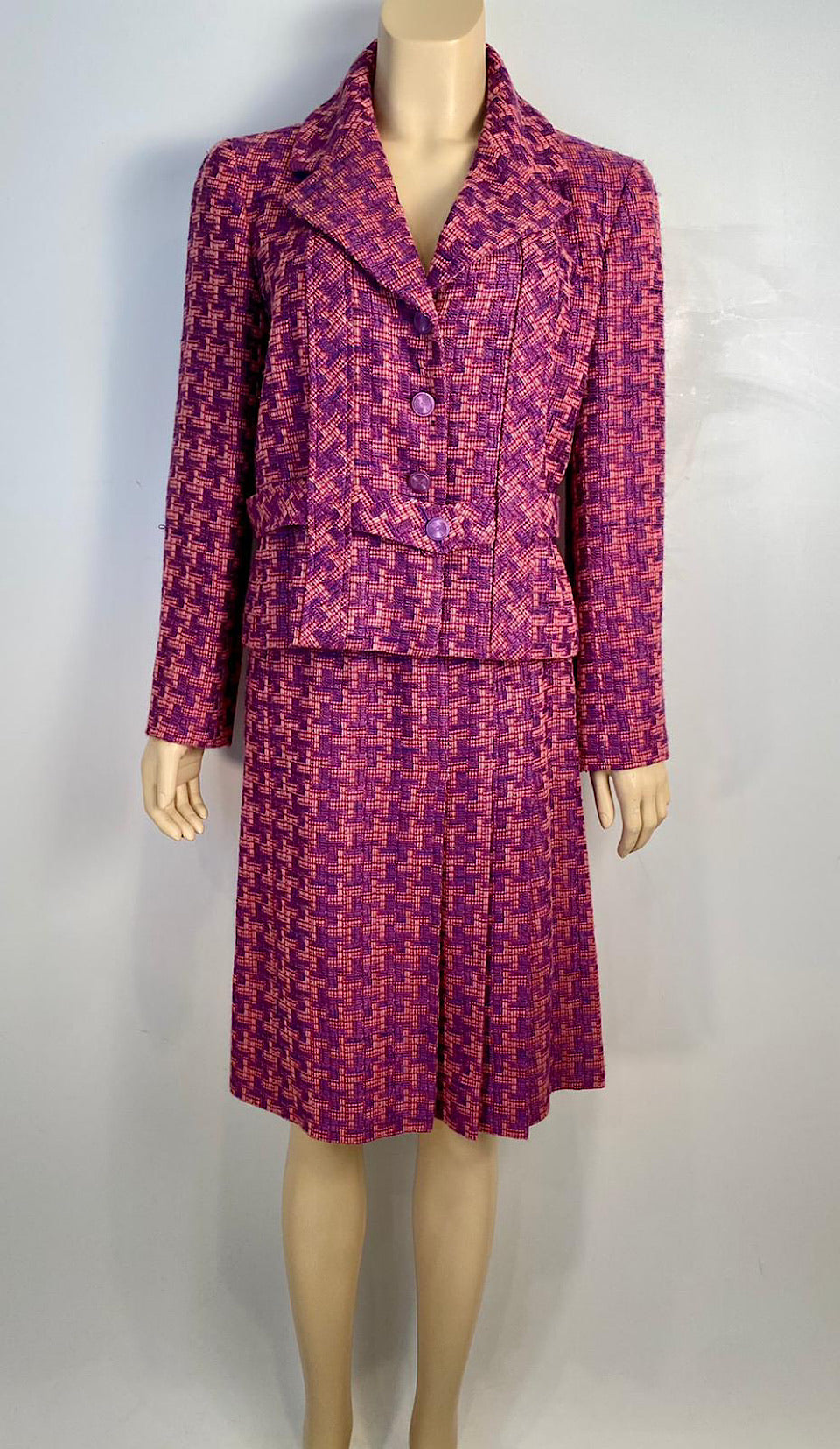 This jacket has Chanel's famous chain around the bottom to make sure it hangs evenly. There are flattering small shoulder pads. Closure is by 4 Chanel buttons with the CC logo in the center, there is a matching fabric belt that goes through fabric  belt loops. Skirt style is very flattering- with no waistband, hidden zipper in the back, A- line skirt with 3 decorative pleats starting 8" down from the waist, at the left front. This has a textured fabric of beautiful weave in shades of pink and wine colors.