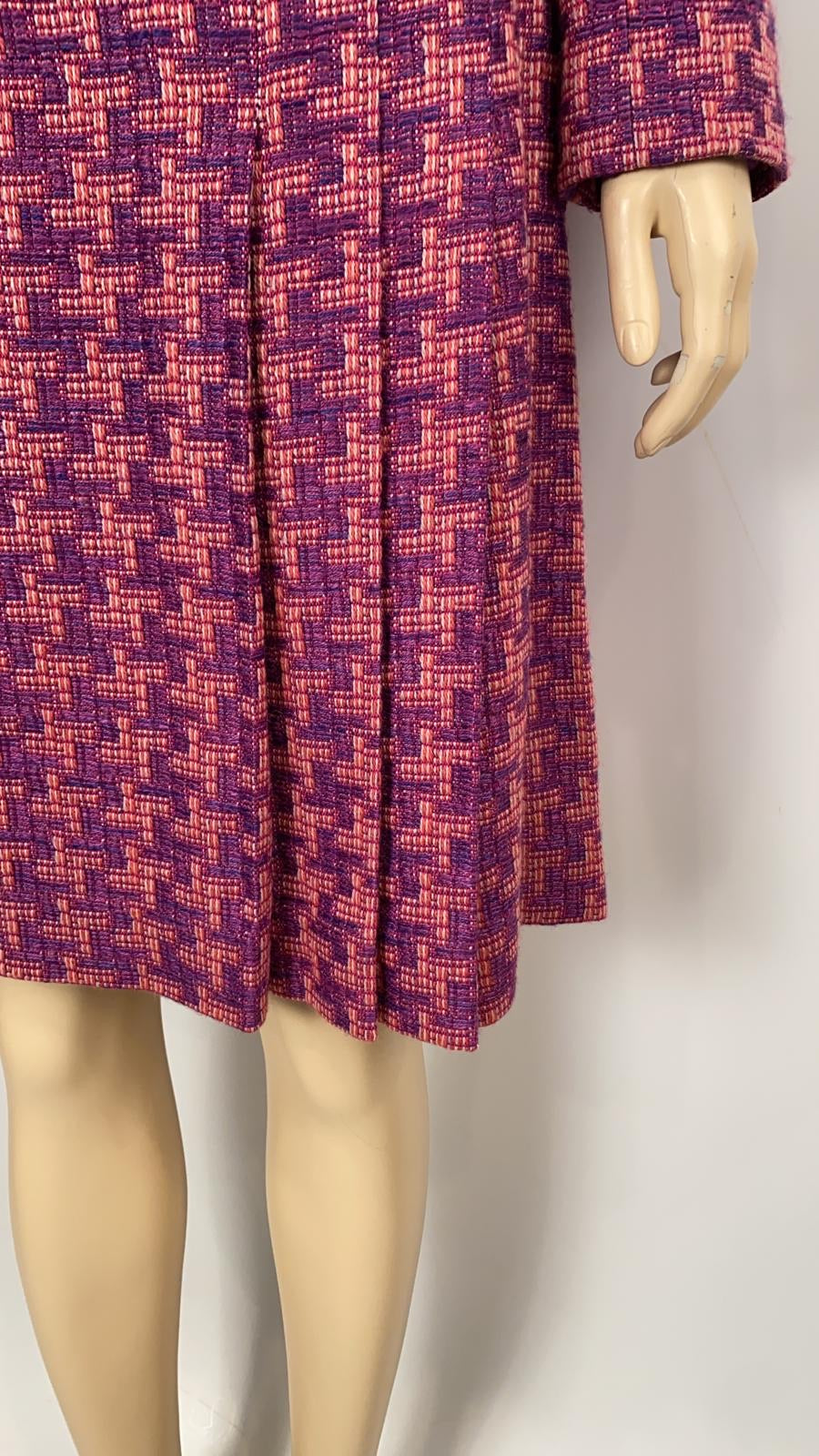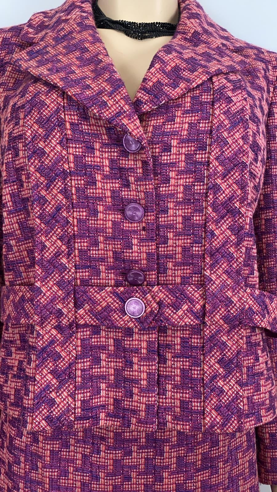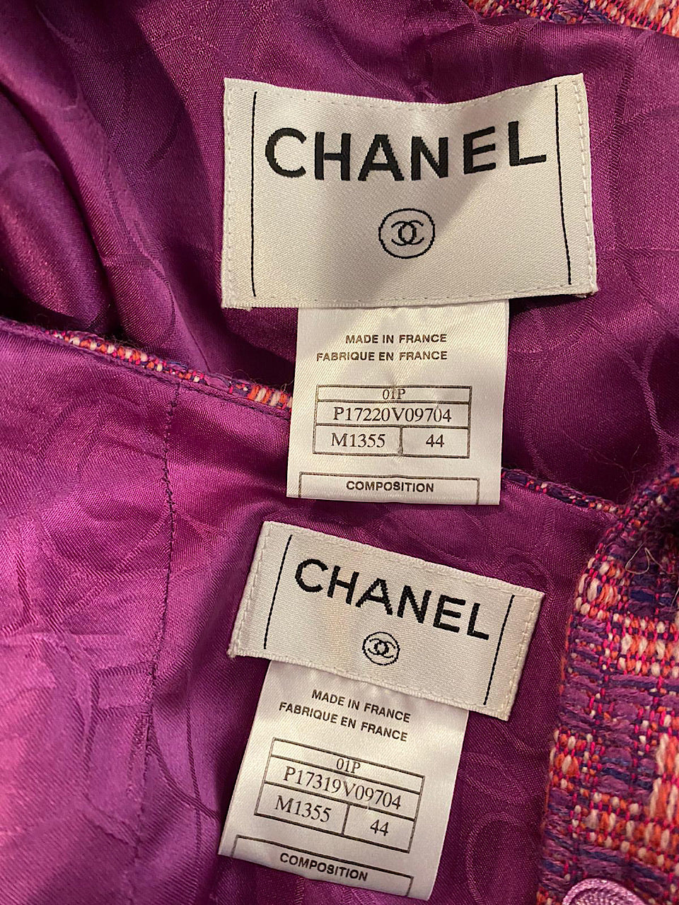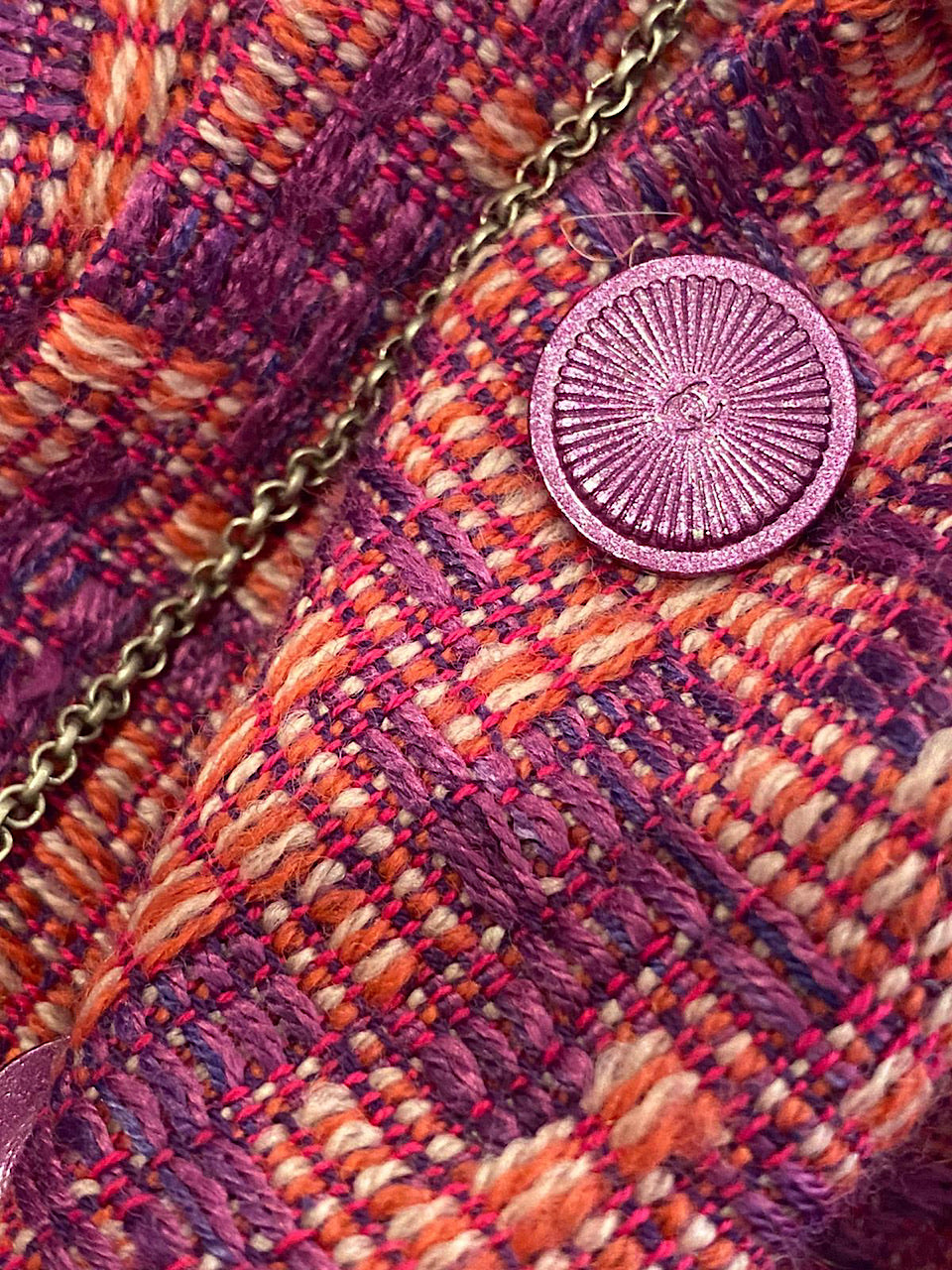 This jacket has Chanel's famous chain around the bottom to make sure it hangs evenly. There are flattering small shoulder pads. Closure is by 4 Chanel buttons with the CC logo in the center, there is a matching fabric belt that goes through fabric  belt loops. Skirt style is very flattering- with no waistband, hidden zipper in the back, A- line skirt with 3 decorative pleats starting 8" down from the waist, at the left front. This has a textured fabric of beautiful weave in shades of pink and wine colors.