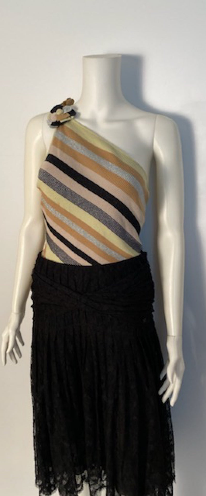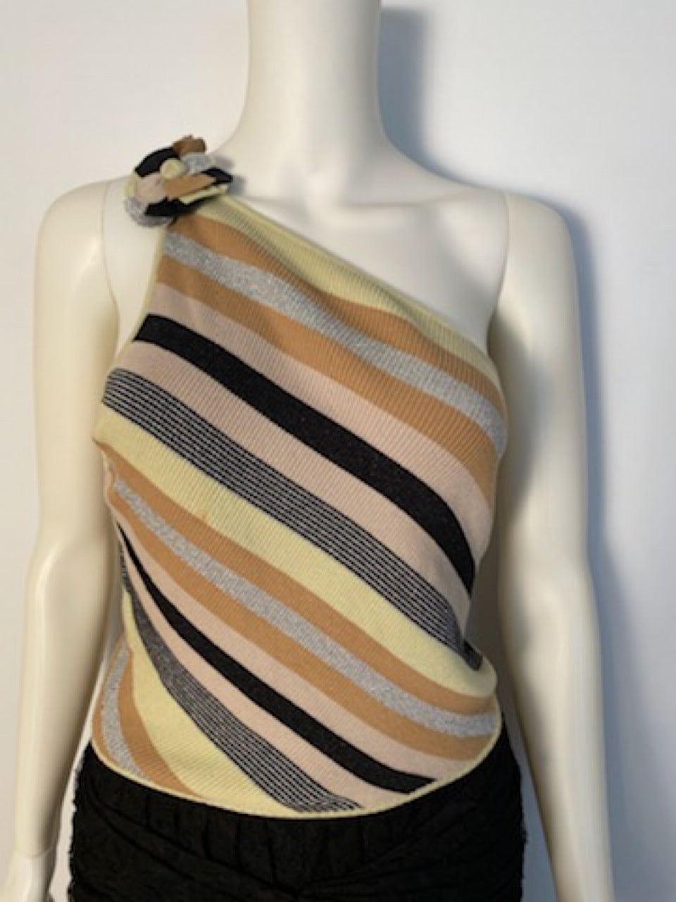 This is a flirty multicolor Chanel 01P, 2001 Spring Collection one/shoulder ribbed top.