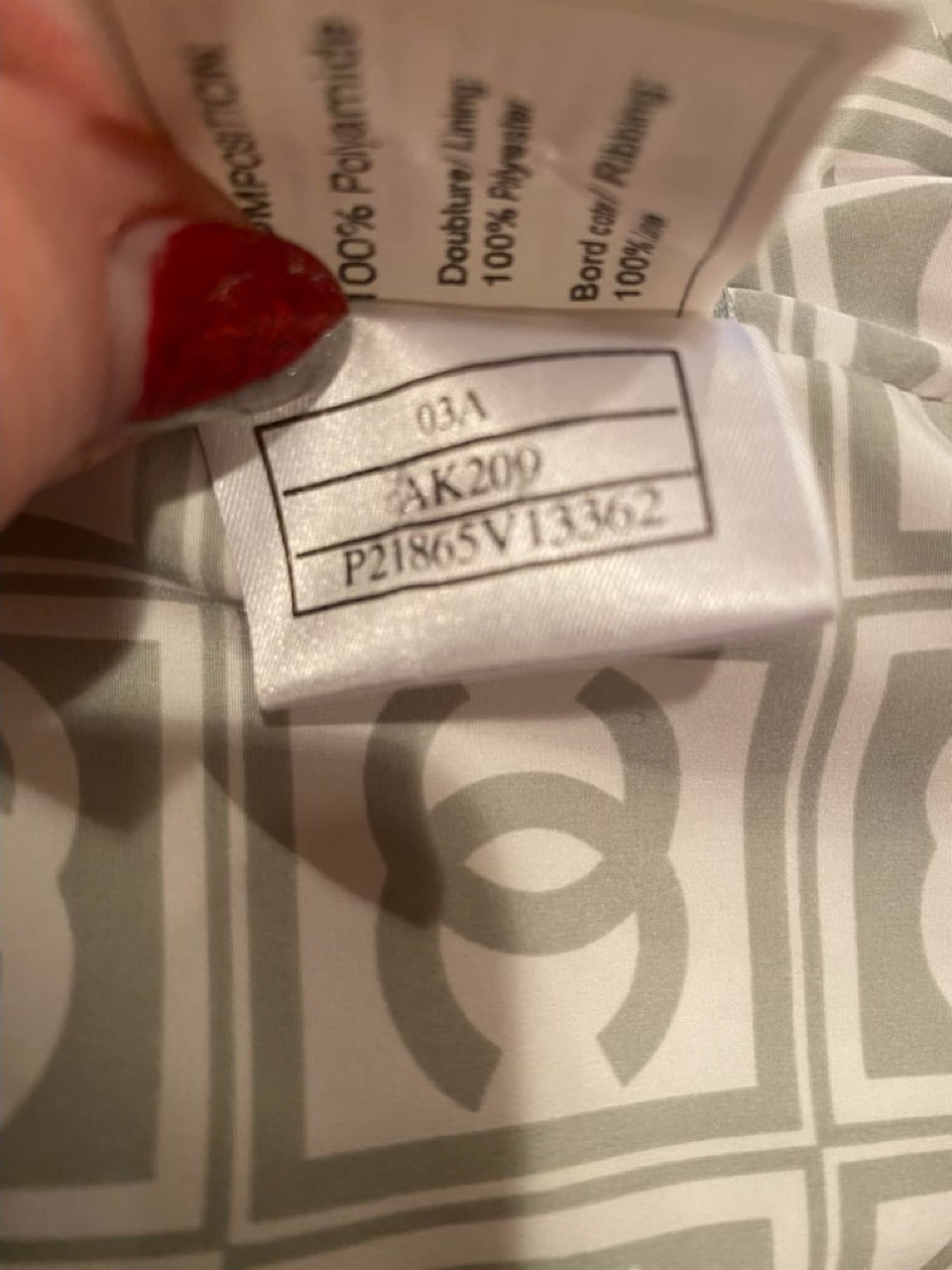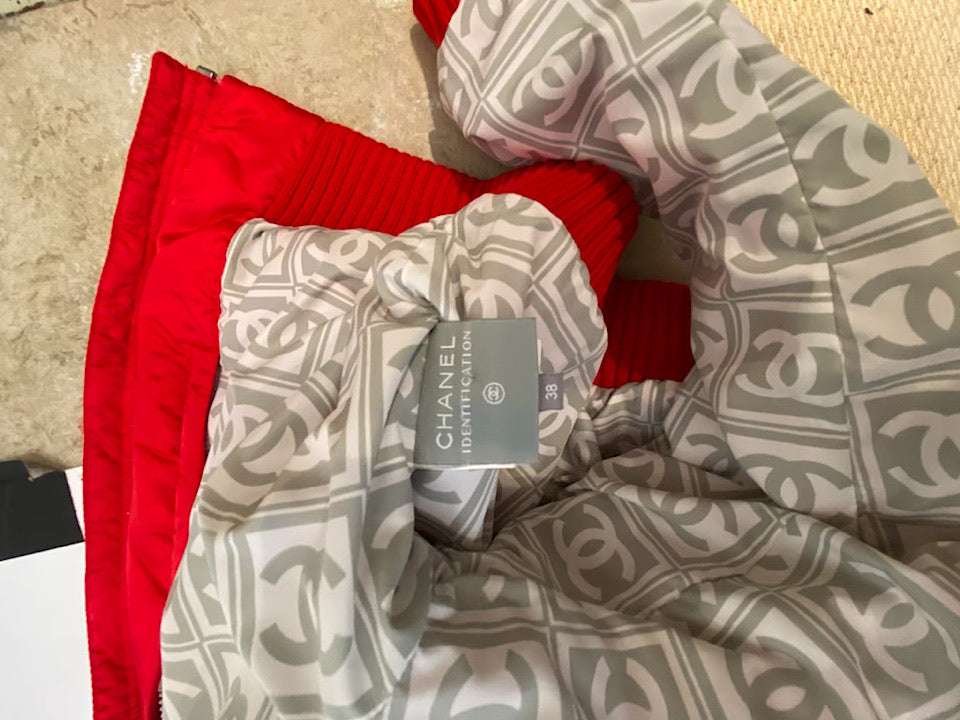 There are Chanel logos on the zipper pull and on the cord locks at the waist. There are 2 pockets near the waist, and a small one on the upper left arm. Although it may not be made to be reversible, it could also be worn inside out -see my pictures. The entire jacket would be covered with "CC" logos, and on the back is a huge logo, inside a 5 1/2" square. There Are also 2 pockets with zipper closures, when it is worn with the reverse style. Condition is excellent, shown with a wide Chanel belt, and Chanel jean pants, sold under “Shop All”.