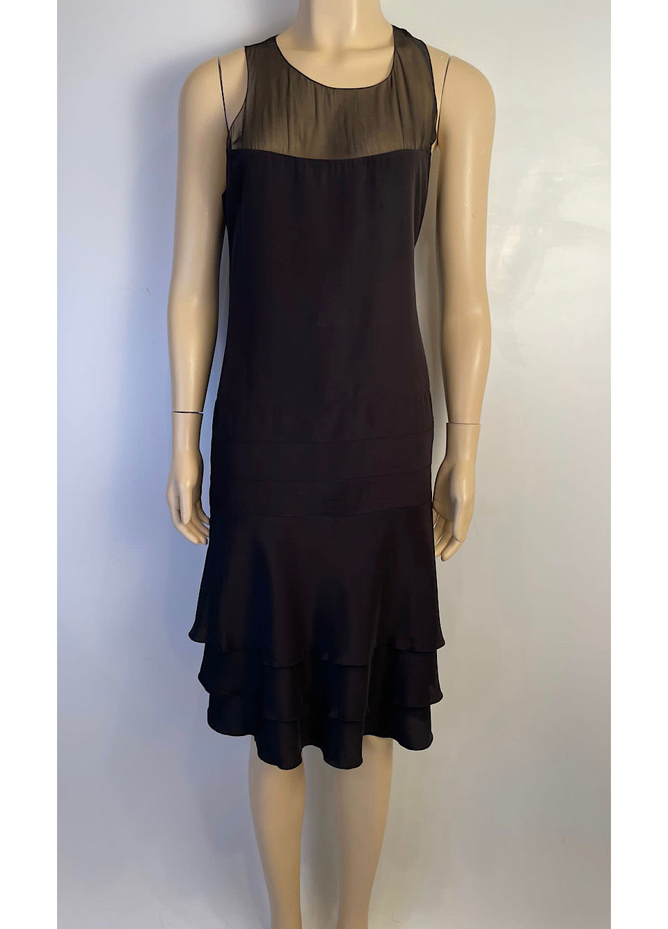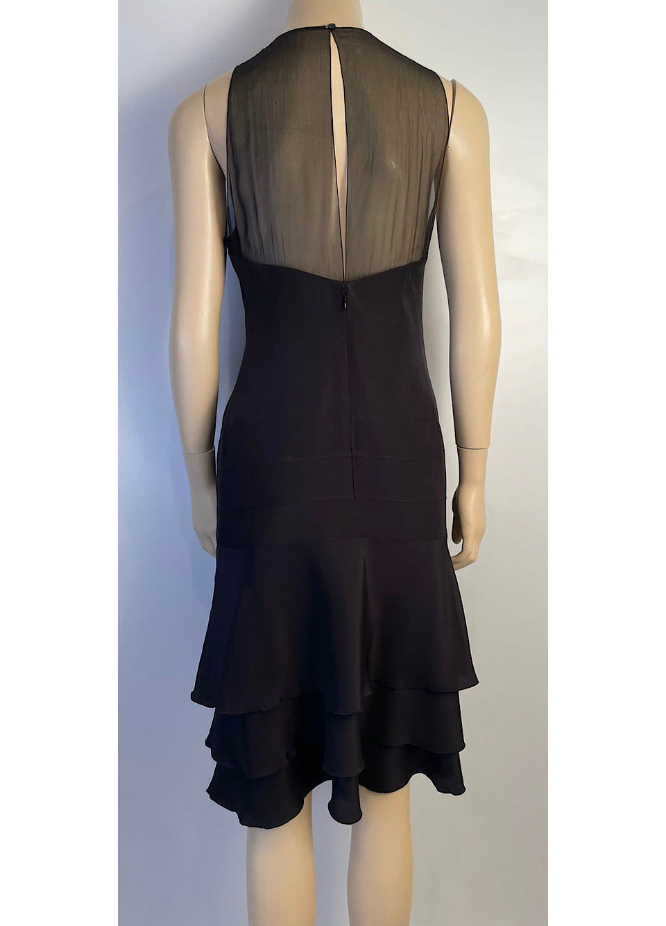 This dress is black, slightly heavy silk with a chiffon top, lined with more silk. It zips up the back with a hidden zipper. It buttons at the back of the neck where the chiffon is. There is a metal rectangle that says "Chanel" at the hip. There are 3 overlapping ruffles at the bottom, and 3 horizontal strips of fabric, each 3" wide across the hips. The chiffon at the back of the neck has an 11" long open space which looks like an exaggerated keyhole opening.