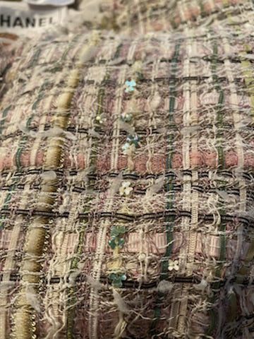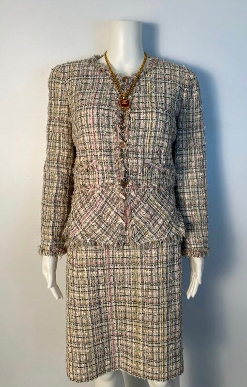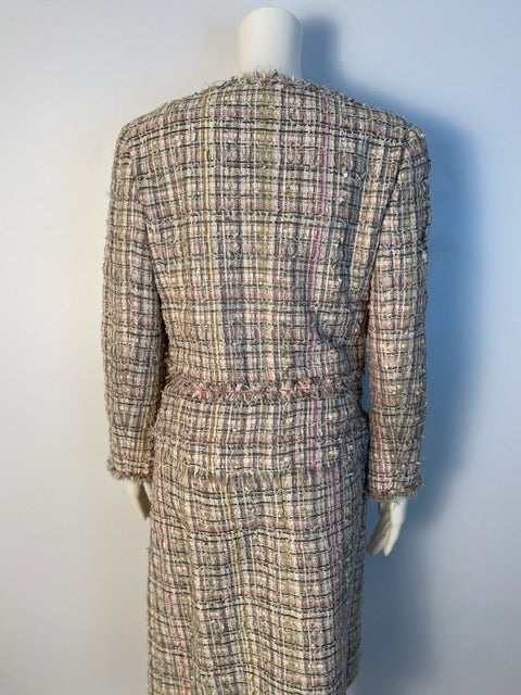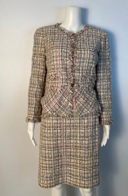 Vintage Chanel 05P, 2005 Spring multicolor pink and green fantasy tweed sequins skirt suit jacket set.