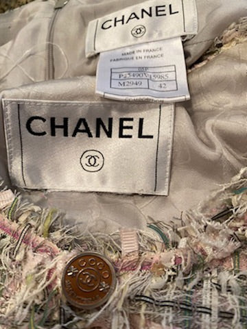 - Fastens with 4 metal Chanel buttons which say “Coco mademoiselle, CC logo, with 2 clovers”