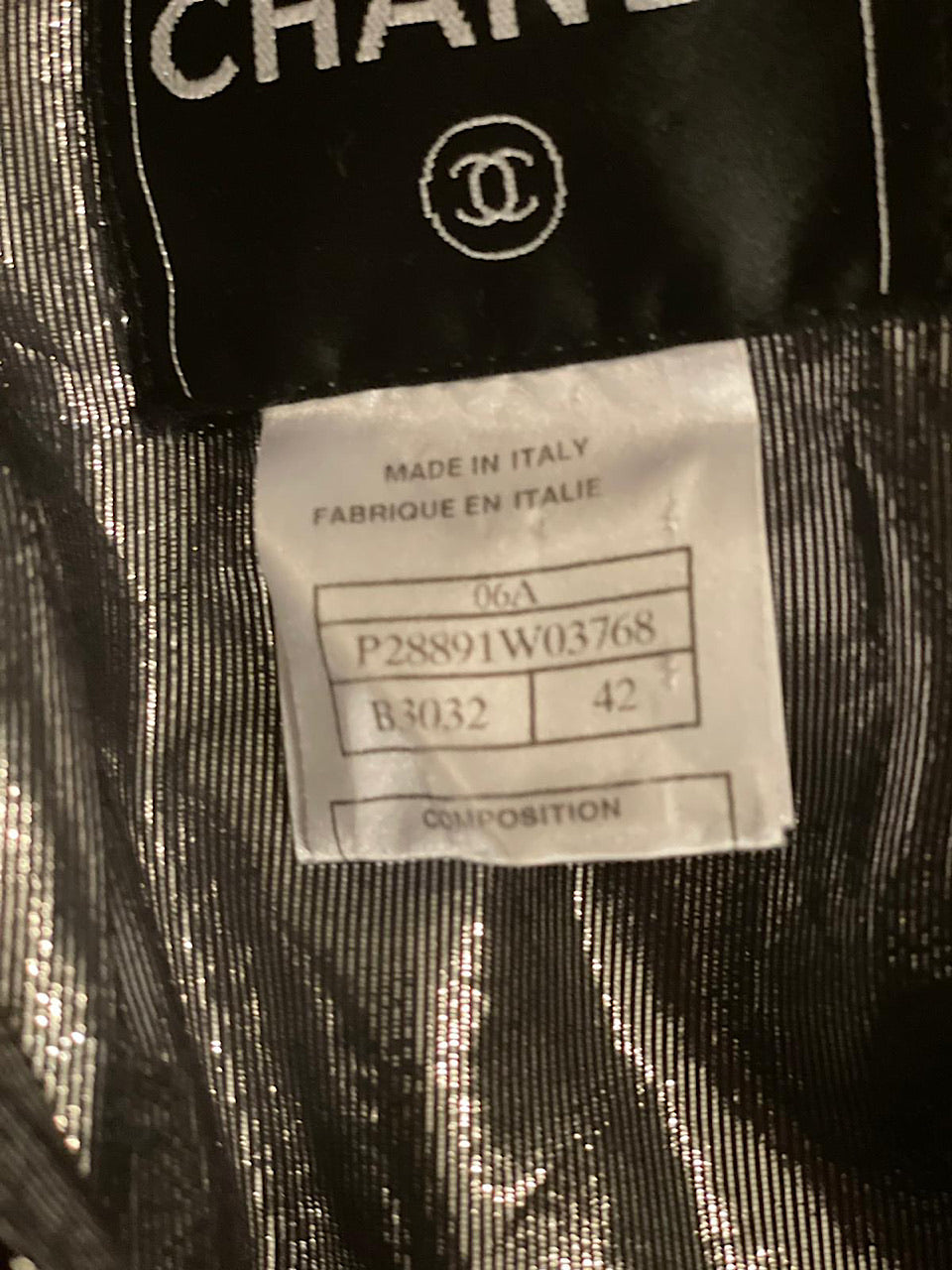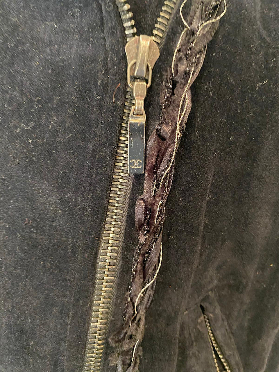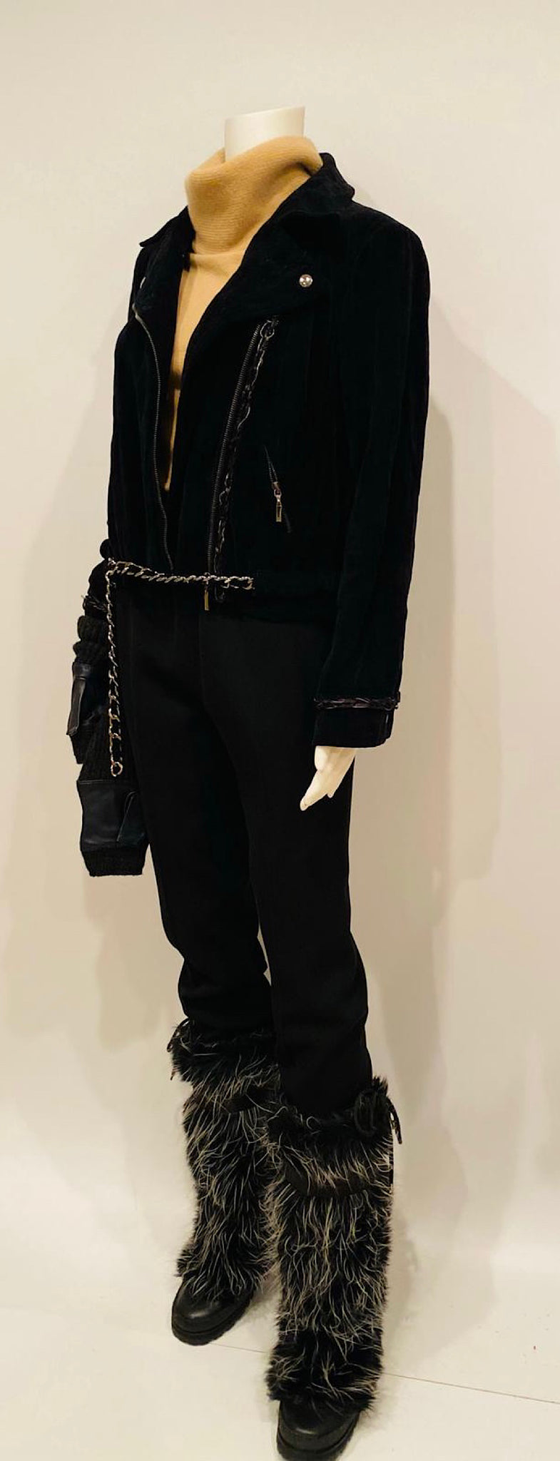 Chanel 06A 2006 Fall Collection black washedvelvet jacket with removable chain belt woven with heavy velvet. This collection has some pieces with the shiny lightweight fabric. In this jacket it is used as lining. There are 3 zipper pulls, each with a "CC" logo for closure, and for each of the two pockets on the jacket front. There are also 3 big silver decorative snaps with "Chanel Paris" around the rim. The heavy silver metal chain belt is woven with thick black velvet, having the effect of a chain but a lighter weight. It goes through two long 1" wide enclosed "tunnels" (like a rod pocket curtain) to hold the belt in place, around the bottom of the jacket. The front zipper from the bottom to the shoulder is 1/2” braid of black satin ribbon edged with thin shiny silver cording. It is all rather spectacular!