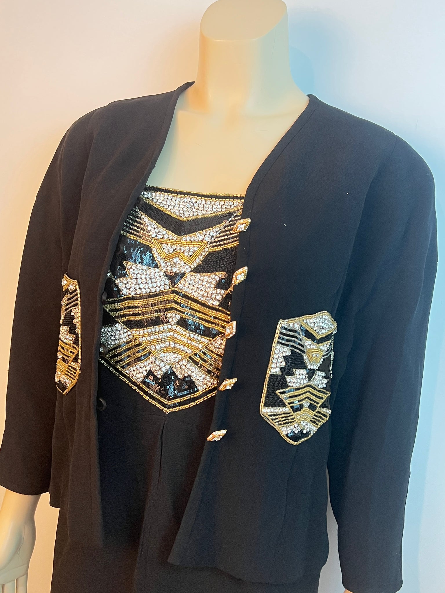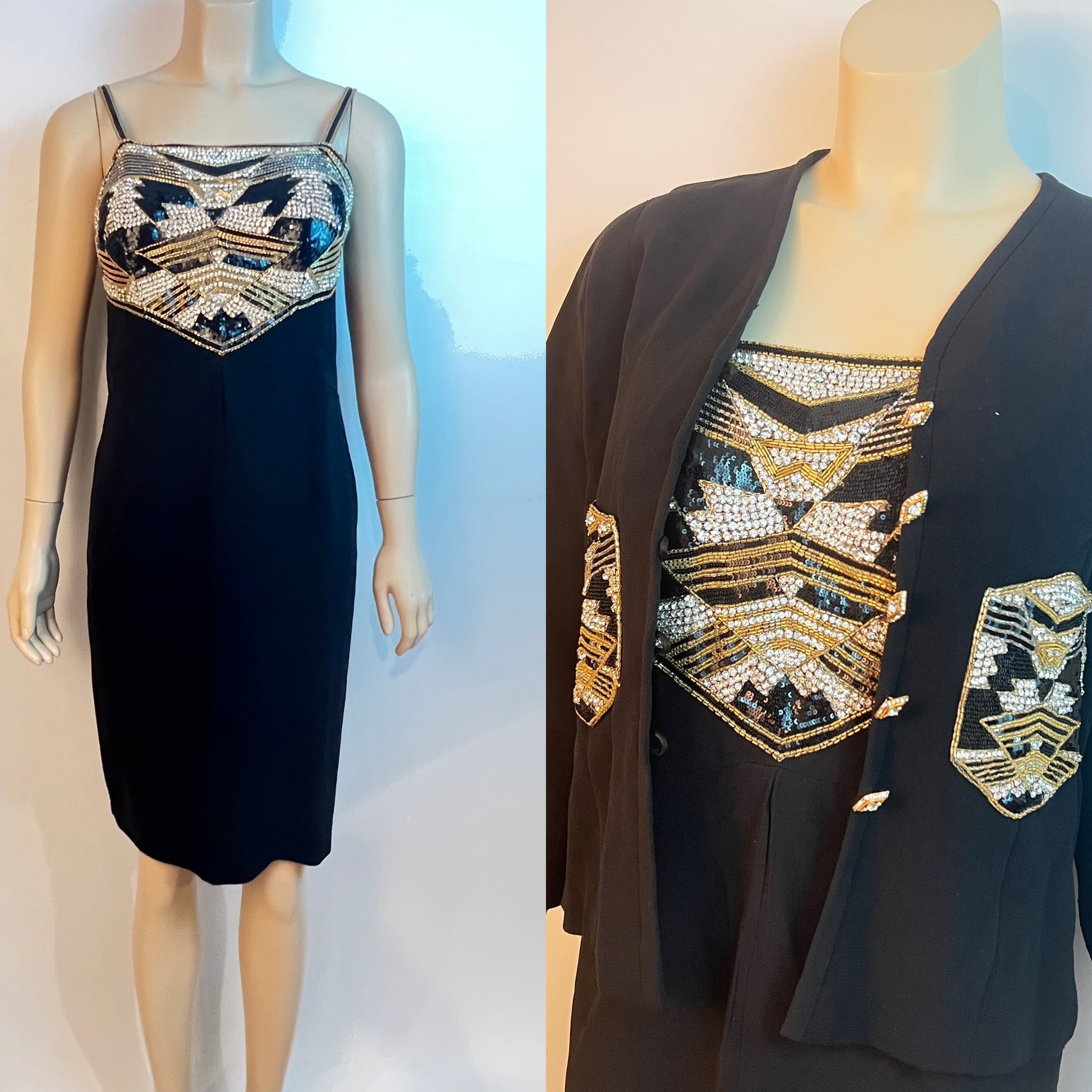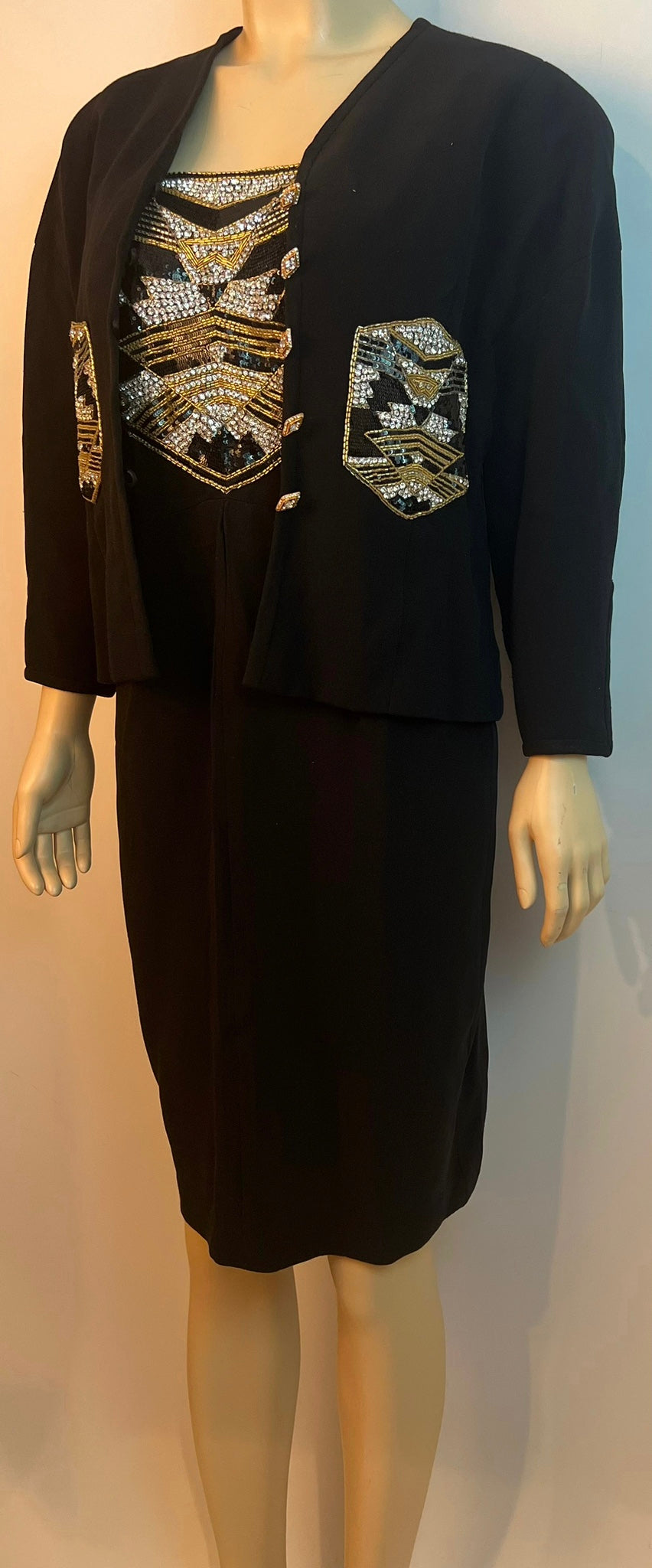 Rare Chanel 1985 Runway Haute Couture Crystal Embellished 2 Piece Dress Jacket Set