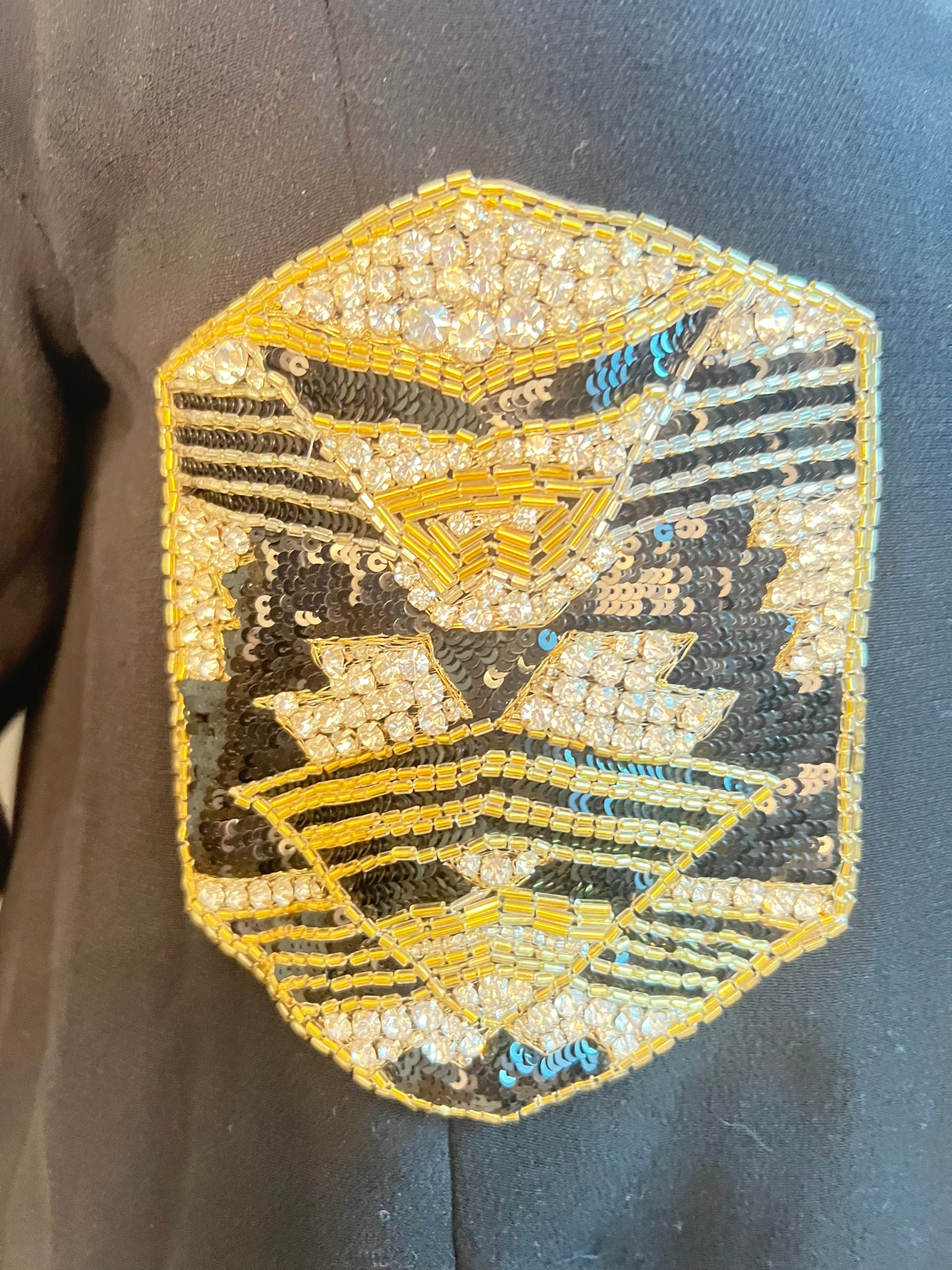 The jacket has the haute couture Chanel label with pointed ends. The buttons are crystal and gold. The two pockets on the front are still sewn shut. They are 5" by 5.5”, entirely covered with the crystal bugle beads etc that match the design on the bodice of the dress.