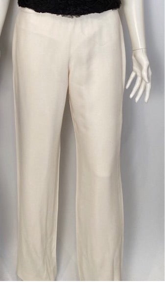 Vintage Chanel Ivory 03P, 2003 Spring collection low waist full legged pants. Fully lined with silk, hidden side zipper. Metal rectangle at the waist with “Chanel" imprint. Very versatile. They seem to go with everything. These pants are acetate and rayon, look and feel like crepe. Low waist, medium/slightly full legs, reinforced crotch.