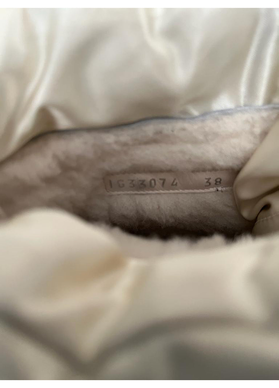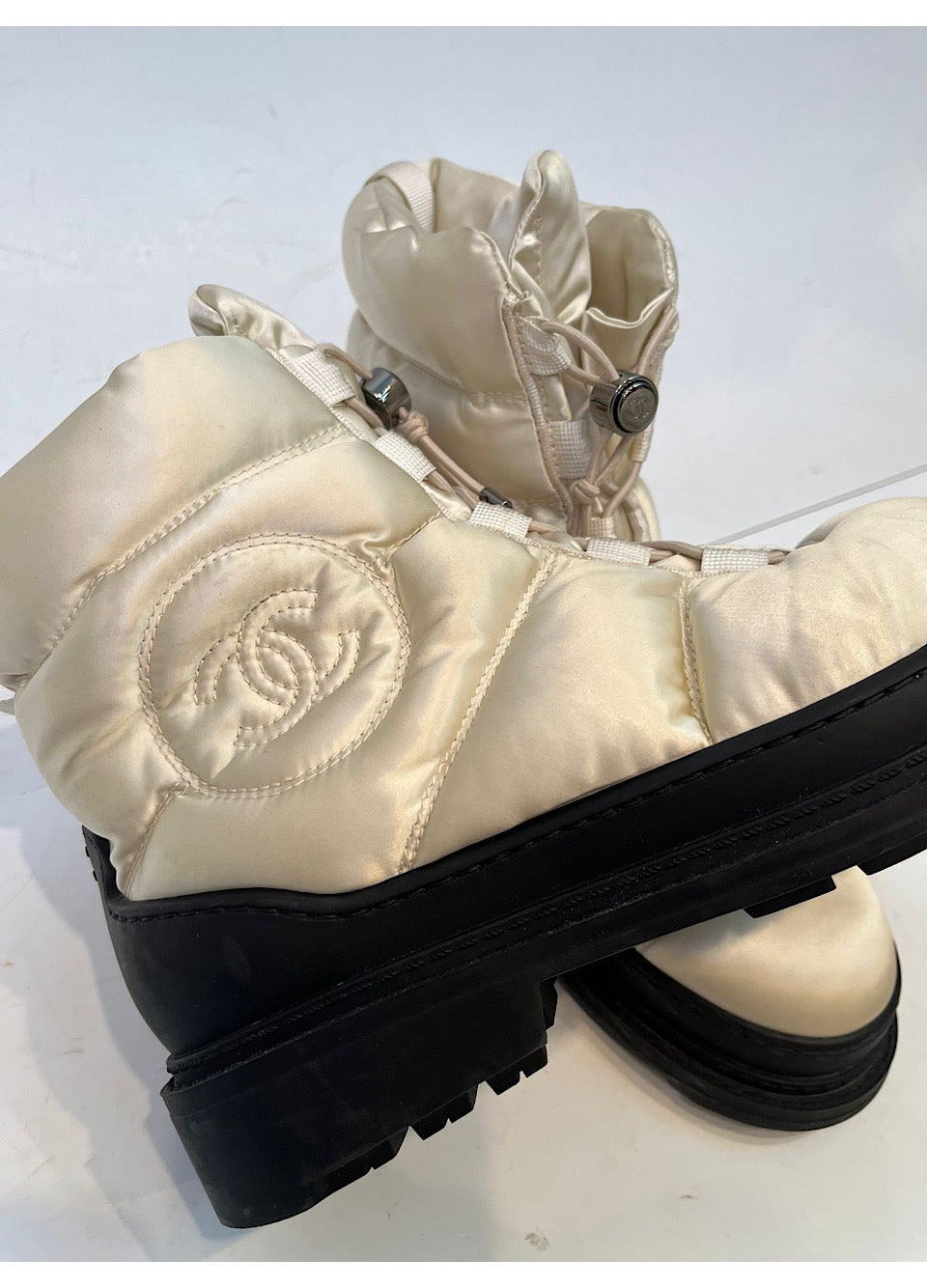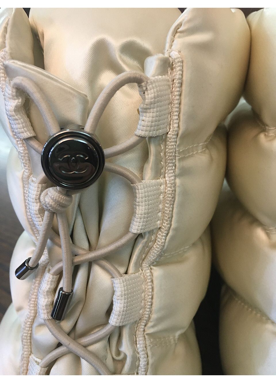 These Chanel boots are the real deal! They are heavy (over 2lbs each), down filled, warm, well made, lined with shearling, with heavy tread soles. The outside is nylon, divided by stitching into 6 down/filled sections. The inner lining is warm shearling. The soles are heavy treads of rubber, reaching from 1"-3" from the floor. They are easily identified as Chanel with a 2 1/2" circle containing a large CC logo on the outside of each boot. There is also a CC logo on the rubber portion of the back of the boot, and there is a Huge CC logo on the soles (3 1/3" by 2") and, finally, you will see a CC logo on the silver lace fastener.